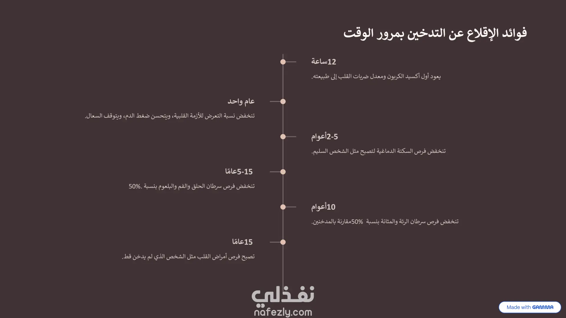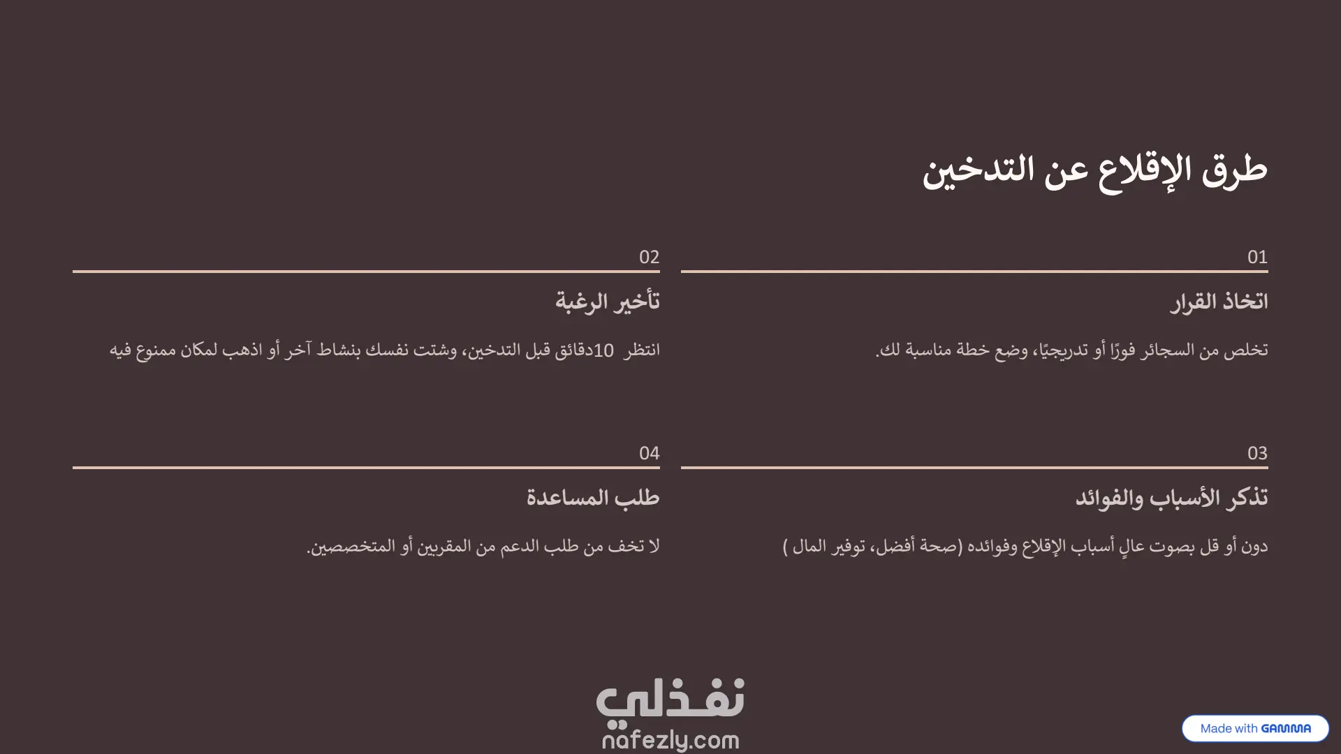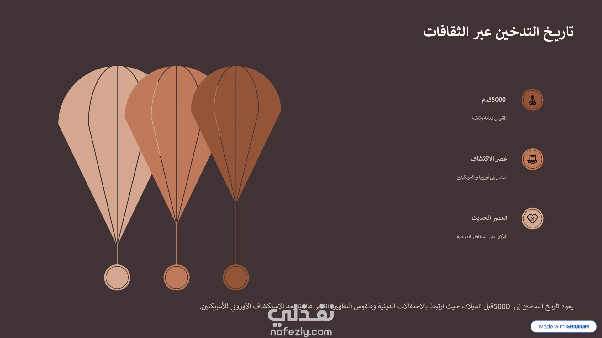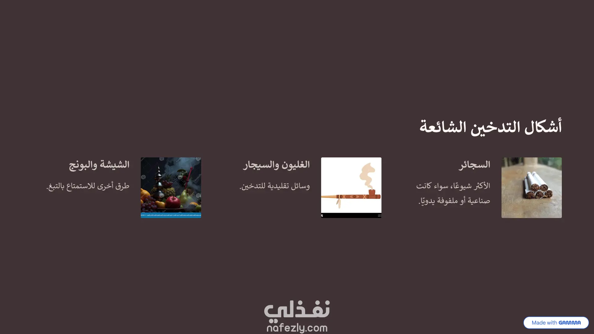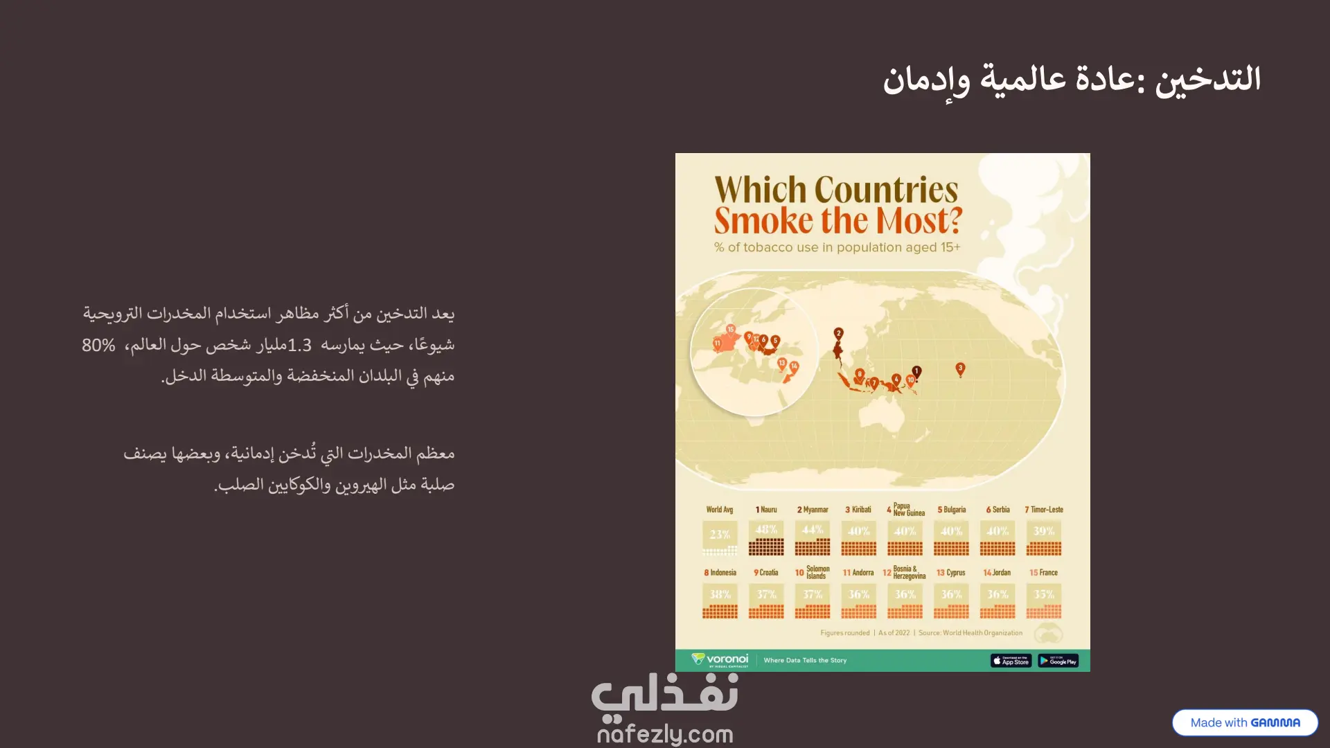 هذا العرض التقديمي هو نموذج ممتاز لكيفية دمج أدوات الذكاء الاصطناعي مع التعديل البشري لإنشاء محتوى بصري جذاب. طريقة الإنشاء (الذكاء الاصطناعي + التعديل اليدوي): تم بناء الأساس والهيكل التصميمي الأولي لهذا العرض باستخدام أداة الذكاء الاصطناعي "Gamma" ، وهو ما يتضح من العلامات المائية في أسفل الشرائح. بعد توليد المحتوى والتصميم المبدئي، تم تصدير العرض وتحسينه وتعديله يدوياً بالكامل داخل برنامج Microsoft PowerPoint. سمح هذا التعديل اليدوي بضبط النصوص، وتخصيص تدفق المعلومات، وإضافة اللمسات النهائية الدقيقة التي لا يمكن للذكاء الاصطناعي إتقانها بمفرده، مما يجعله خلفية بصرية مثالية ومجهزة بعناية التصميم والهوية البصرية: لوحة الألوان (Color Palette): يعتمد العرض على استخدام ديناميكي للألوان لخدمة السياق النفسي لكل شريحة: يبدأ بألوان هادئة ومحايدة مثل الأزرق الفاتح في المقدمة.ينتقل إلى ألوان ترابية دافئة (درجات البني والبيج المتدرج) عند استعراض الجانب التاريخي للتدخين .يعتمد على خلفيات داكنة جداً (الأسود والرمادي الغامق) عند الحديث عن الأضرار الصحية الجسيمة والسرطانات ، مما يضفي طابعاً من الجدية والتحذير البصري. التخطيط (Layout): التصميم عصري ونظيف جداً (Clean UI)، يعتمد على مساحات فارغة (White Space) مريحة للعين لتجنب تشتت الانتباه. يستخدم شبكات تنظيمية (Grids) وترقيماً متسلسلاً واضحاً (من 01 إلى 09 في جدول الأعمال والخطوات) العناصر البصرية: يبتعد العرض عن النصوص الكثيفة، ويستبدلها بصور فوتوغرافية عالية الجودة ، وأيقونات بسيطة، وعناصر إنفوجرافيك متقدمة (مثل خريطة التوزيع العالمي بنظام النقاط الملونة) ، مما يسهل استيعاب الإحصائيات المعقدة بسرعة.