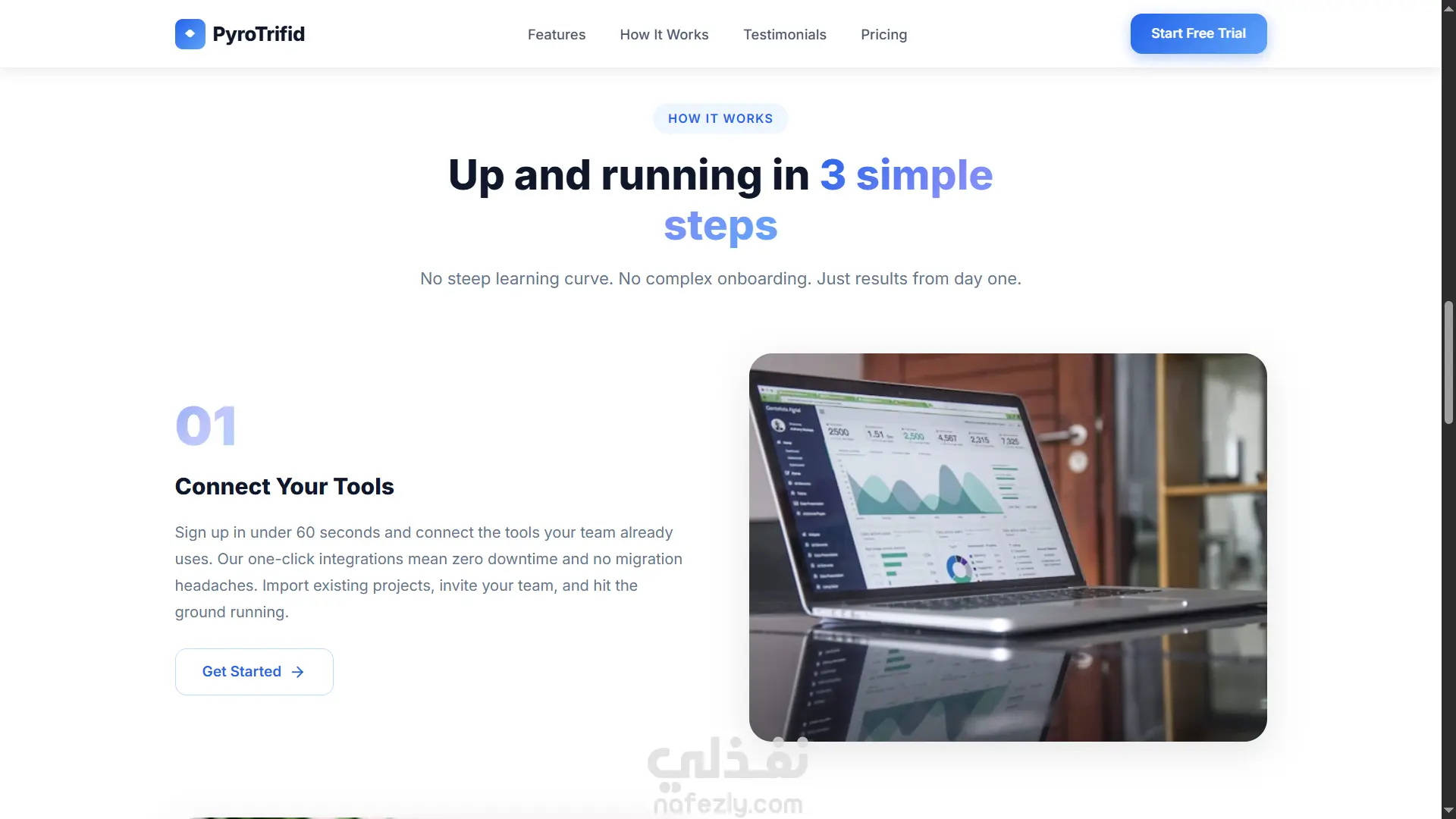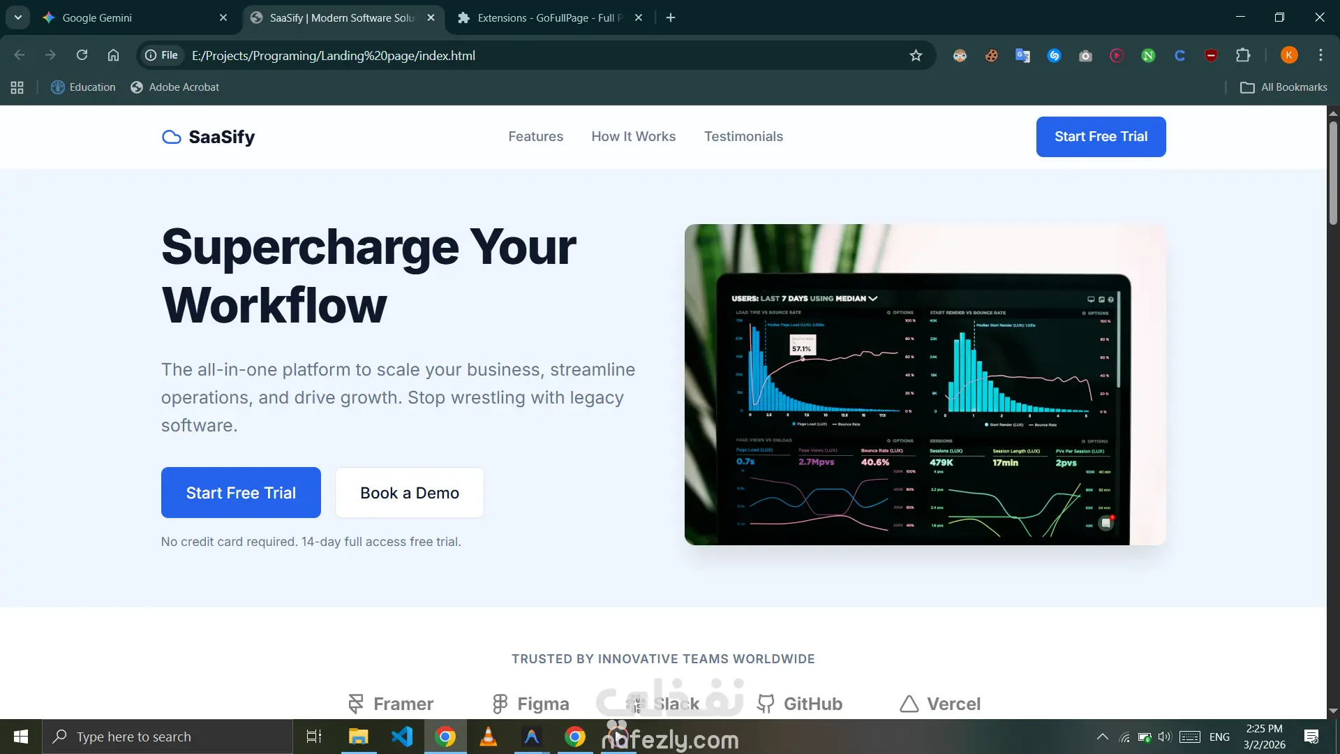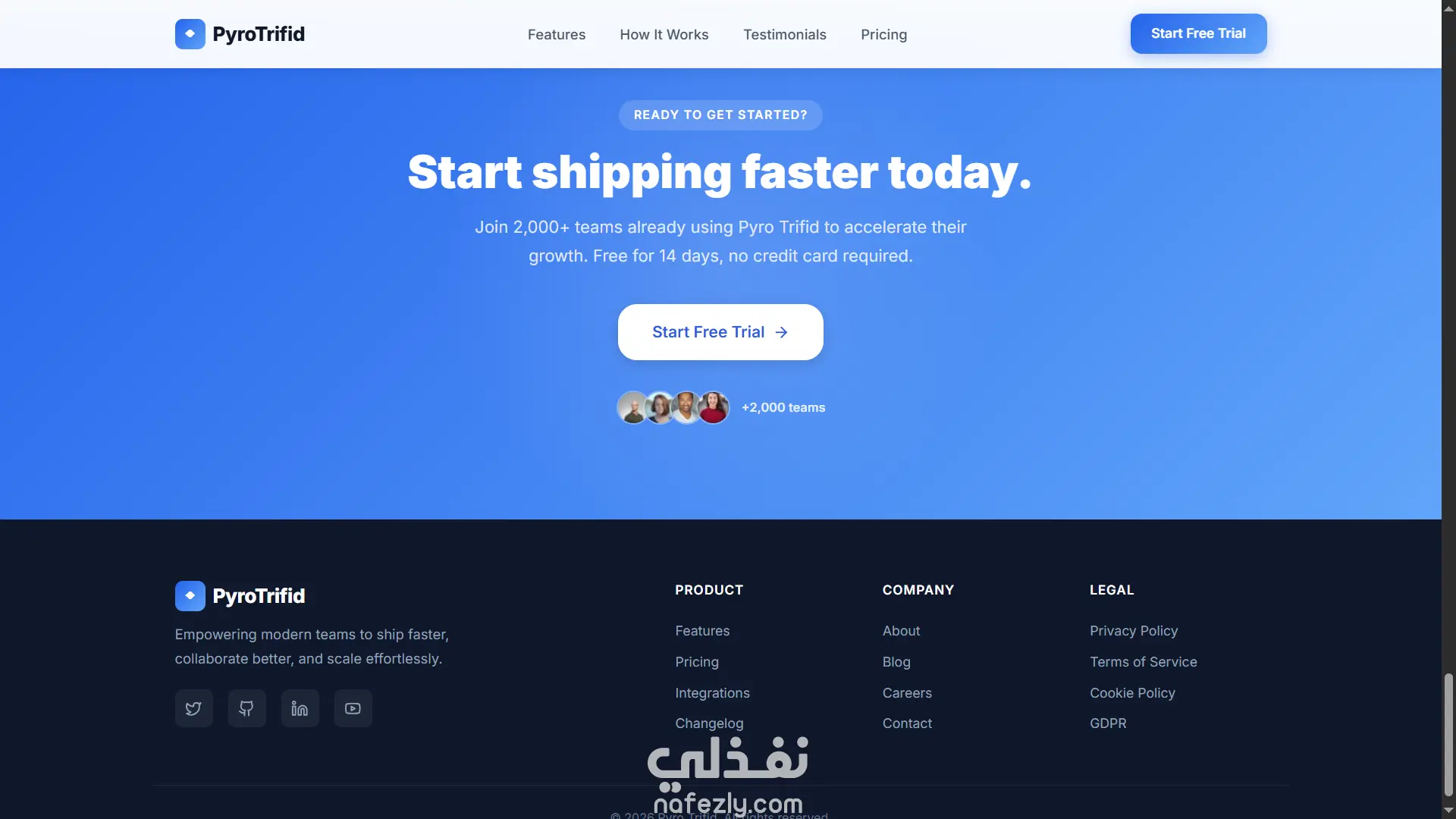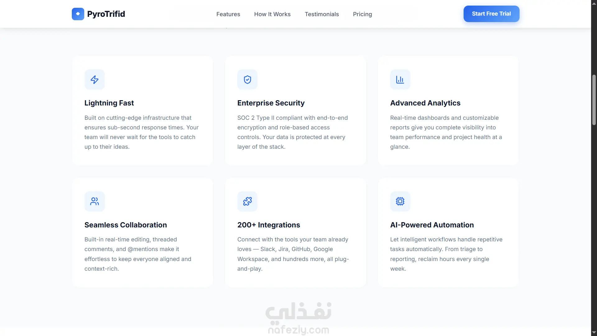 هذه الصفحة عبارة عن صفحة هبوط (Landing Page) عصرية ومصممة باحترافية لشركات الـ B2B SaaS (البرمجيات كخدمة). تعتمد على تصميم نظيف بخلفية بيضاء ورمادية فاتحة مع لمسات قوية من اللون الأزرق لتوجيه عين المستخدم نحو الإجراءات الرئيسية. إليك تفصيل لنوعها، وميزاتها، ونهج الـ "vibe coding" المستخدم في إنشائها: نوع صفحة الهبوط توليد العملاء المحتملين / التحويل لتجربة مجانية (Lead Generation / Trial Conversion): الهدف الأساسي لهذه الصفحة هو جذب المستخدمين الجدد. يتضح هذا من خلال أزرار "بدء التجربة المجانية" (Start Free Trial) البارزة والمتكررة في القسم الرئيسي (Hero Section)، وشريط التنقل (Navigation bar)، والقسم الأخير في أسفل الصفحة. أهم الميزات وهيكل الصفحة القسم الرئيسي (Hero Section): يتميز بعنوان رئيسي جذاب يركز على الفوائد ("Ship Faster. Scale Smarter. Grow Effortlessly.")، وعنوان فرعي موجز، وزرين للحث على اتخاذ إجراء (CTA) (زر للتجربة المجانية وزر ثانوي لـ "مشاهدة العرض التوضيحي") إلى جانب صورة تعبر عن بيئة العمل. الدليل الاجتماعي (Social Proof): شريط أسفل القسم الرئيسي مباشرة يعرض شعارات لشركات موثوقة لبناء المصداقية الفورية. شبكة الميزات (Features Grid): شبكة منظمة (3×2) تسلط الضوء على القدرات الأساسية مثل: السرعة الفائقة، أمان الشركات، التحليلات المتقدمة، التعاون السلس، أكثر من 100 تكامل، وسير العمل الآلي. تستخدم أيقونات واضحة وأوصافاً موجزة لتسهيل القراءة السريعة. قسم "كيف يعمل" (How It Works): تصميم متعرج (Zigzag) من 3 خطوات يشرح رحلة المستخدم ("ربط أدواتك"، "أتمتة سير العمل"، "التوسع والنمو"). يربط هذا القسم بفعالية بين النصوص التوضيحية والصور الملائمة لواجهة المستخدم. الآراء والتقييمات (Testimonials): قسم بعنوان "Loved by teams worldwide" يعرض ثلاث بطاقات لاقتباسات من المستخدمين. تم تمييز البطاقة الوسطى باللون الأزرق الأساسي للعلامة التجارية لجذب الانتباه إلى التعليقات الإيجابية. النداء الأخير لاتخاذ إجراء والفوتر (Final CTA & Footer): شريط أزرق عريض في الأسفل يعزز القيمة المقدمة ("ابدأ الشحن بشكل أسرع اليوم") كدفعة أخيرة للتحويل، يليه تذييل (Footer) قياسي وشامل يحتوي على الروابط ومعلومات الشركة. رابط العمل : pyrotrified.netlify.app