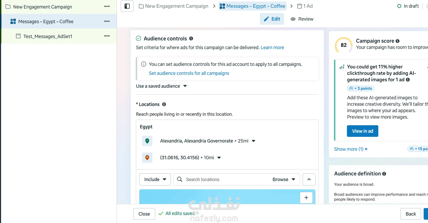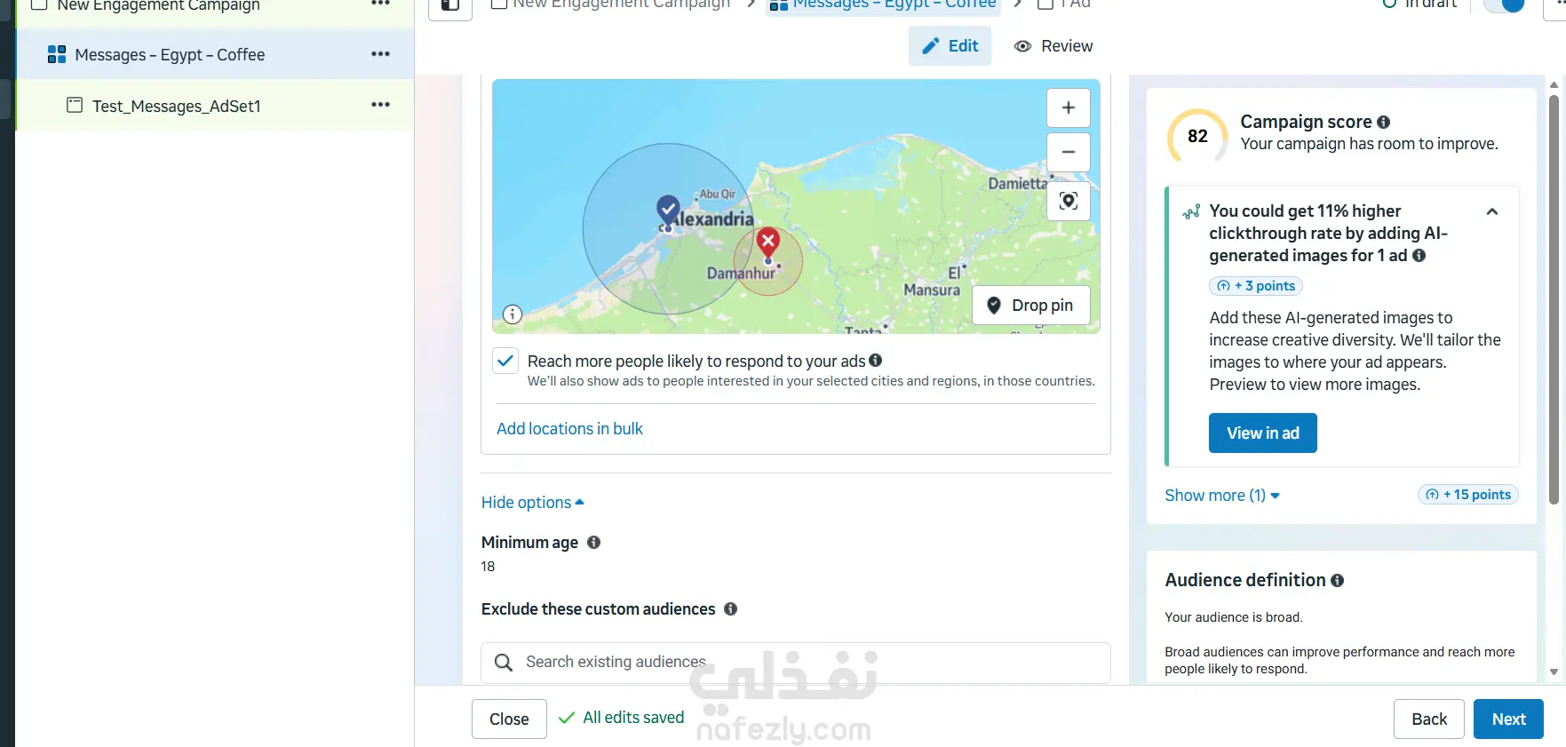 هذا العمل هو نموذج تطبيقي لحملة إعلانية تم إعدادها كجزء من التدريب في مجال التسويق الإلكتروني. يوضح المثال كيفية التخطيط لحملة إعلانية لكافيه أونلاين يقدم القهوة وخدمة التوصيل داخل الإسكندرية. تضمن العمل تحديد الهدف الإعلاني المناسب وهو زيادة التفاعل عبر الرسائل، بالإضافة إلى تحديد الجمهور المستهدف من حيث الموقع الجغرافي والعمر والاهتمامات، ووضع ميزانية يومية للحملة. كما شمل العمل كتابة النص الإعلاني واختيار نوع الإعلان والمنصات المناسبة (فيسبوك وإنستجرام) مع تحديد زر الدعوة لاتخاذ إجراء "إرسال رسالة" بهدف تشجيع العملاء على التواصل والاستفسار عن المنتجات.