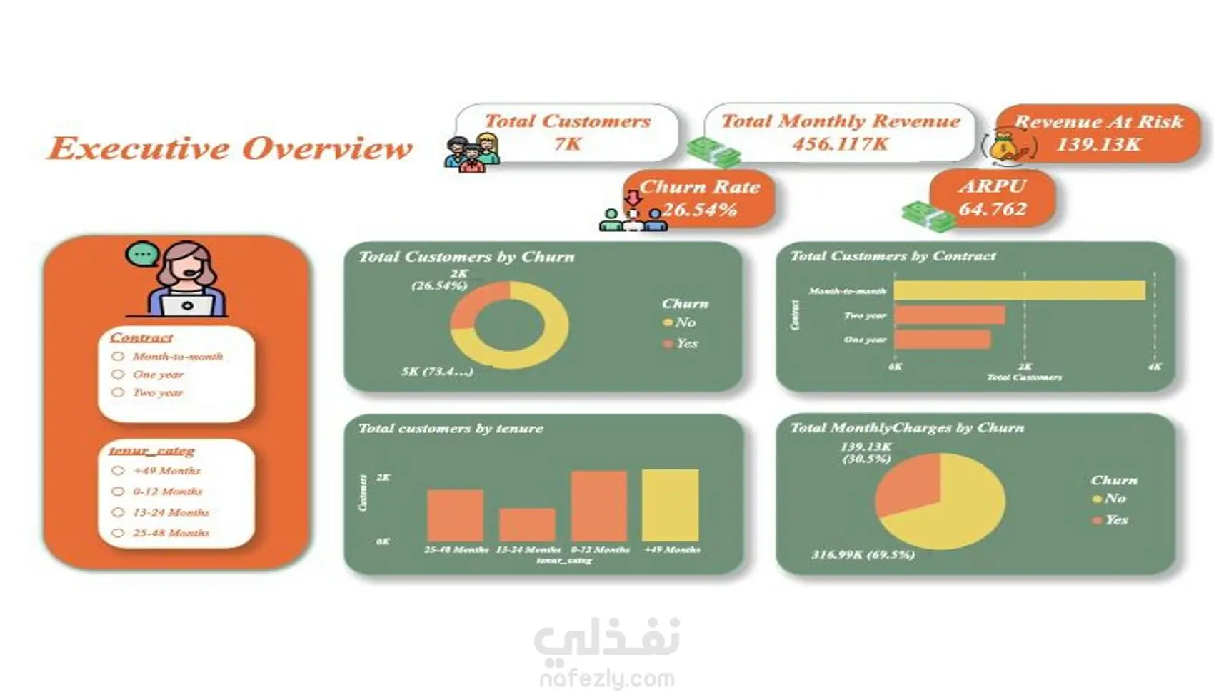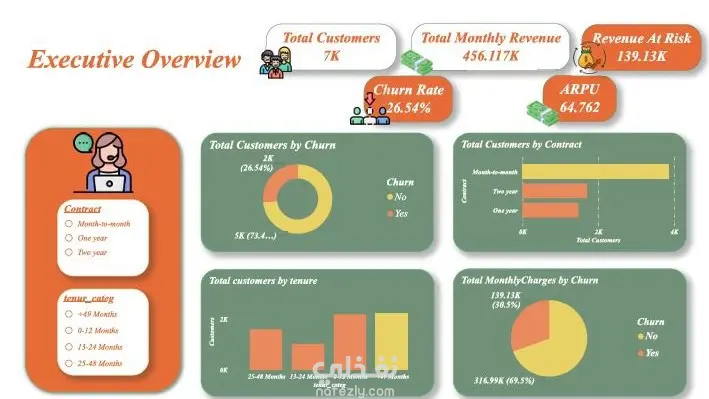في هذا المشروع قمت بتحليل بيانات عملاء شركة اتصالات بهدف فهم أسباب تراجع العملاء (Churn) واكتشاف العوامل التي تؤثر على قرار العميل بترك الخدمة. الهدف من التحليل هو مساعدة الشركة على تحسين استراتيجيات الاحتفاظ بالعملاء وتقليل معدل التراجع. بدأ العمل بمرحلة تنظيف البيانات ومعالجتها للتأكد من دقتها والتعامل مع القيم المفقودة وتحويل المتغيرات الفئوية إلى صيغة مناسبة للتحليل. بعد ذلك قمت بإجراء تحليل استكشافي للبيانات (EDA) لدراسة سلوك العملاء والعلاقة بين الخصائص المختلفة ومعدل التراجع. شمل التحليل دراسة عدة عوامل مثل نوع العقد، مدة الاشتراك، الخدمات المشترك بها، والرسوم الشهرية، بالإضافة إلى تحليل توزيع العملاء واكتشاف الأنماط المرتبطة بترك الخدمة. كما تم استخدام الرسوم البيانية ولوحات المعلومات التفاعلية لعرض النتائج بطريقة واضحة تسهّل فهم البيانات واتخاذ القرارات. كما تم تطبيق بعض نماذج تعلم الآلة للتنبؤ باحتمالية تراجع العميل، مما يساعد الشركات على تحديد العملاء الأكثر عرضة للمغادرة واتخاذ إجراءات استباقية للحفاظ عليهم.