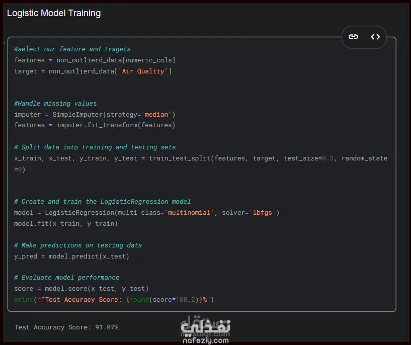 يهدف هذا المشروع إلى تطوير تطبيق ويب تفاعلي للتنبؤ بمستويات تلوث الهواء اعتمادًا على نماذج تعلم الآلة المدربة مسبقًا. يتيح التطبيق للمستخدم إدخال مجموعة من المتغيرات البيئية، ليقوم النموذج بتحليلها والتنبؤ بمستوى جودة الهواء بشكل فوري. تم بناء التطبيق باستخدام Streamlit لتوفير واجهة استخدام بسيطة وسريعة، مما يسمح بعرض النتائج بطريقة واضحة تدعم فهم حالة التلوث واتخاذ قرارات مبنية على البيانات. يعتمد النظام على نموذج تعلم آلي مدرب على بيانات بيئية حقيقية، ما يضمن دقة التنبؤ وكفاءة الأداء. يمكن استخدام هذا التطبيق في مجالات متعددة مثل مراقبة البيئة، المدن الذكية، التحليل البيئي، ودعم الجهات المعنية في تقييم جودة الهواء. التقنيات المستخدمة: Python Machine Learning Streamlit Data Analysis Model Deployment يعكس هذا المشروع قدرتي على تحويل نماذج تعلم الآلة إلى تطبيقات عملية تفاعلية قابلة للاستخدام الفعلي من قبل المستخدمين.