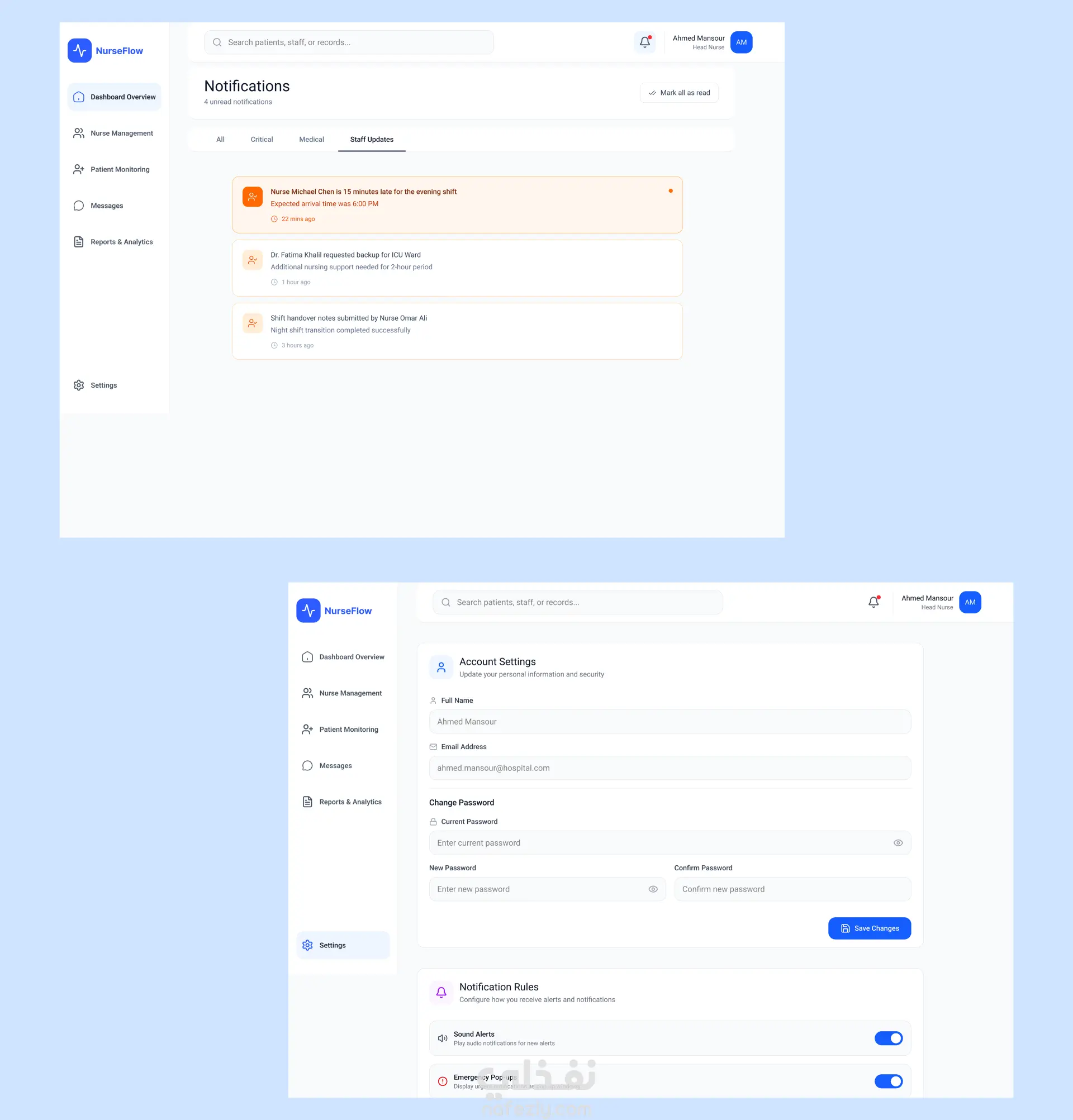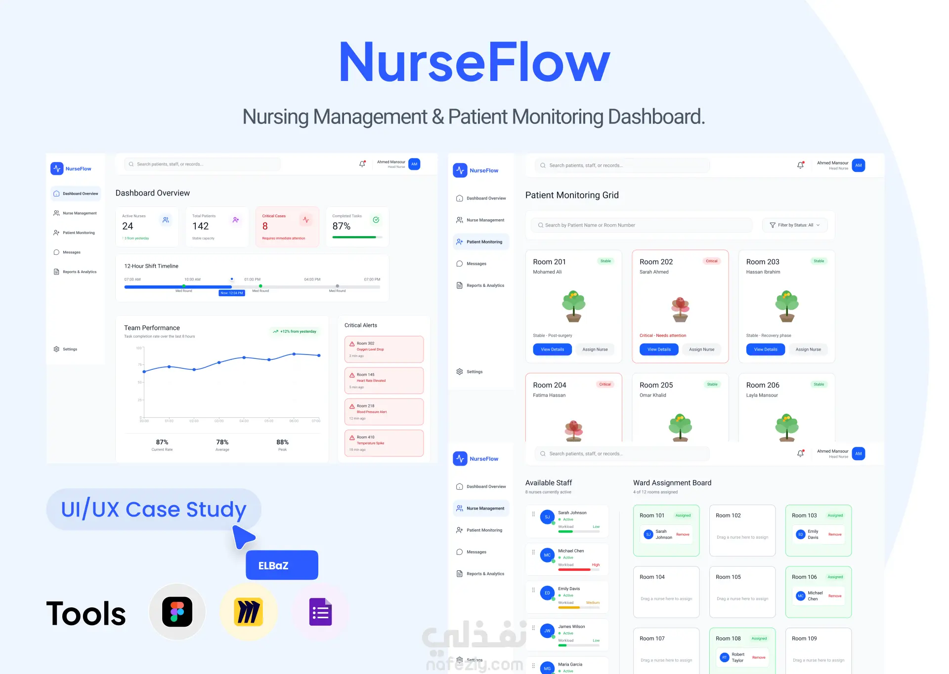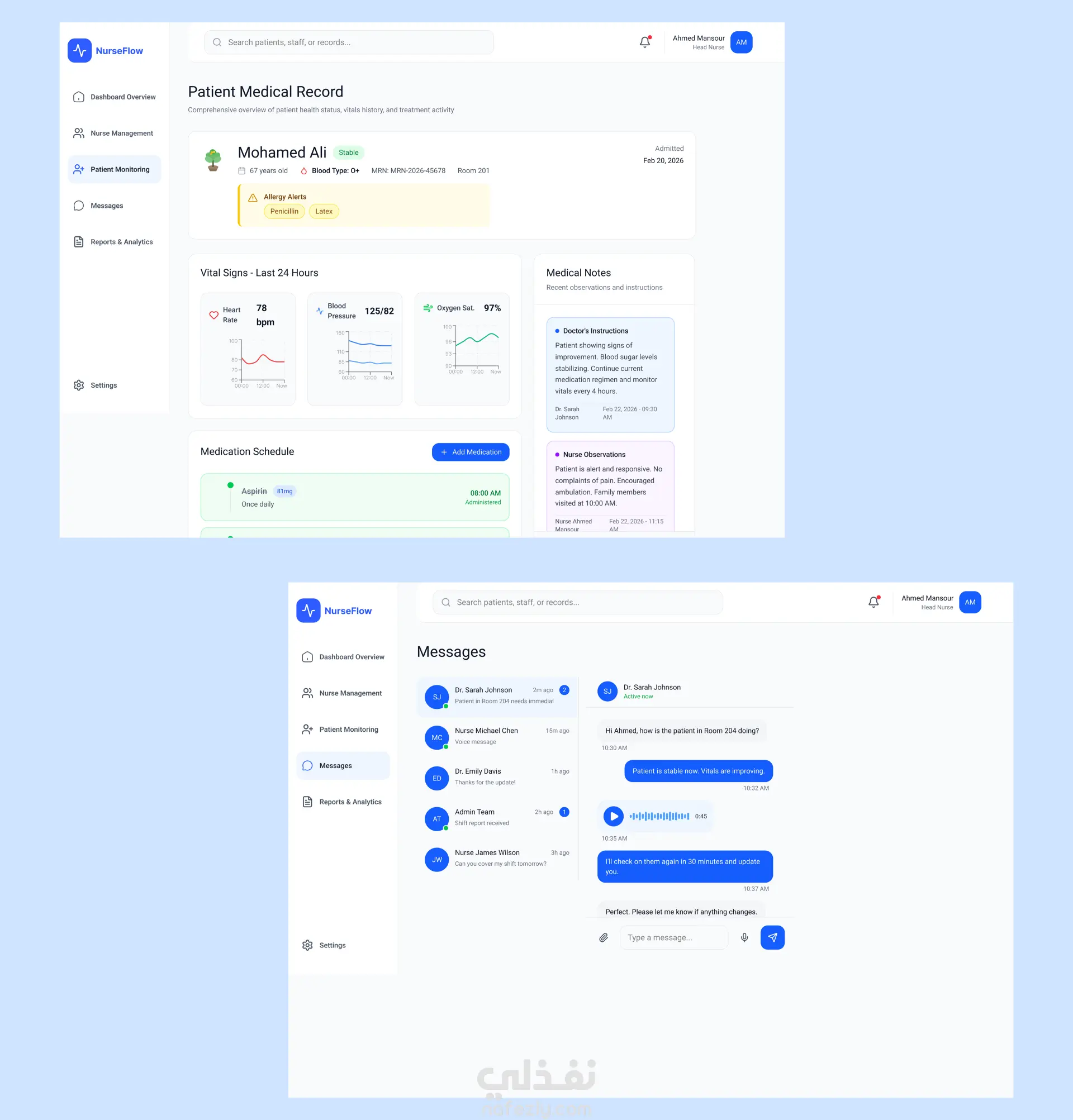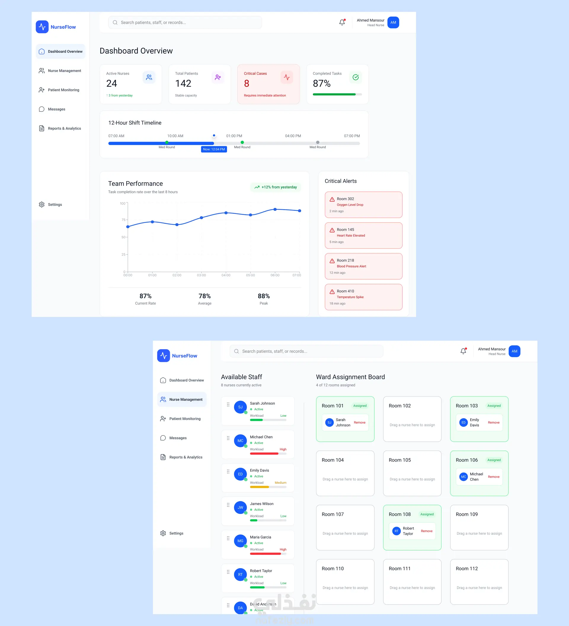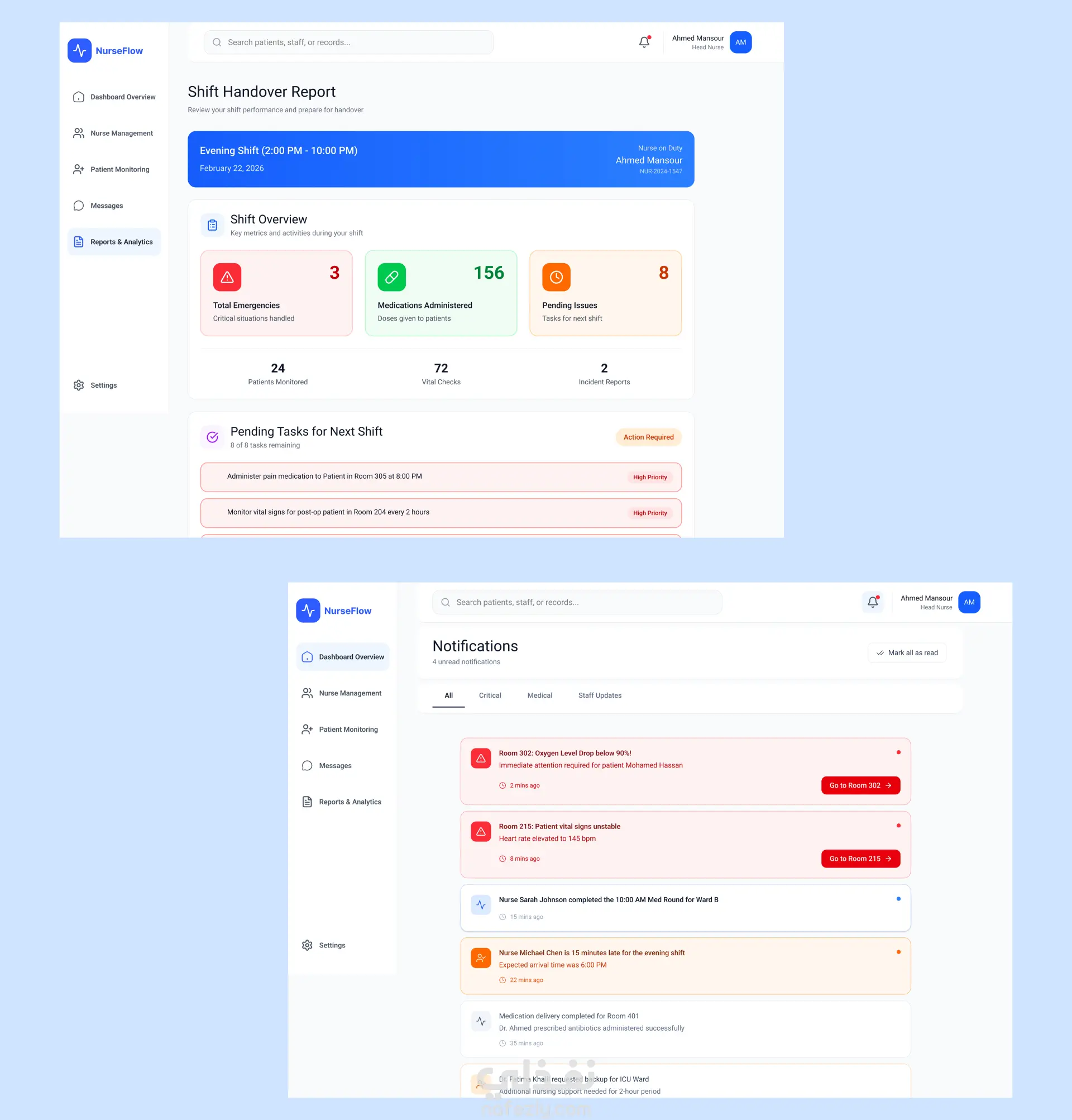 مشروع NurseFlow هو لوحة تحكم إدارية (Dashboard) مصممة خصيصاً للمستشفيات، تهدف إلى تنظيم عمل طاقم التمريض وضمان سلامة المرضى من خلال واجهات بديهية.