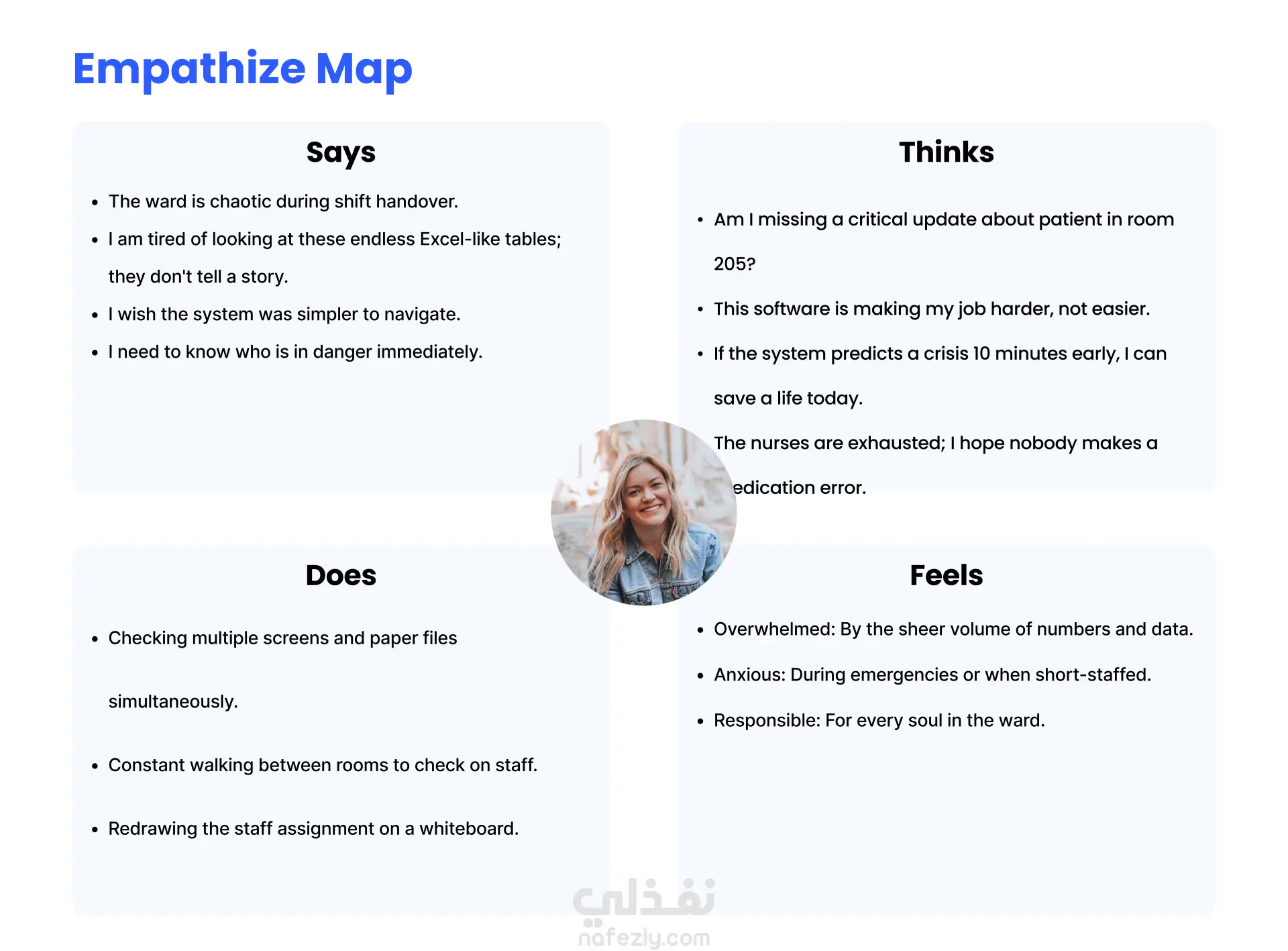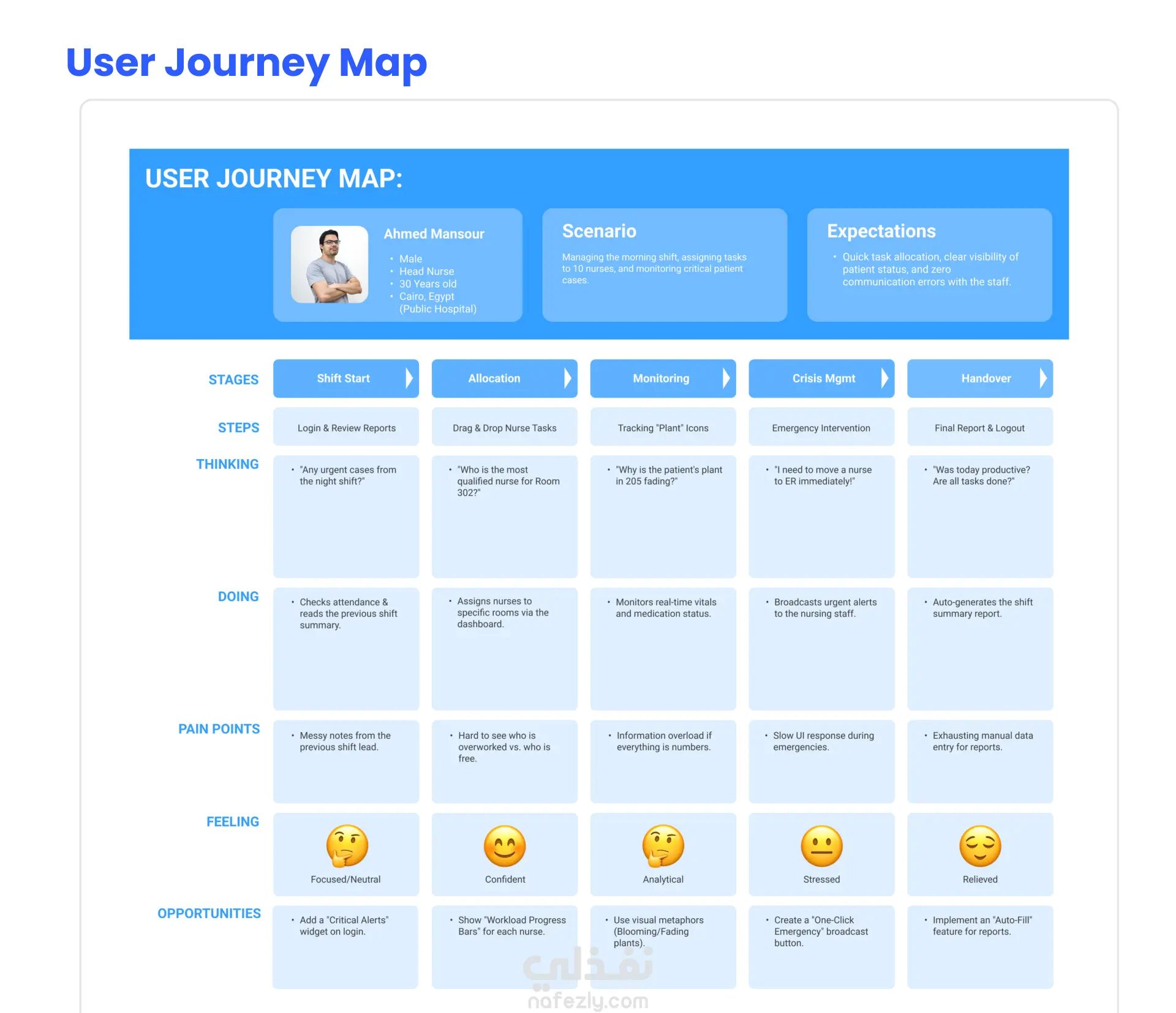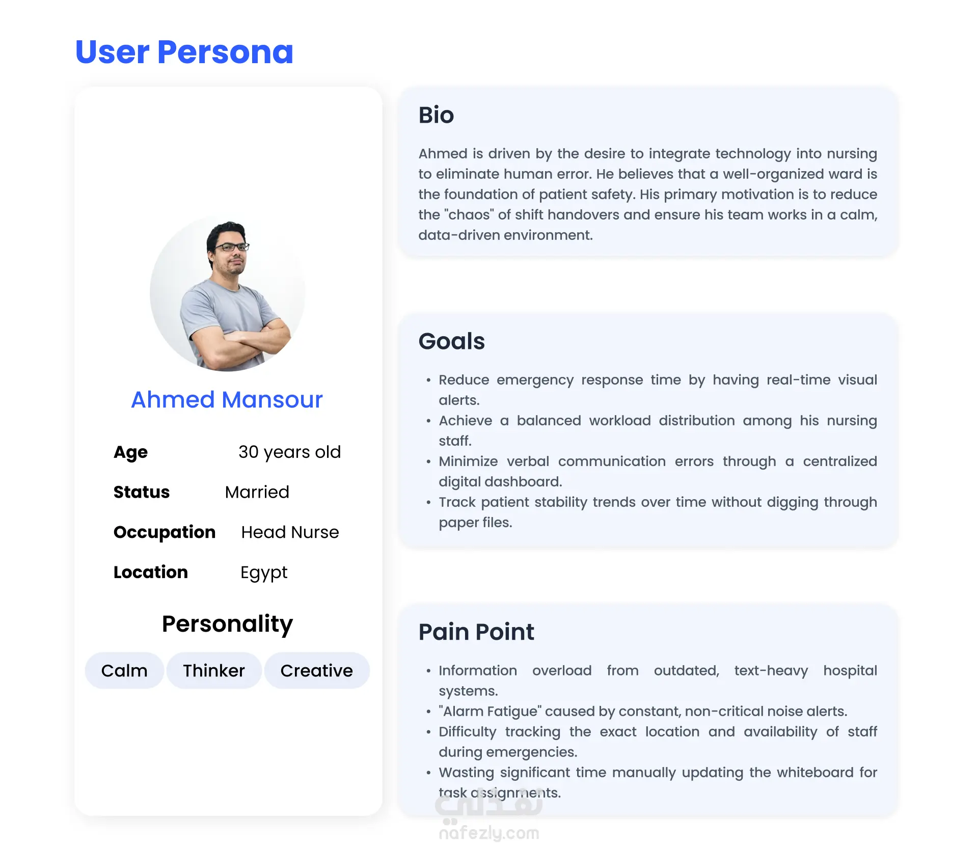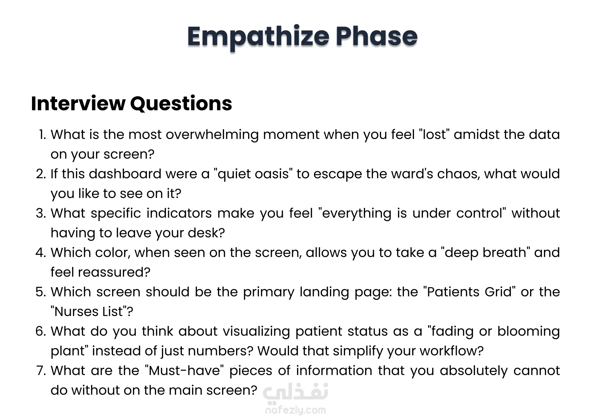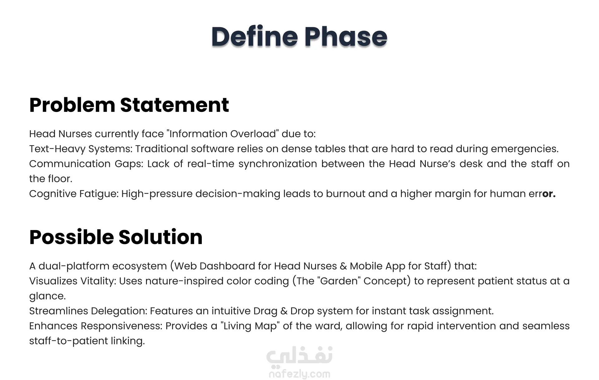 المراقبة البصرية (Visual Monitoring): ابتكار لغة بصرية (أيقونات ورق الشجر) لتمثيل الحالة الصحية للمرضى، مما يسمح للممرض بفهم الوضع العام بلمحة سريعة.