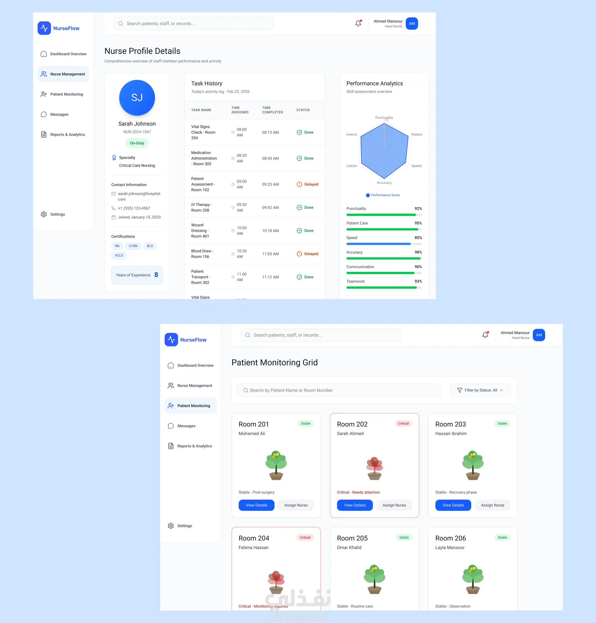 إدارة المهام (Task Management): توفير أدوات مرنة لرئيسة التمريض لتوزيع المهام ومراقبة أداء الطاقم لحظياً.