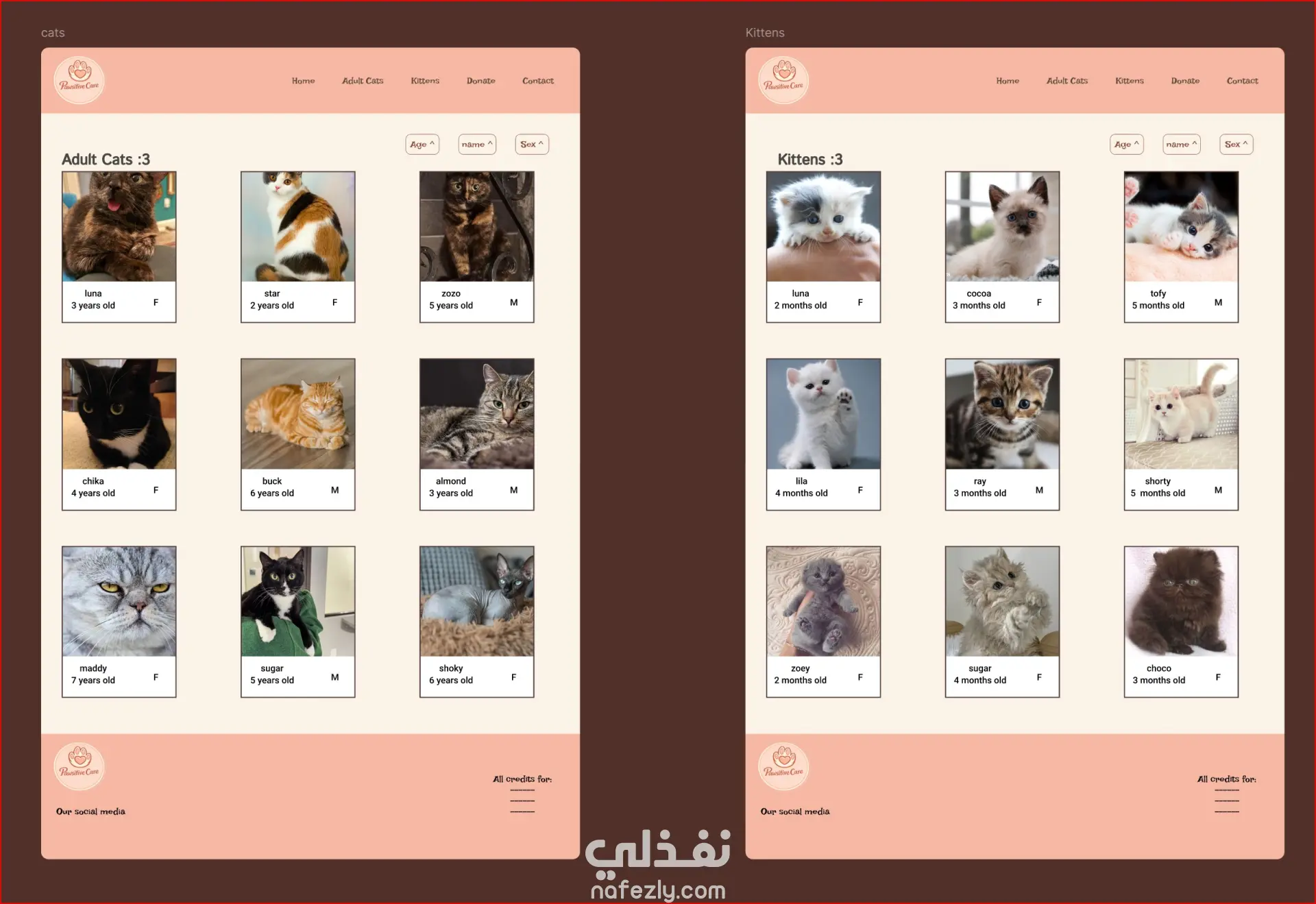 نظّمتُ المحتوى في أقسام واضحة للقطط البالغة والقطط الصغيرة، بحيث يعرض كل قسم الاسم، النوع (ذكر/أنثى)، ووصفًا مختصرًا.