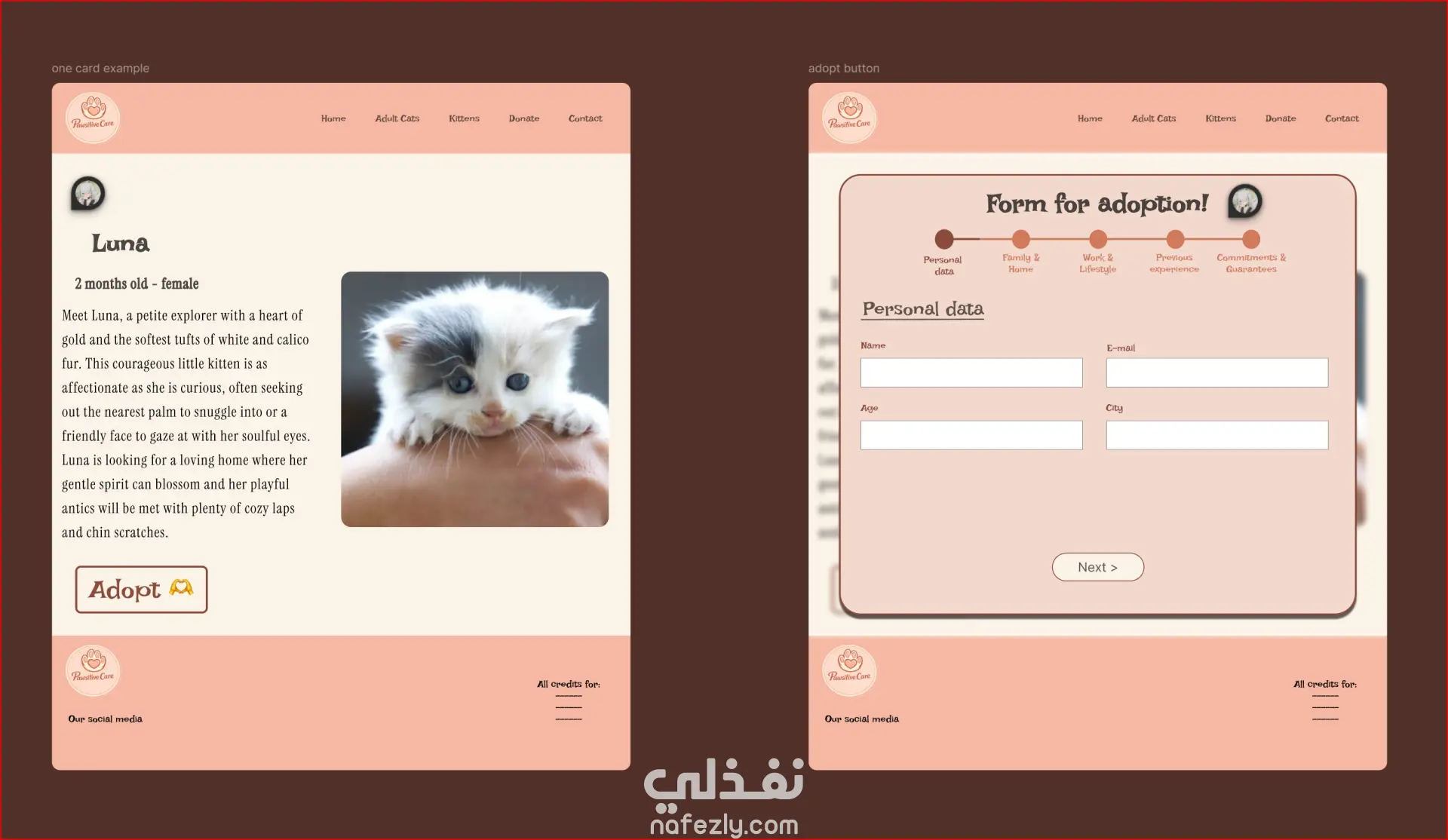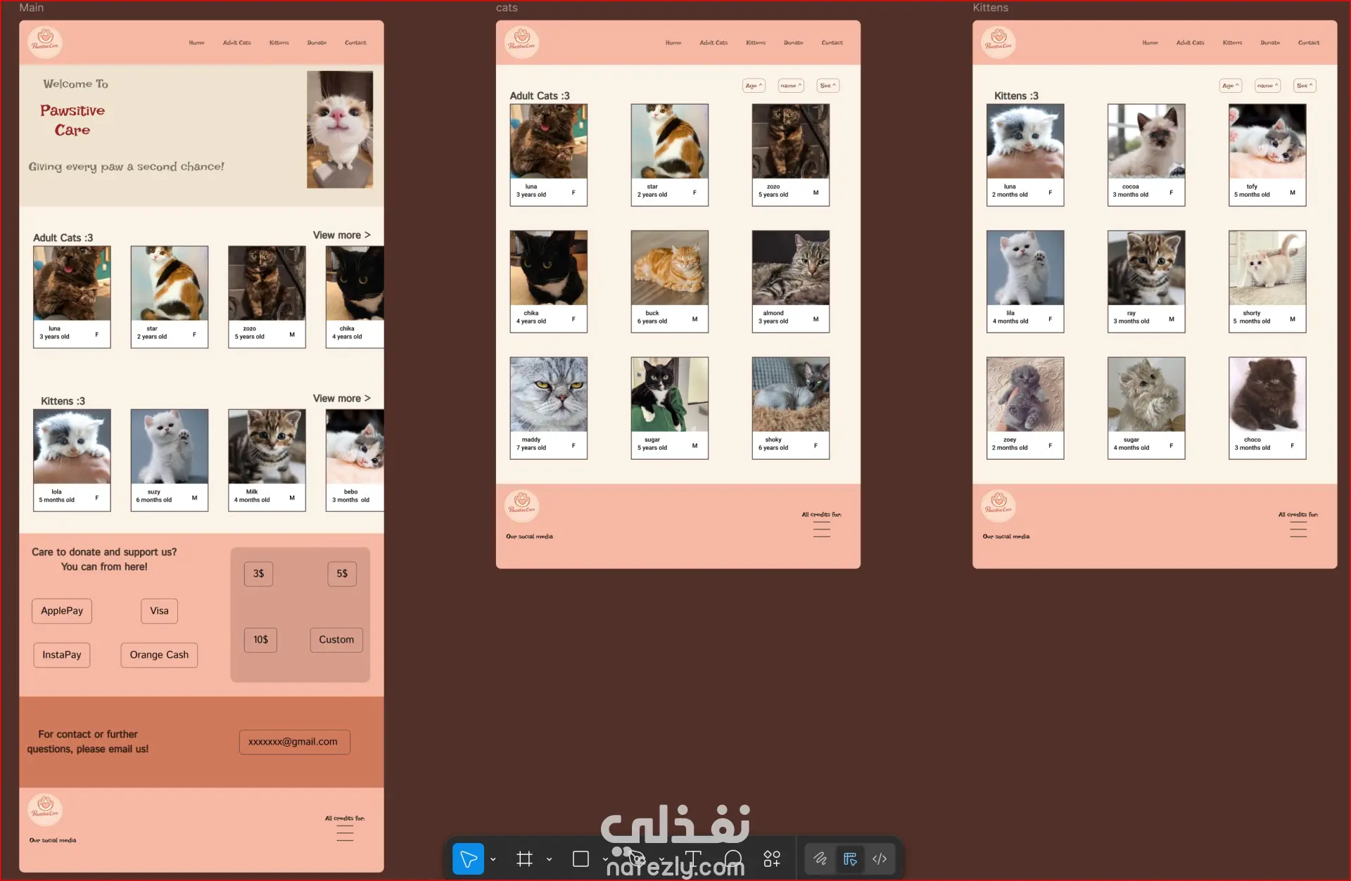 باستخدام Figma، قمتُ بتصميم وتنفيذ مفهوم واجهة مستخدم وتجربة مستخدم لموقع إلكتروني مخصص لتبنّي القطط والتبرع لها.