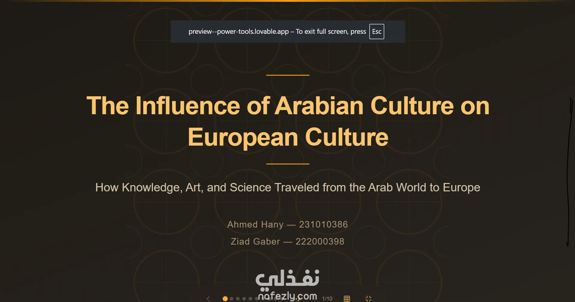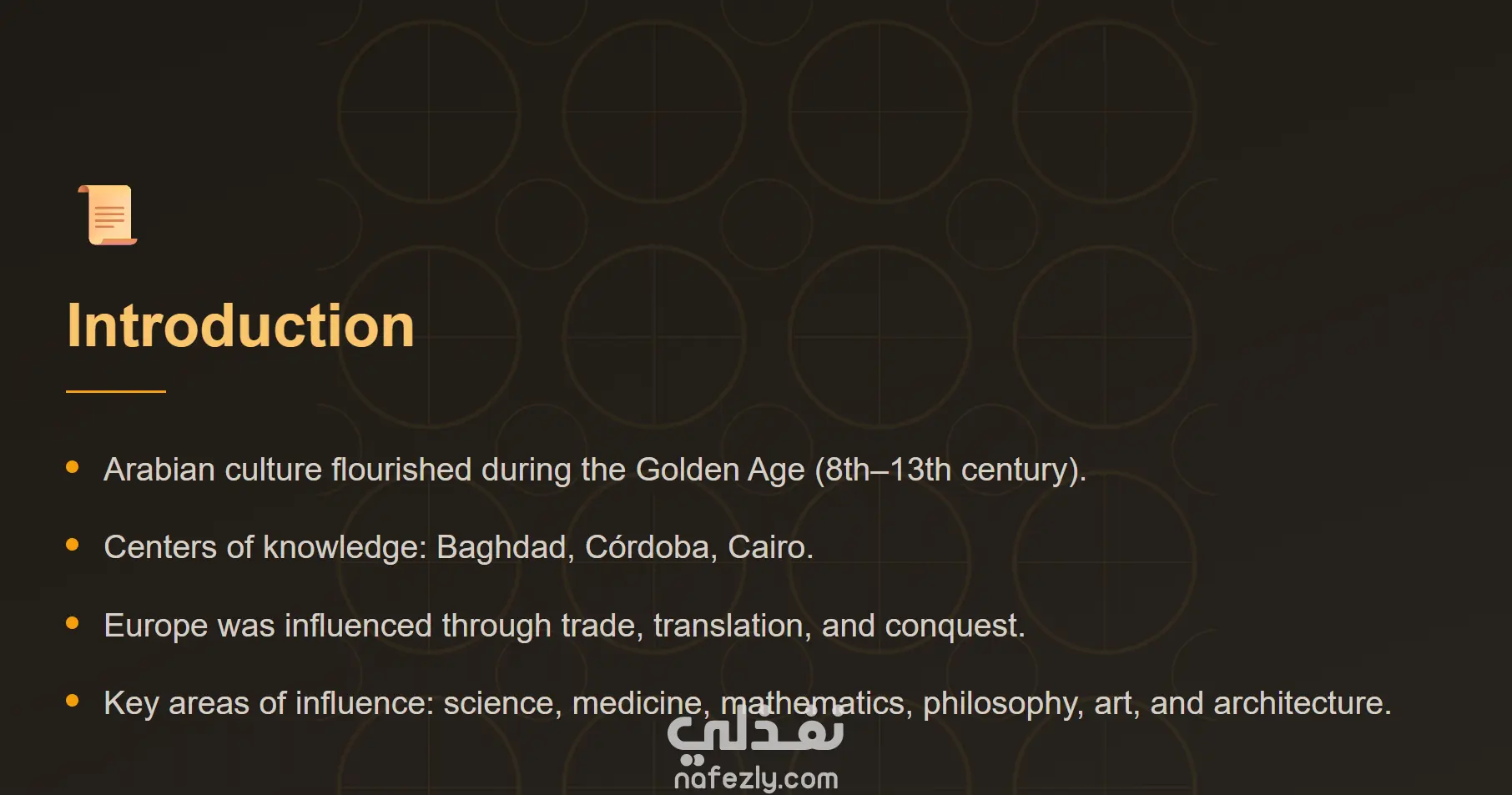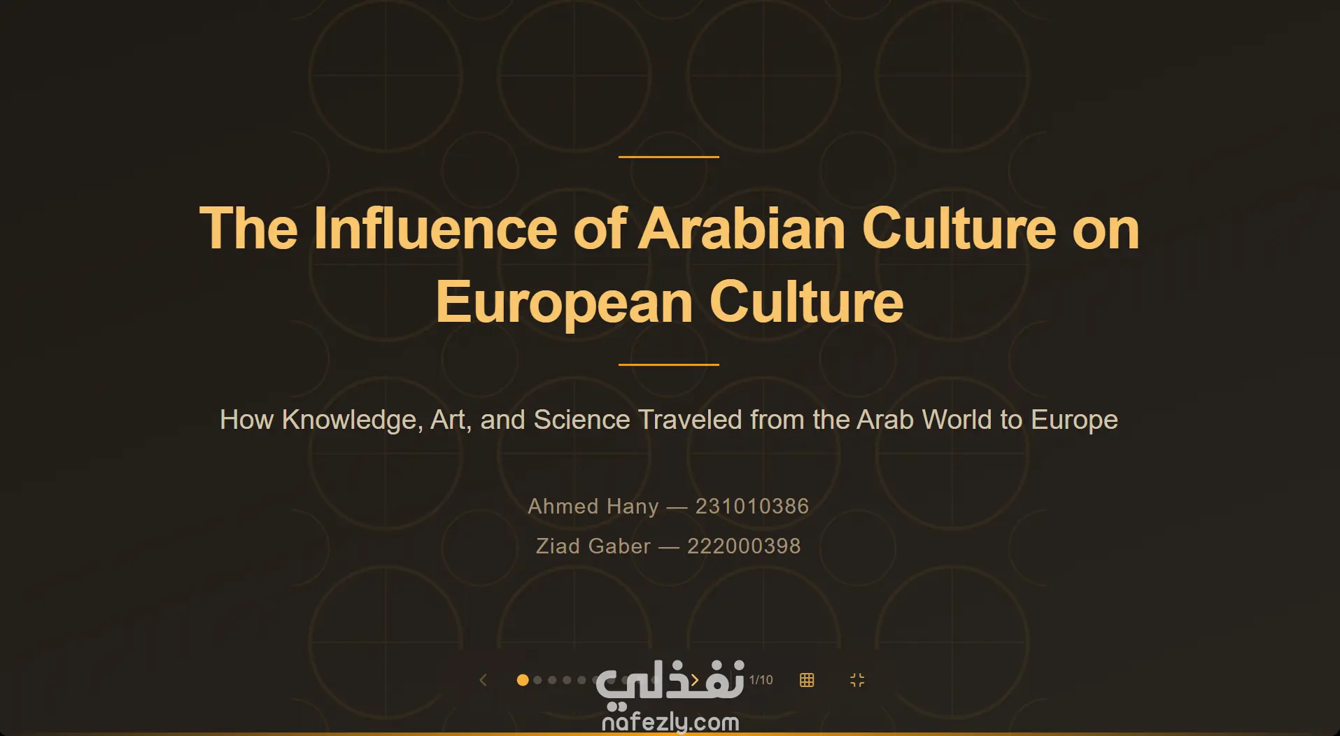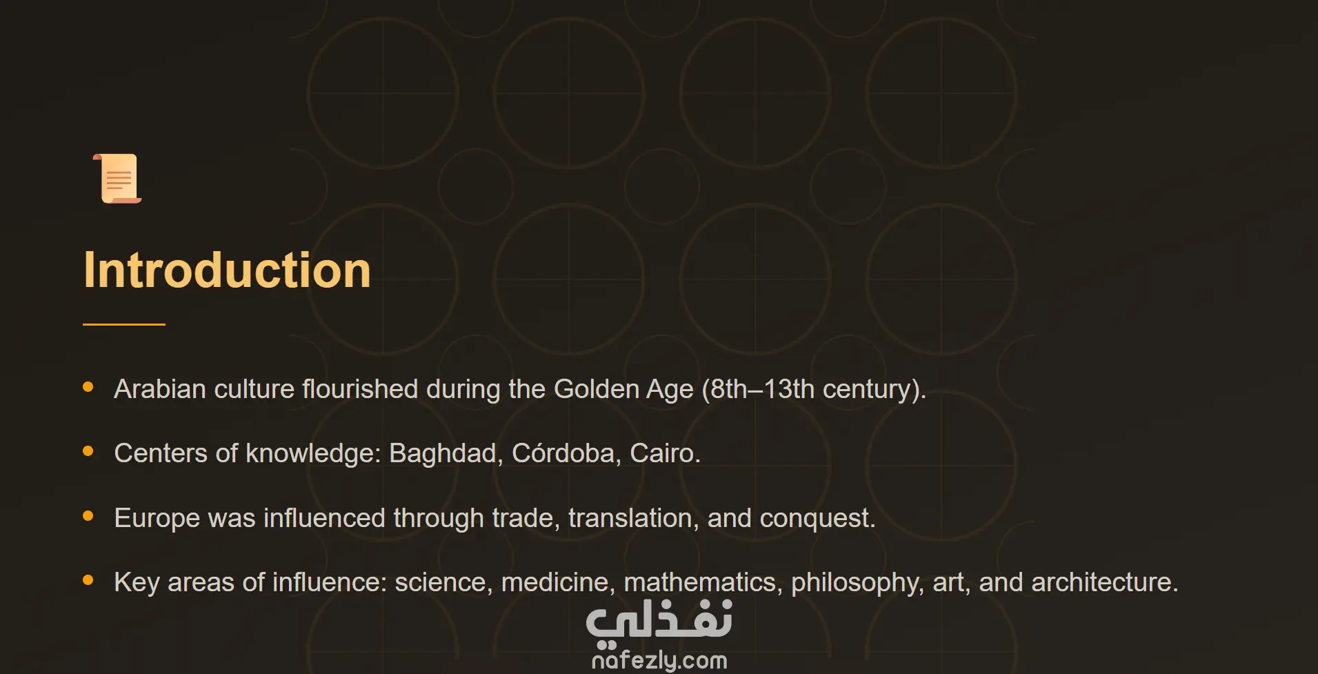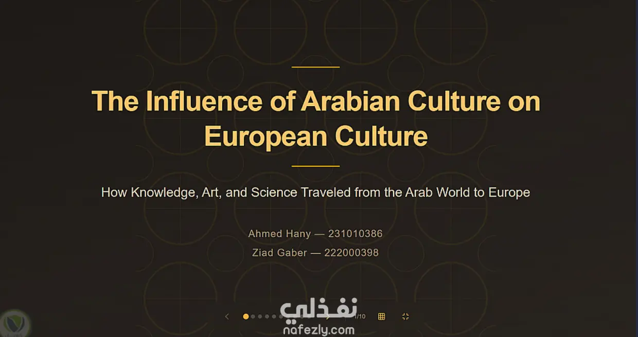 تصميم عرض تقديمي احترافي عن تأثير الثقافة العربية على أوروبا