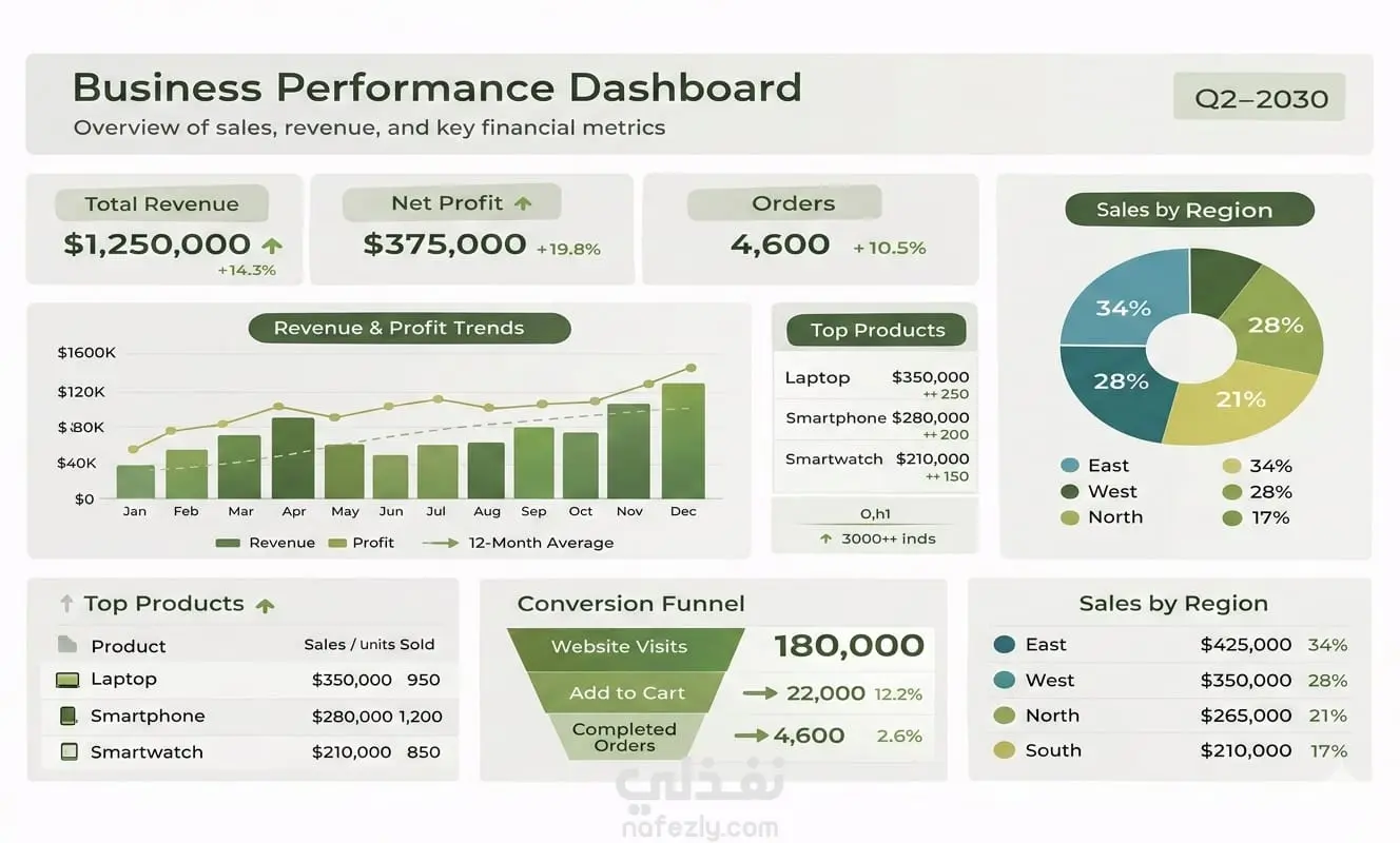 التصميم البصري (Visualization): * تصميم Neon Dark Mode مريح للعين يبرز المؤشرات الأساسية (KPIs).