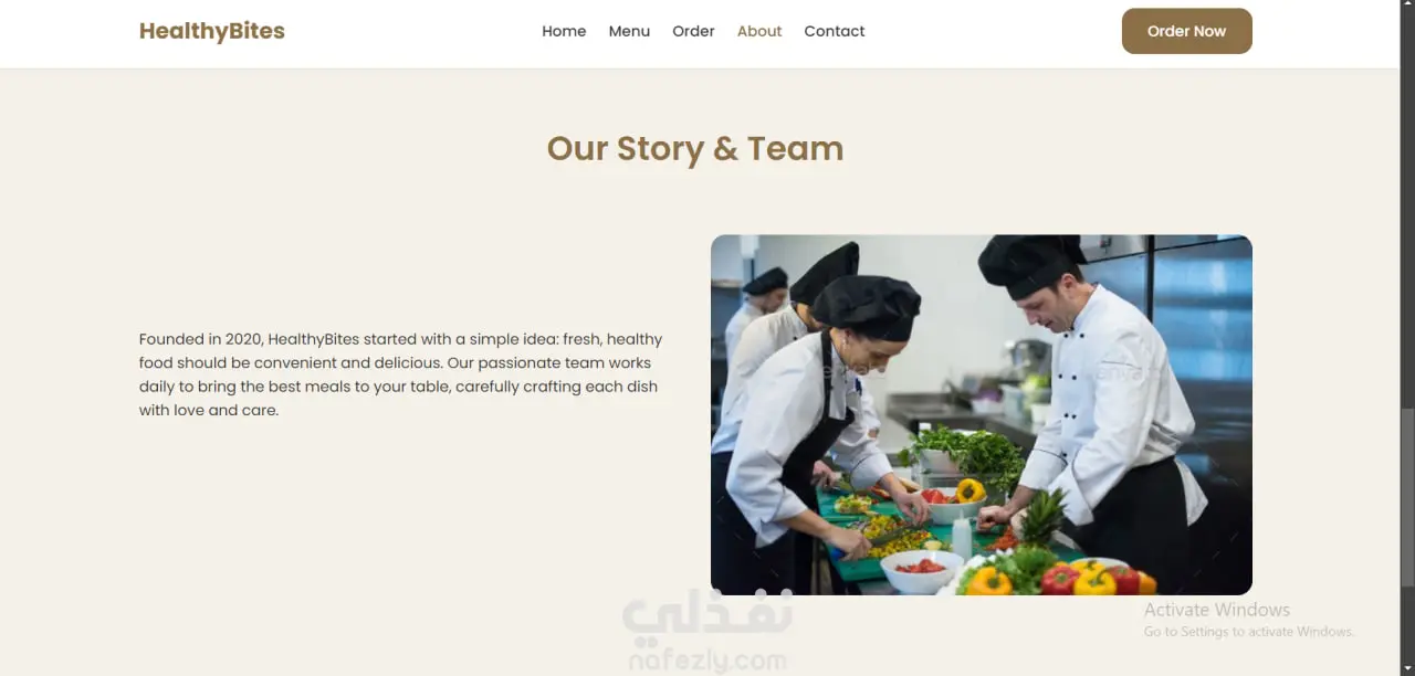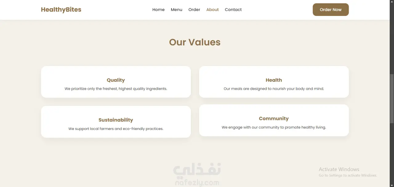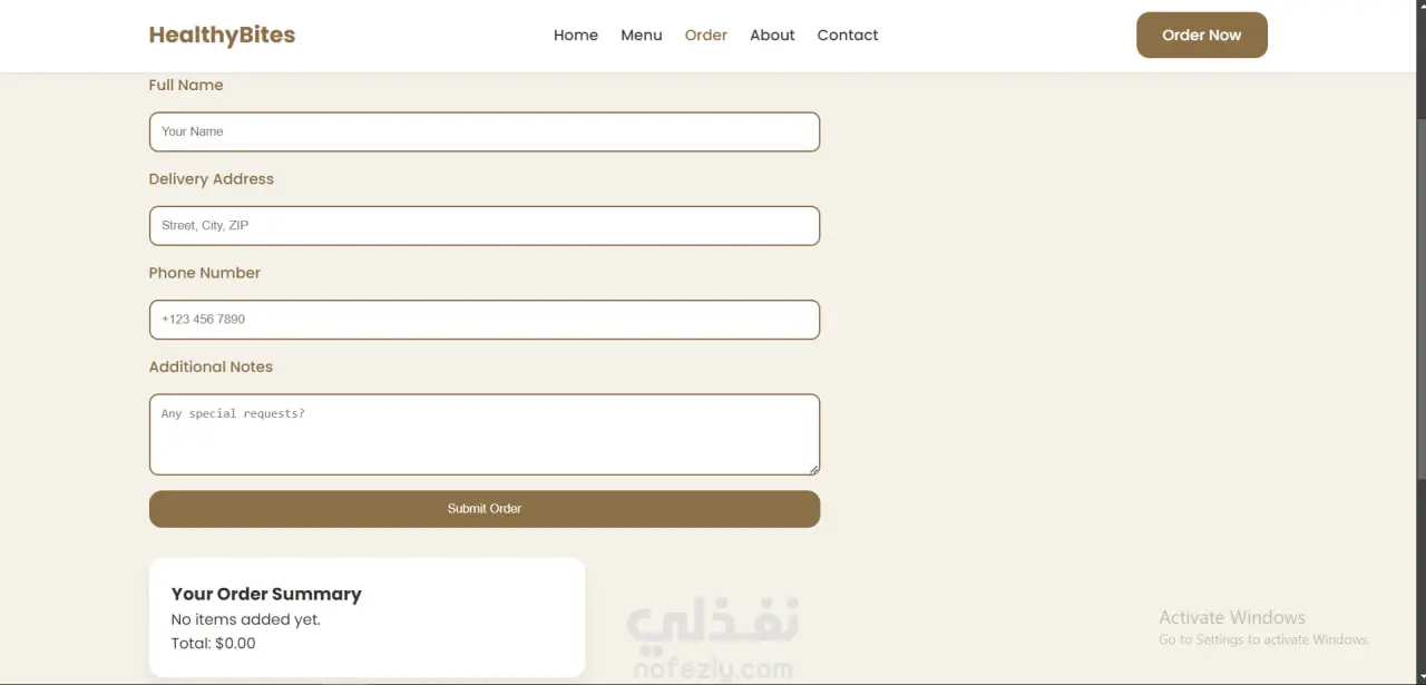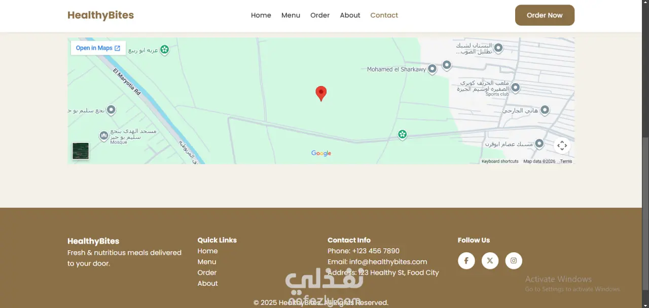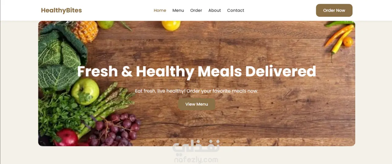 هذا المشروع عبارة عن Landing Page لموقع توصيل وجبات صحية باسم “HealthyBites”، صممته باستخدام HTML وCSS وJavaScript لإنشاء واجهة جذابة ومرتبة للزوار.