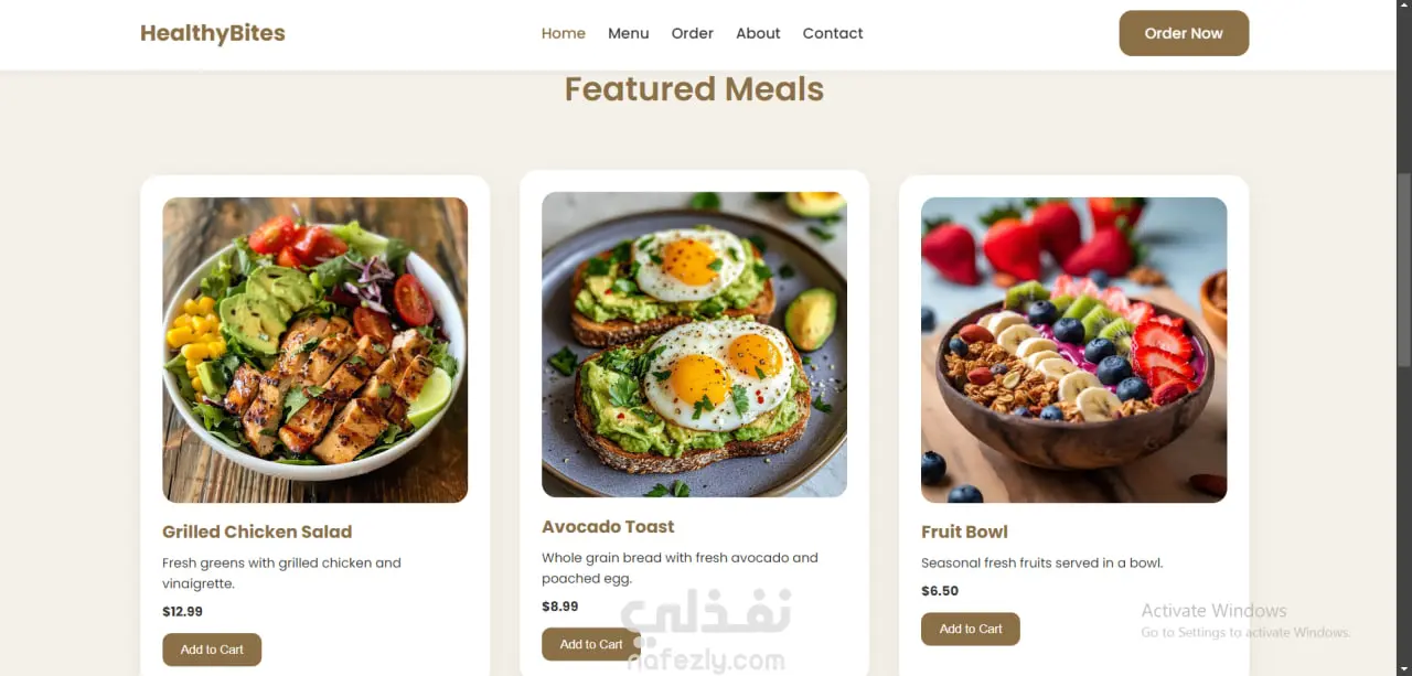 عرض المنتجات بطريقة جذابة مع صور الوجبات، الأسعار، وأزرار Add to Cart لتجربة تفاعلية بسيطة