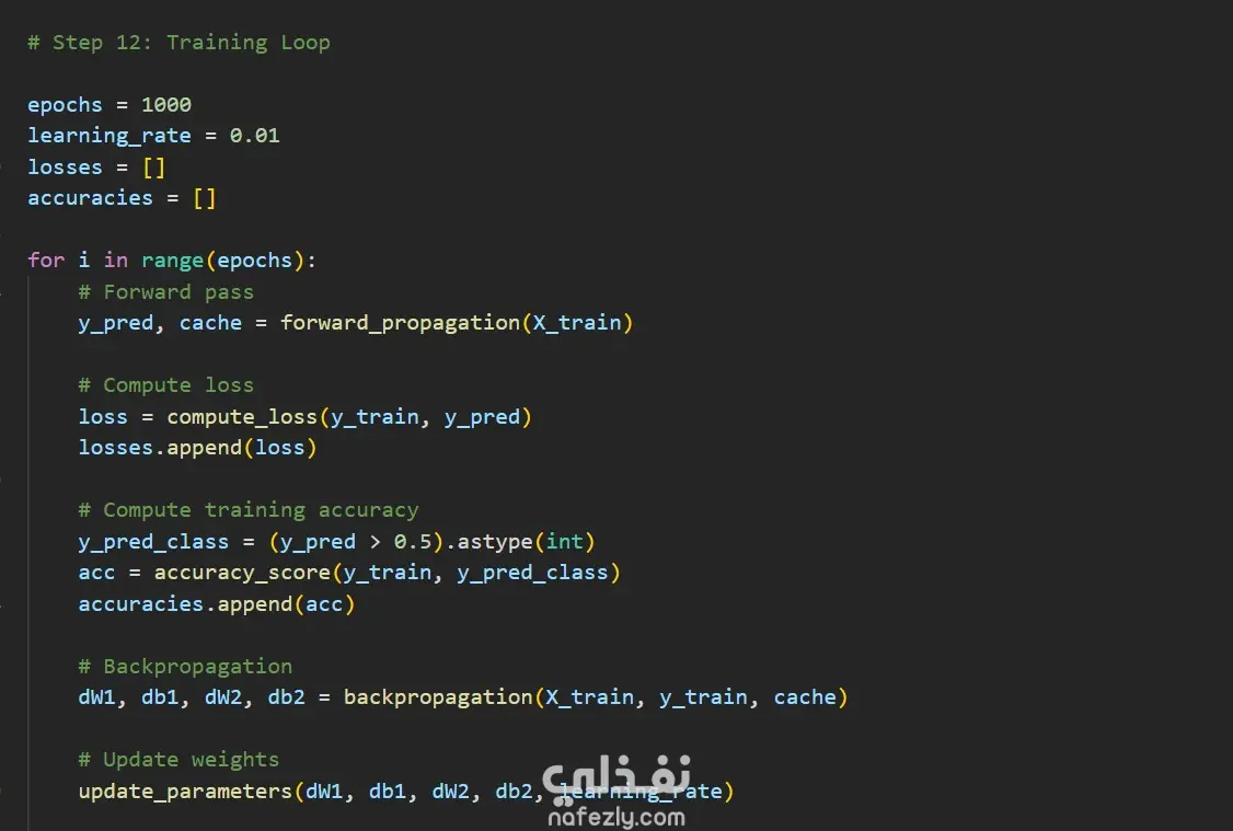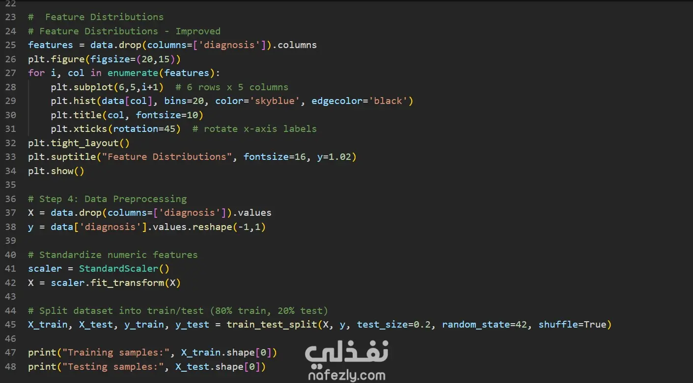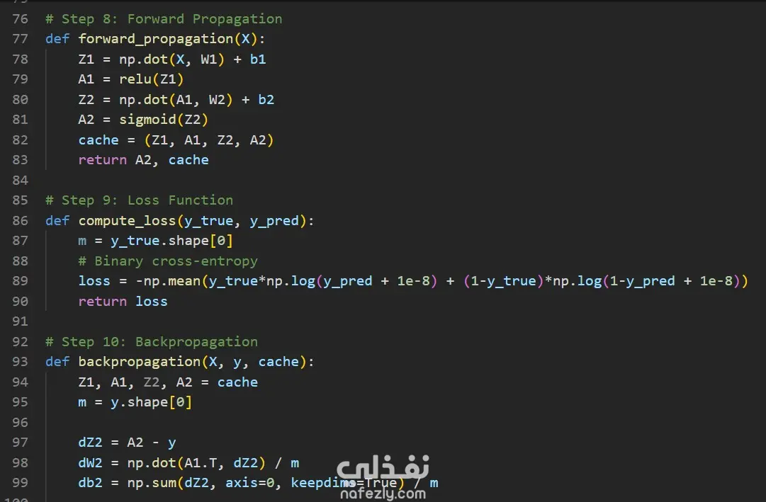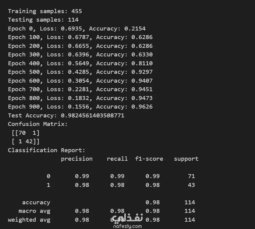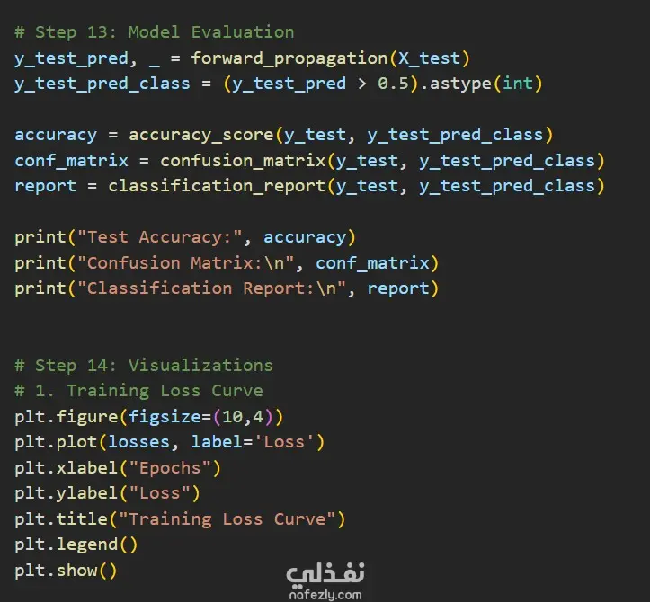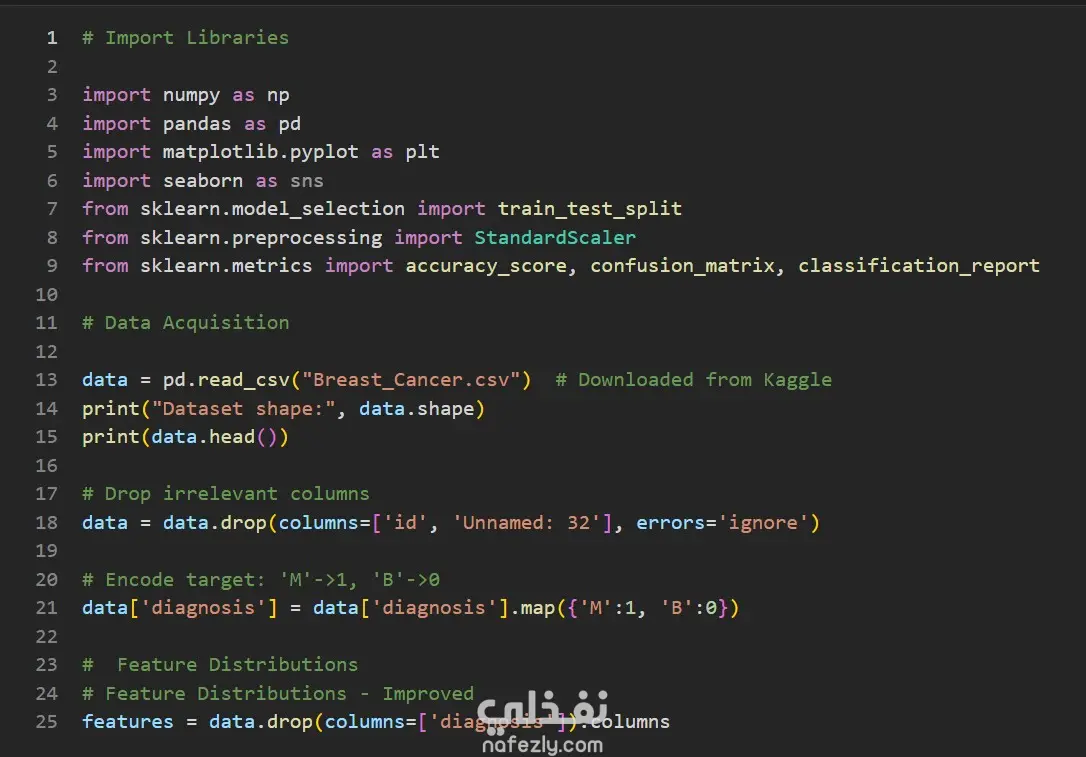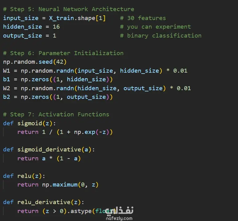 Built a binary classification neural network from scratch to predict malignant vs. benign tumors using the Breast Cancer Wisconsin dataset. Performed data cleaning, preprocessing, feature standardization, and EDA Designed and implemented a neural network with ReLU (hidden layer) and Sigmoid (output layer) Implemented forward propagation, backpropagation, and gradient descent Evaluated performance using accuracy, precision, recall, F1-score, and confusion matrix Conducted hyperparameter tuning to optimize model performance Tools & Technologies: Python, Pandas, NumPy, Matplotlib, Seaborn