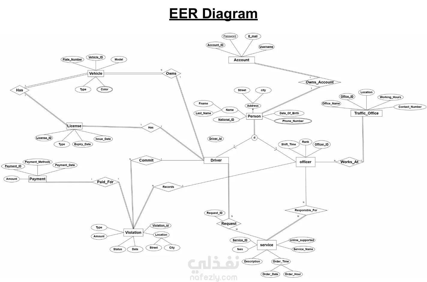 هذا المشروع عبارة عن بوابة إلكترونية للخدمات المرورية موجهة للمواطنين فكرة المشروع: تم تصميم نظام متكامل يسمح بإدارة مختلف الخدمات المرورية إلكترونيًا، مثل تسجيل المركبات، تجديد الرخص، الاستعلام عن المخالفات، وإصدار شهادات رسمية، مع واجهة مستخدم سهلة وبسيطة. أدوات وتقنيات المشروع: قاعدة بيانات Oracle SQL لإدارة البيانات بكفاءة. PL/SQL لكتابة الإجراءات والعمليات المنطقية داخل قاعدة البيانات. Oracle Form Builder لبناء واجهة المستخدم الرسومية (GUI) للنظام. تصميم ERD وتحويله إلى مخطط علائقي قبل تنفيذ النظام. This project is a comprehensive e-services portal for traffic-related services aimed at citizens. Project Overview: The system allows efficient management of various traffic services online, such as vehicle registration, license renewal, violation inquiries, and issuing official certificates, with a user-friendly interface. Technologies and Tools Used: Oracle SQL for efficient database management. PL/SQL for writing stored procedures and business logic. Oracle Form Builder for building the graphical user interface (GUI). Designing the ERD and mapping it to a relational schema before implementation.