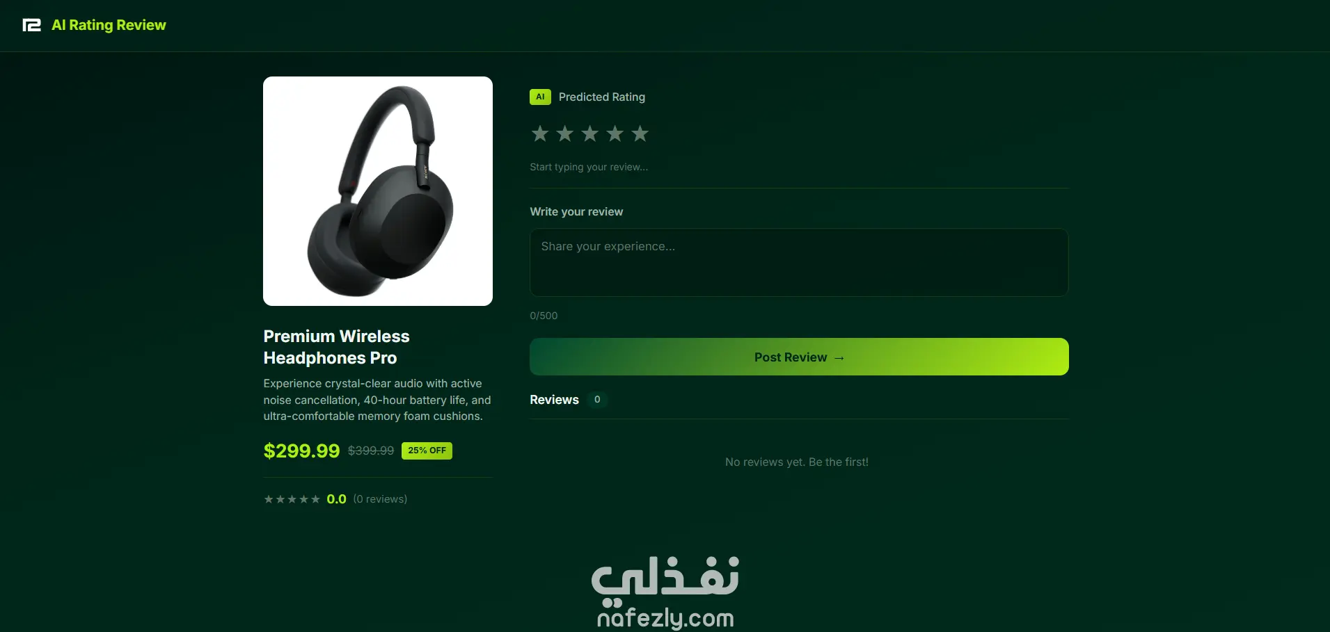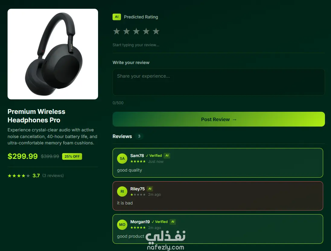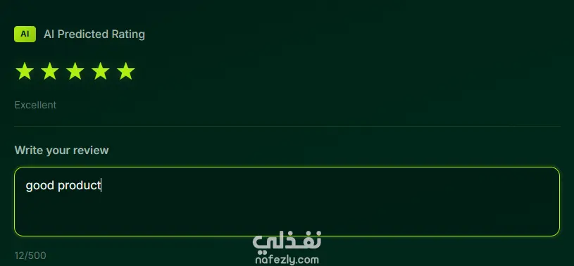 هذا النظام يقوم بتحليل نصوص المراجعات باستخدام معالجة اللغة الطبيعية (NLP) والتعلم الآلي، ويتنبأ بالمزاج العام للمراجعة (إيجابي/محايد/سلبي)، ويقترح تقييم النجوم (1-5) بناءً على التحليل. يدعم النظام تحليل النصوص الإنجليزية ويسمح للمستخدمين بنشر المراجعات بأي لغة. المميزات تحليل التعليقات بواسطة الذكاء الاصطناعي بشكل لحظي للمراجعات الإنجليزية التنبؤ التلقائي بتقييم النجوم (من 1 إلى 5 نجوم) حساب ذكي للتقييم – فقط المراجعات الإنجليزية تؤثر على التقييم الإجمالي إمكانية تعديل التقييم يدويًا – يمكن للمستخدمين ضبط اقتراحات الذكاء الاصطناعي واجهة مستخدم حديثة واستجابية مع تغذية راجعة لحظية إدارة المراجعات – عرض جميع المراجعات مع الطوابع الزمنية