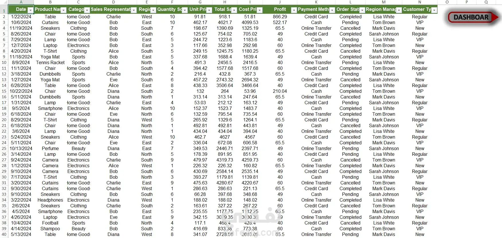 تتبع أداء المبيعات عبر عدة أبعاد (الفئة، المنطقة، الشهر، حالة الطلب) لاتخاذ قرارات إدارية صحيحة
