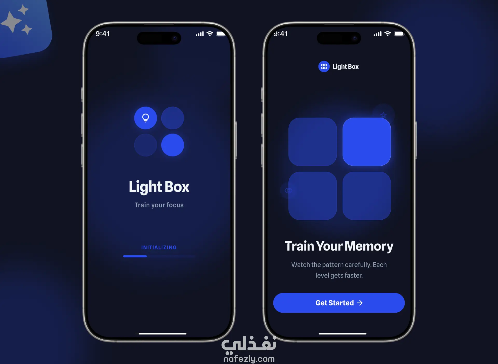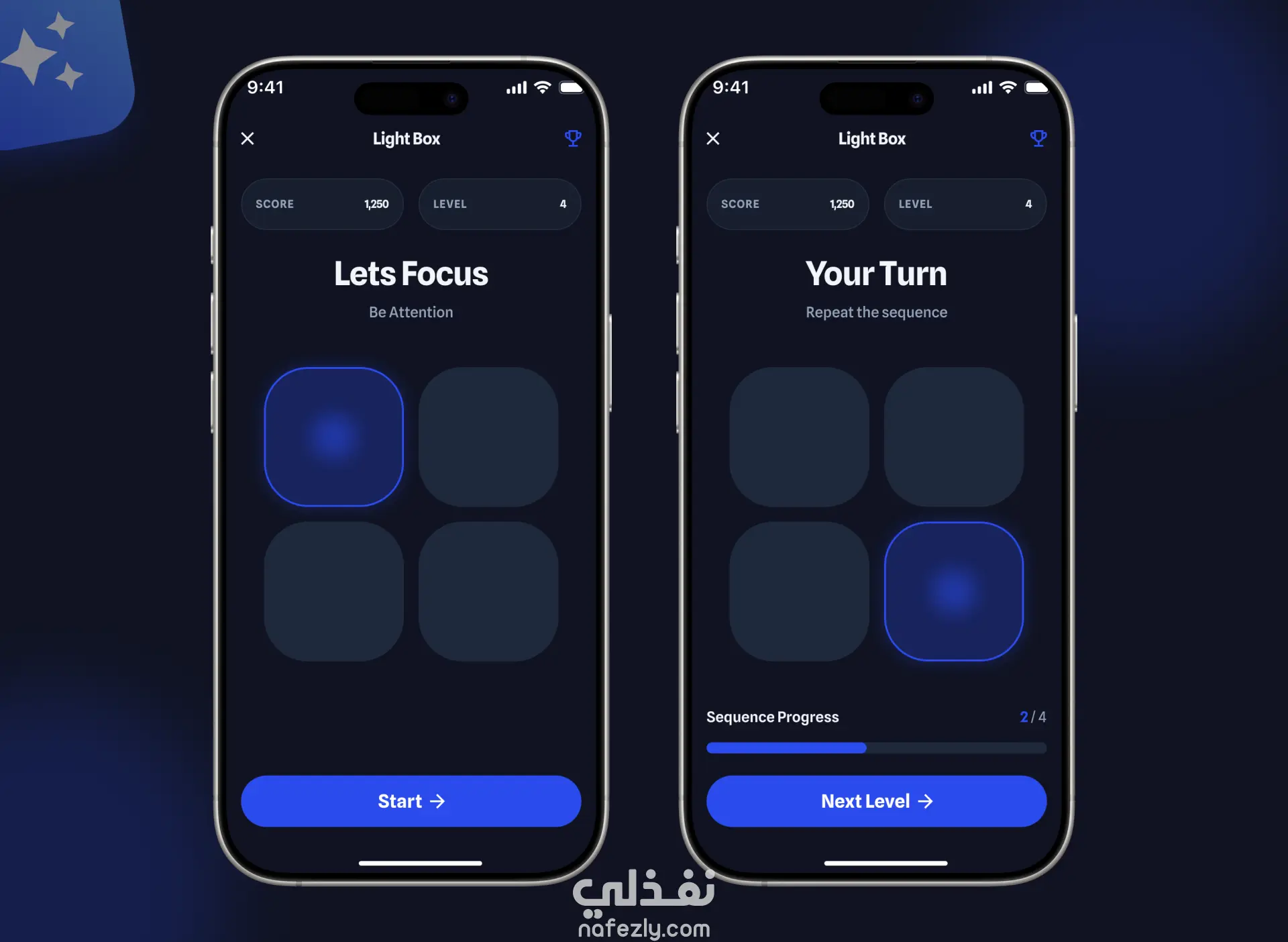 Light Box- نموذج تصميم لعبة تساعد علي رفع مستوي التركيز من خلال التركيز علي نمط ترتيب اضائة الصناديق واعادة ترتيبها مرة اخري بنفس الترتيب لتحسين الذاكرة والتركيز