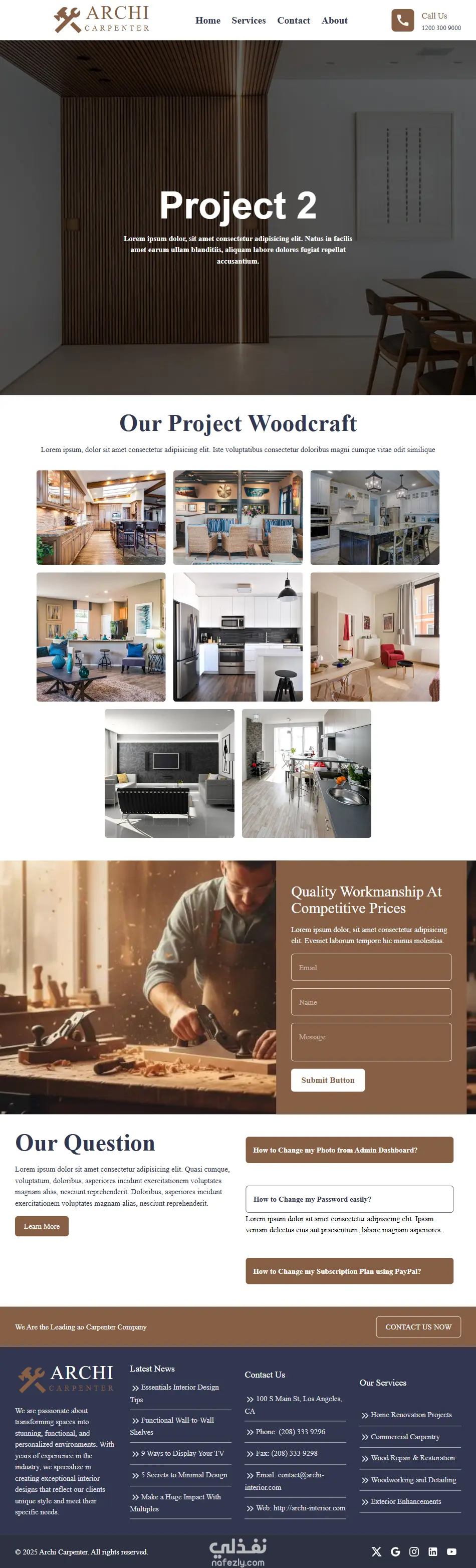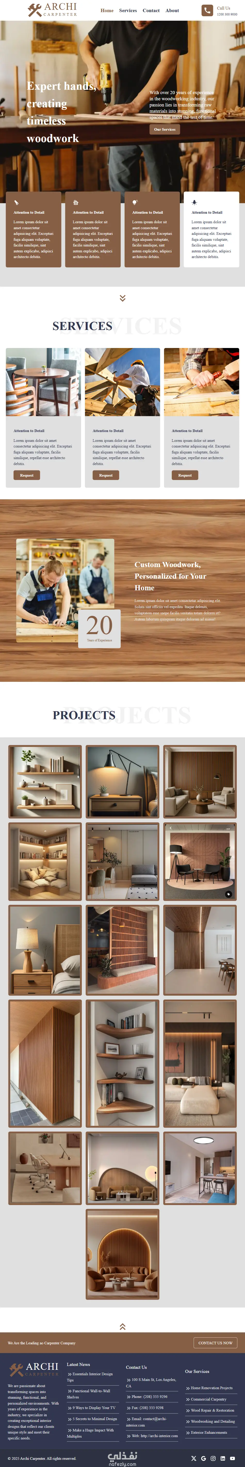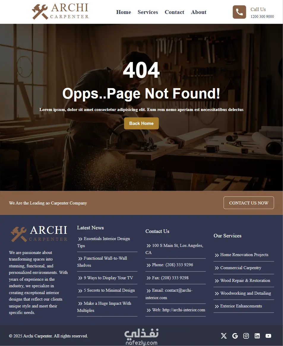 مشروع carpentry agency هو موقع تعريفي خاص بشركة Archi للنجارة والخشب مؤلف من عدة صفحات : صفحة الرئيسية (Home Page). وصفحة الخدمات (Services Page). وصفحة التواصل (Contact us Page). وصفحة من نحن (About us Page). ويحتوي خريطة تبين موقع الشركة وكما يحتوى أقسام لصور المشاريع المنجزة من قبل الشركة وصور كل مشروع بالإضافة إلى صفحة لكل مشروع (Project page). ويوجد إضافة بالموقع صفحة خاصة بال Not Found(error404).