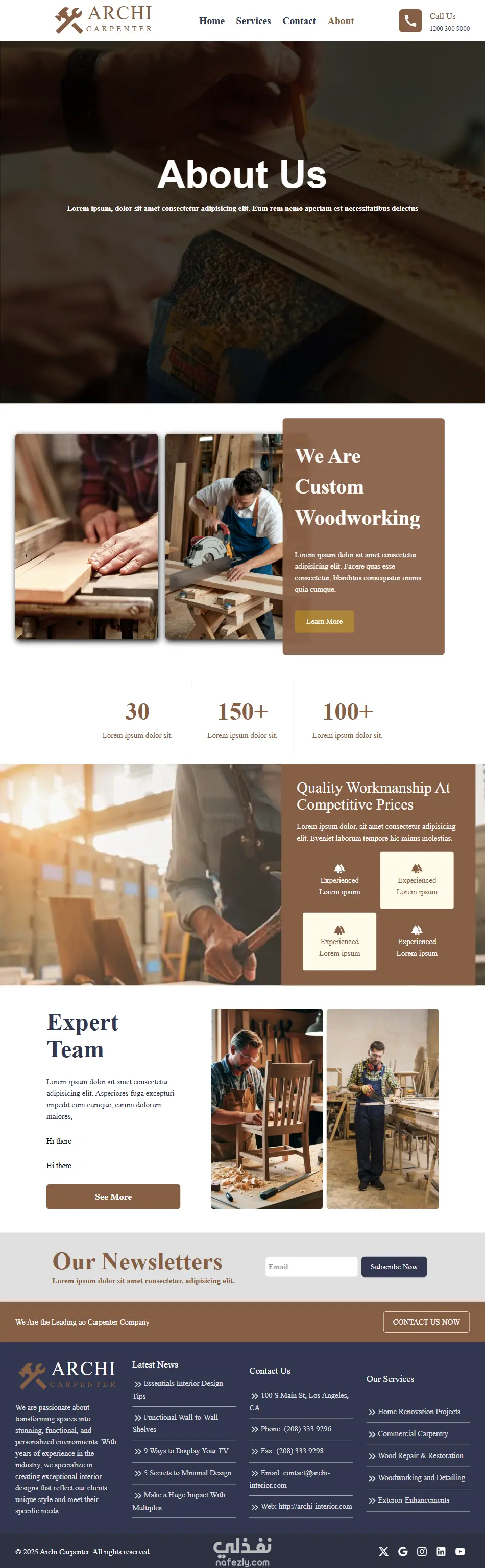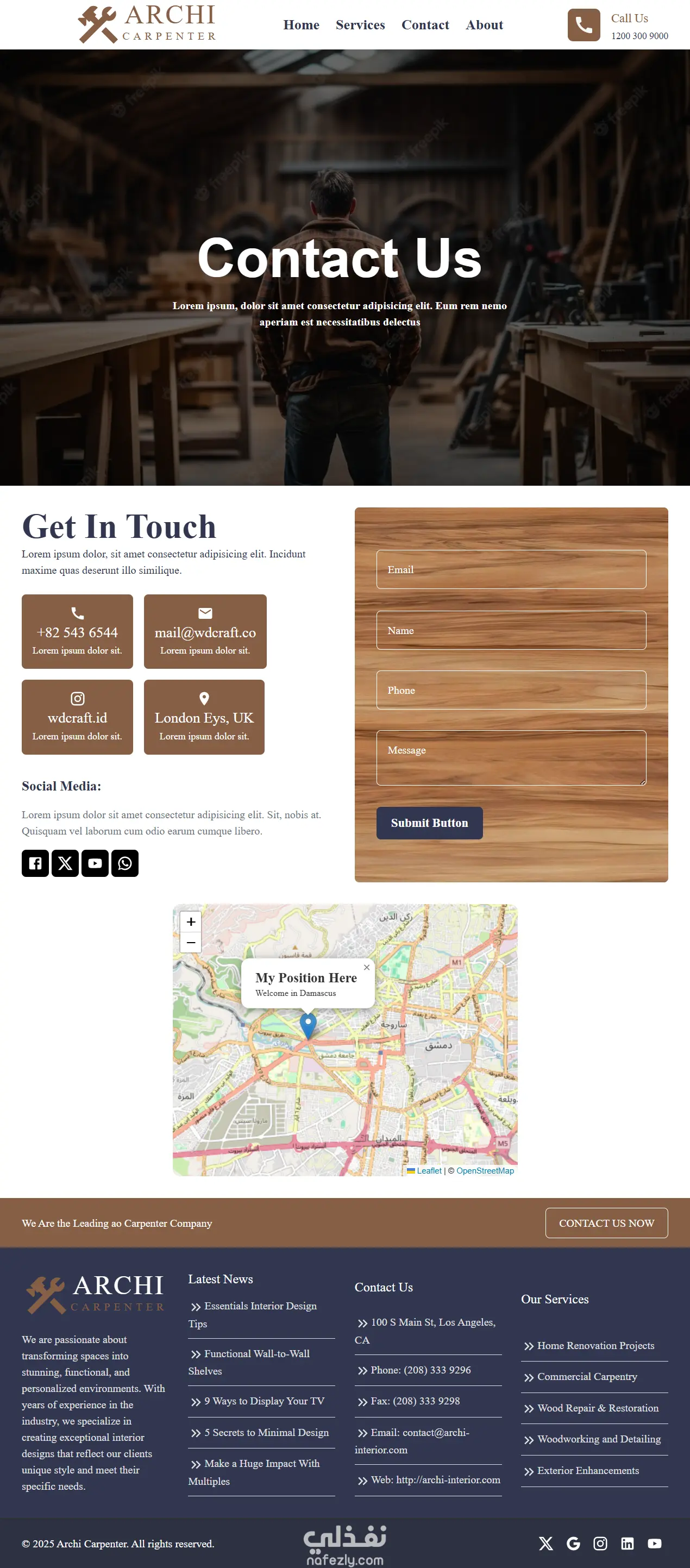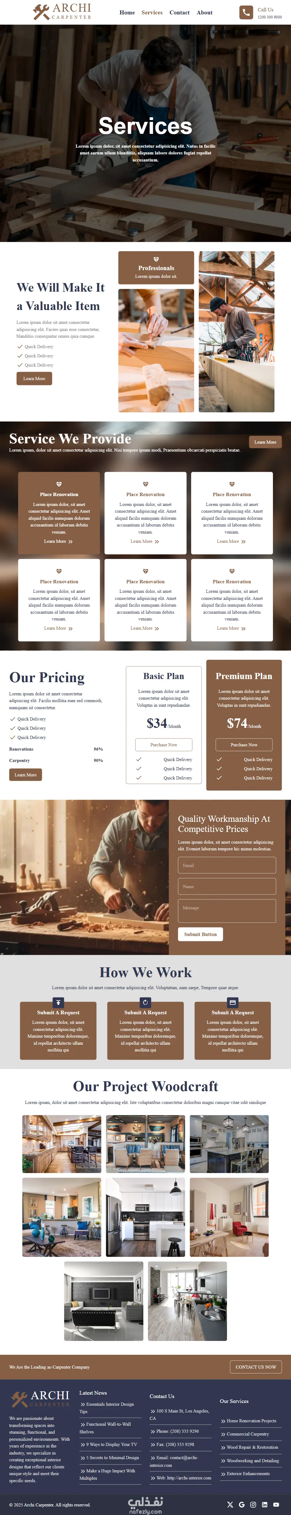 مشروع carpentry agency هو موقع تعريفي خاص بشركة Archi للنجارة والخشب مؤلف من عدة صفحات : صفحة الرئيسية (Home Page). وصفحة الخدمات (Services Page). وصفحة التواصل (Contact us Page). وصفحة من نحن (About us Page). ويحتوي خريطة تبين موقع الشركة وكما يحتوى أقسام لصور المشاريع المنجزة من قبل الشركة وصور كل مشروع بالإضافة إلى صفحة لكل مشروع (Project page). ويوجد إضافة بالموقع صفحة خاصة بال Not Found(error404).