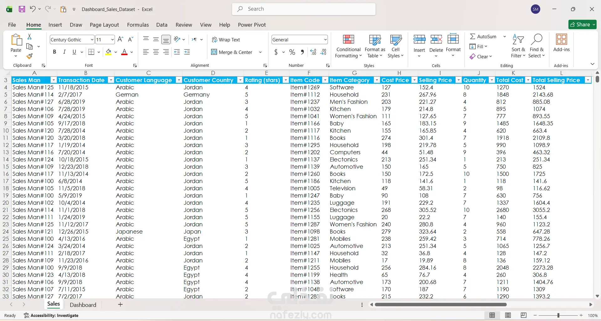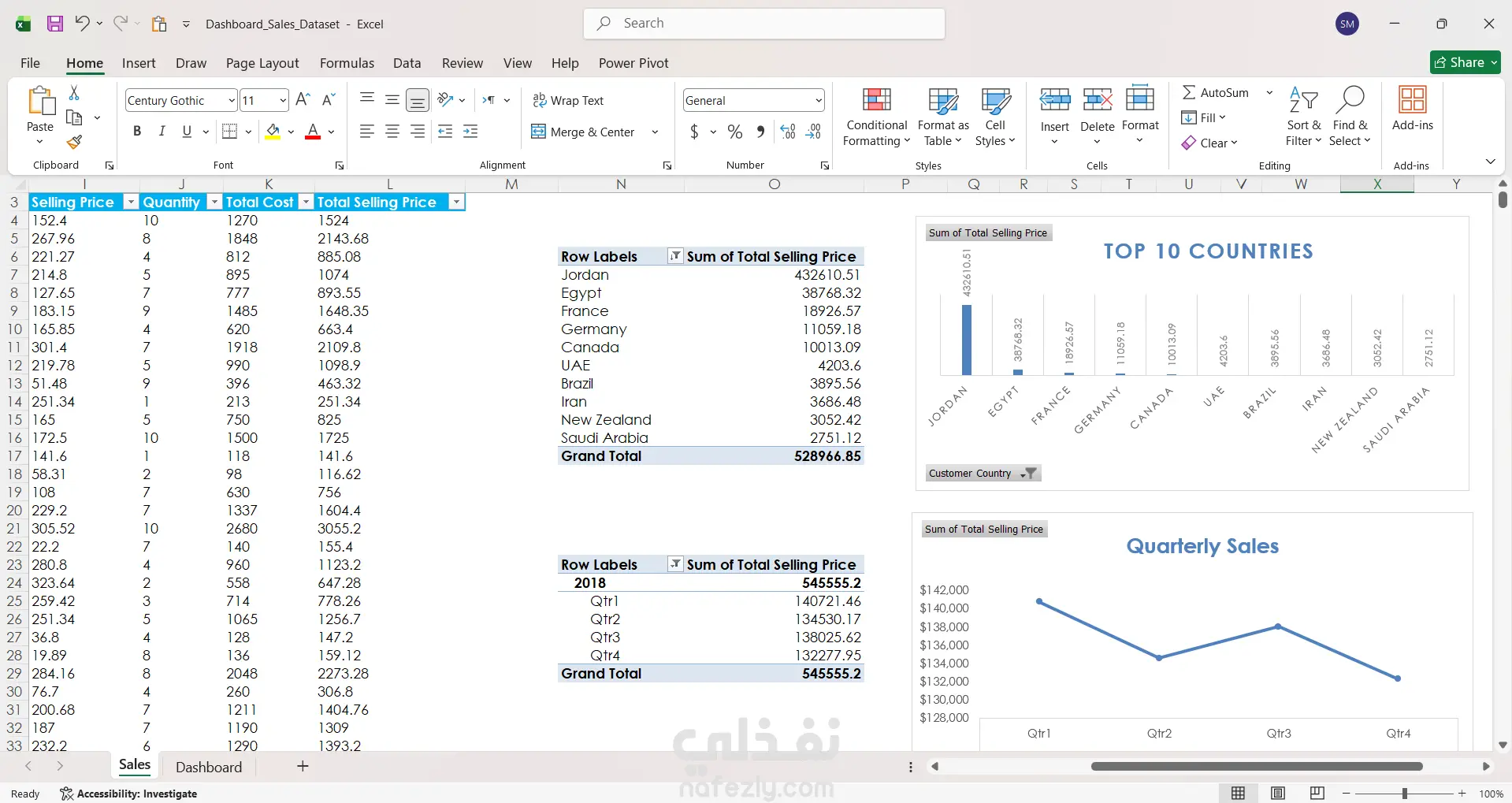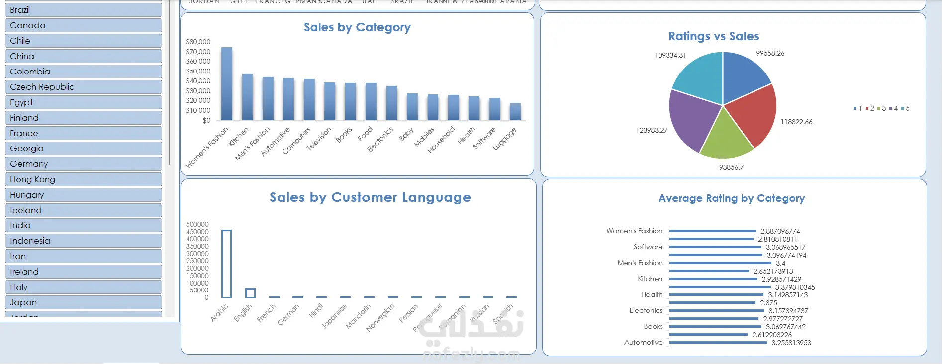 هذا المشروع عبارة عن نظام تحليل بيانات مبيعات متكامل تم بناؤه باستخدام Microsoft Excel، ويهدف إلى تحويل البيانات الخام إلى رؤى بصرية تفاعلية تساعد في اتخاذ القرارات. 1. هيكلة البيانات (Data Structuring) تم تنظيم البيانات في جدول احترافي يحتوي على الأعمدة التالية: بيانات المعاملات: التاريخ، اسم مندوب المبيعات. بيانات العميل: لغة العميل، الدولة. تفاصيل المنتج: كود المنتج، فئة المنتج (Category). البيانات المالية: سعر التكلفة، سعر البيع، الكمية، إجمالي التكلفة، وإجمالي سعر البيع. مؤشرات الأداء: تقييم العملاء (Ratings). 2. لوحة البيانات التفاعلية (The Dashboard) تتكون لوحة البيانات من عدة رسوم بيانية توضح اتجاهات العمل: Top 10 Countries: رسم بياني عمودي يوضح أعلى 10 دول من حيث المبيعات، ويظهر تفوق "الأردن" بشكل ملحوظ في هذه العينة. Quarterly Sales: خط بياني يراقب تطور المبيعات عبر أرباع السنة (Q1 to Q4) لعام 2018، مما يساعد في رصد المواسم القوية والضعيفة. Sales by Category: تحليل يوضح الفئات الأكثر مبيعاً، حيث تتصدر "ملابس النساء" (Women's Fashion) القائمة، تليها أدوات المطبخ. Ratings vs Sales: مخطط دائري (Pie Chart) يربط بين حجم المبيعات ومستويات التقييم (من 1 إلى 5 نجوم). Average Rating by Category: رسم بياني شريطي يوضح متوسط رضا العملاء عن كل فئة منتجات بشكل دقيق. 3. الميزات التفاعلية (Interactivity) تم إضافة Slicers (أدوات تصفية) لتمكين المستخدم من تخصيص العرض: فلتر التاريخ (Transaction Date): يسمح باختيار سنة محددة (2018 في المثال). فلتر الدولة (Customer Country): يسمح للمستخدم بالضغط على أي دولة لتحديث كافة الرسوم البيانية لتظهر بيانات تلك الدولة فقط.