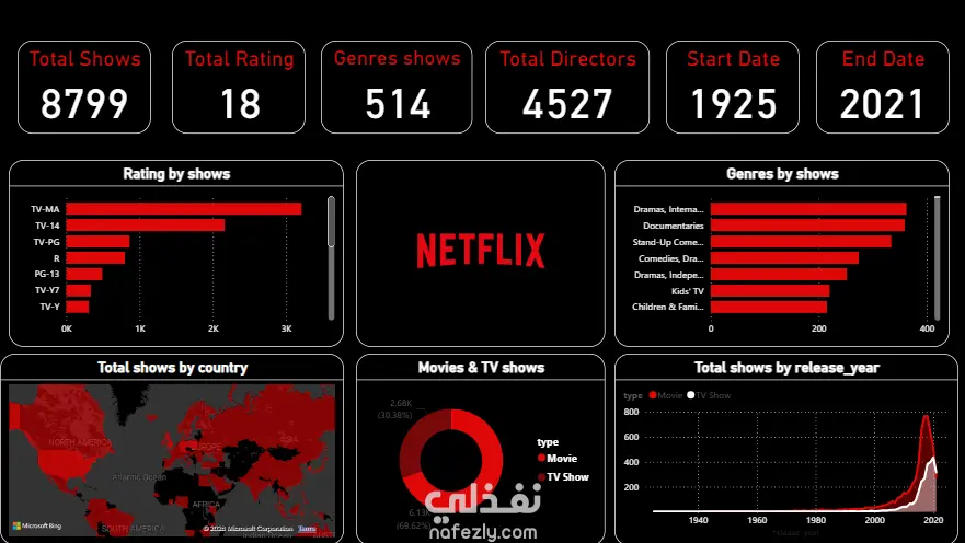 لوحة تحكم تحليلية تفاعلية لبيانات Netflix تعرض نظرة شاملة عن عدد الأعمال، التصنيفات العمرية، الأنواع (Genres)، الدول، وسنوات الإصدار. الهدف من المشروع هو فهم تطور المحتوى عبر السنوات وتحليل توزيع الأفلام والمسلسلات حسب النوع والتصنيف والدولة.