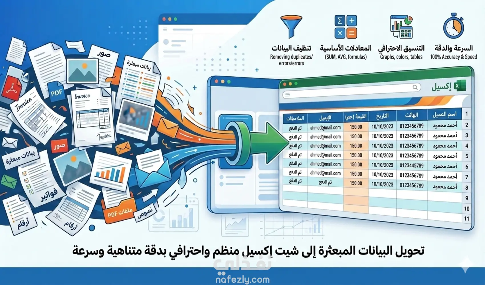 نموذج لإدخال وتنسيق البيانات على Excel بشكل احترافي، يتضمن: إدخال البيانات في جداول منظمة وسهلة القراءة تنسيق الجداول بألوان وخطوط احترافية تطبيق معادلات بسيطة (جمع، متوسط، إلخ) بيانات مرتبة وجاهزة للاستخدام الفورى