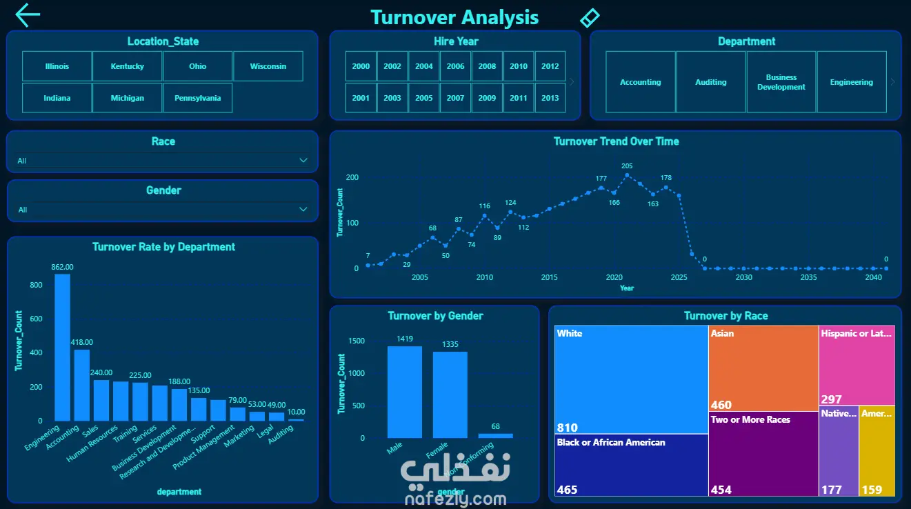 تحليل دوران العمالة (Turnover Analysis): رصد اتجاهات الاستقالة وترك العمل عبر السنوات، مع تحديد الأقسام ذات معدلات الدوران الأعلى (مثل قسم الهندسة والمحاسبة).