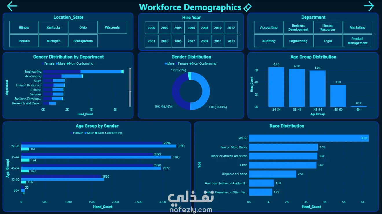 تحليل التركيبة السكانية (Demographics Analysis): توزيع الموظفين حسب النوع الاجتماعي، الفئات العمرية (مع تركيز عالٍ في فئة 24-34 عاماً)، والتنوع العرقي.