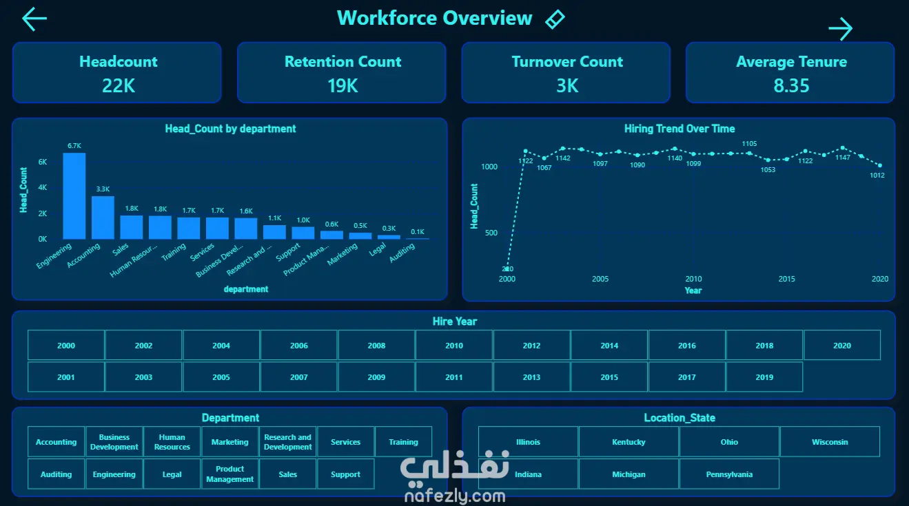 نظرة عامة على القوى العاملة (Workforce Overview): مراقبة المؤشرات الرئيسية مثل إجمالي عدد الموظفين (22K)، ومعدل الاستبقاء (19K)، ومتوسط سنوات الخدمة (8.35 سنة).