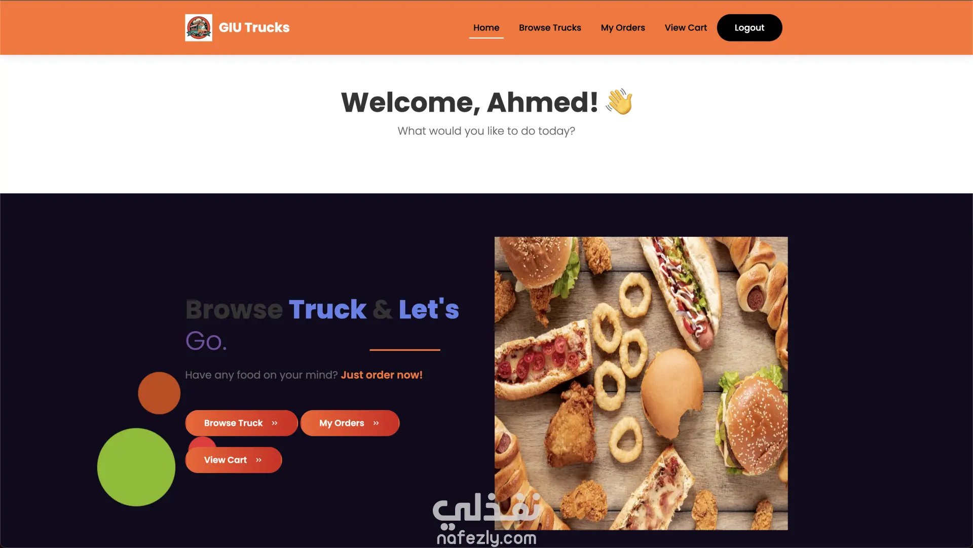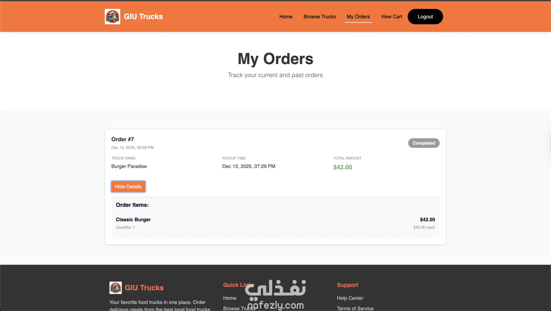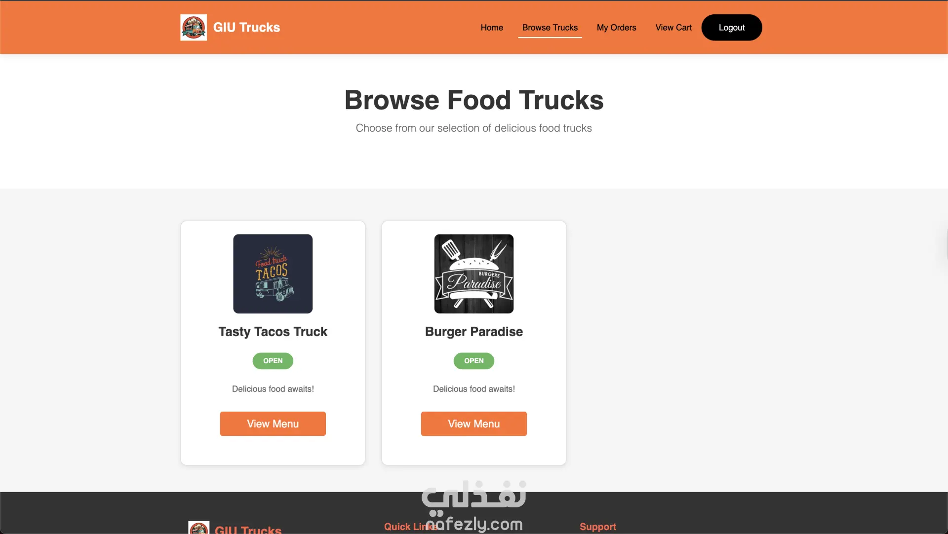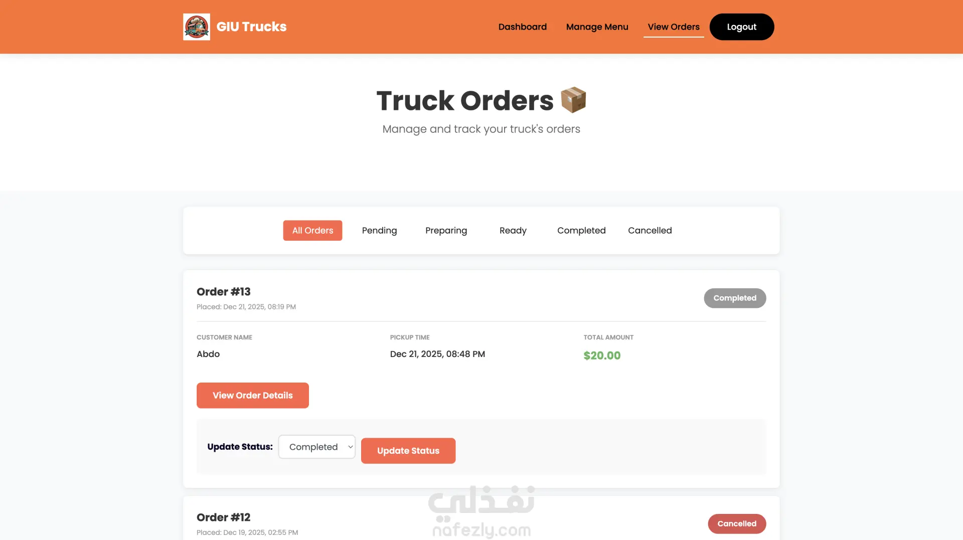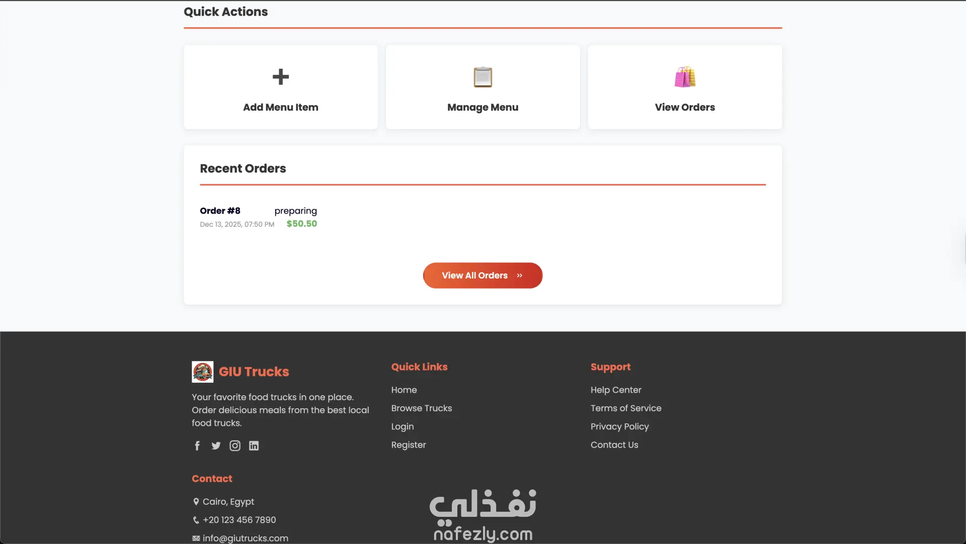 GIU Food Trucks – منصة إدارة وطلب من عربيات الأكل GIU Food Trucks هو تطبيق ويب متكامل يربط بين أصحاب عربيات الأكل (Food Trucks) والعملاء في منصة واحدة سهلة الاستخدام. التطبيق بيسمح للعميل بتصفح العربيات، مشاهدة المنيو، إضافة منتجات للسلة، عمل طلب وتتبع حالته لحظة بلحظة. وفي نفس الوقت بيوفر لوحة تحكم كاملة لصاحب العربة لإدارة المنيو، الطلبات، وحالة التوفر. مميزات العميل (Customer) إنشاء حساب وتسجيل دخول تصفح جميع عربيات الأكل المتاحة عرض المنيو مع التصنيفات والأسعار فلترة المنتجات حسب الفئة (Category) إضافة وتعديل المنتجات في سلة المشتريات تحديد وقت الاستلام (Pickup Time) متابعة حالة الطلب (Pending → Preparing → Ready → Completed) عرض سجل الطلبات والتفاصيل الكاملة لكل طلب مميزات صاحب العربة (Truck Owner) لوحة تحكم تحتوي على إحصائيات (عدد المنتجات – حالة الطلبات) التحكم في حالة العربة (متاح / غير متاح) إدارة المنيو (إضافة – تعديل – حذف منتجات) عرض الطلبات مع إمكانية الفلترة حسب الحالة تحديث حالة الطلب بشكل مباشر التقنيات المستخدمة Frontend HTML5 & CSS3 Bootstrap 4 (تصميم متجاوب Responsive Design) jQuery (AJAX & DOM Manipulation) Backend Node.js (بيئة التشغيل) Knex.js (Query Builder للتعامل مع قاعدة البيانات) Database PostgreSQL (قاعدة بيانات علائقية) فكرة المشروع تقنياً تم بناء RESTful API مكون من 22 Endpoint. نظام صلاحيات (Authentication & Authorization) يفصل بين العميل وصاحب العربة. استخدام PostgreSQL لإدارة العلاقات بين: المستخدمين عربيات الأكل المنتجات الطلبات السلة تحديث حالة الطلب ديناميكياً عبر API. هيكلة المشروع تعتمد على تنظيم واضح للـ routes و controllers و database connectors. الهدف من المشروع إنشاء نظام طلب وإدارة احترافي يحاكي أنظمة طلب الطعام الحقيقية مثل Talabat أو Uber Eats ولكن مخصص لنظام عربيات الأكل.