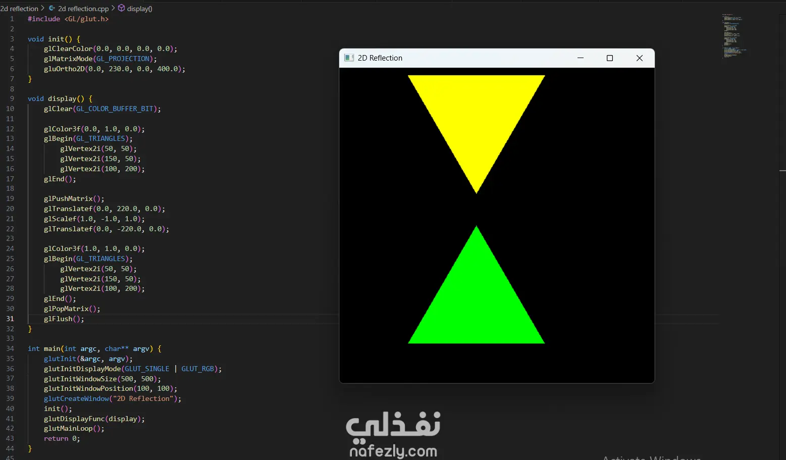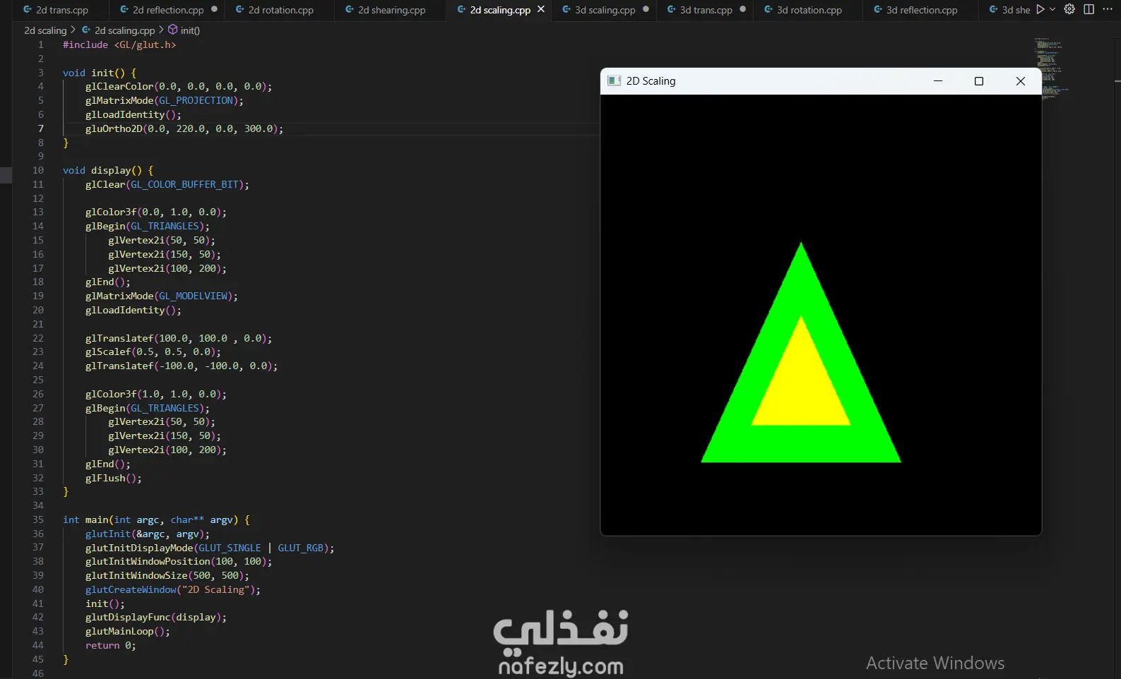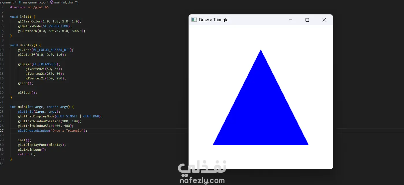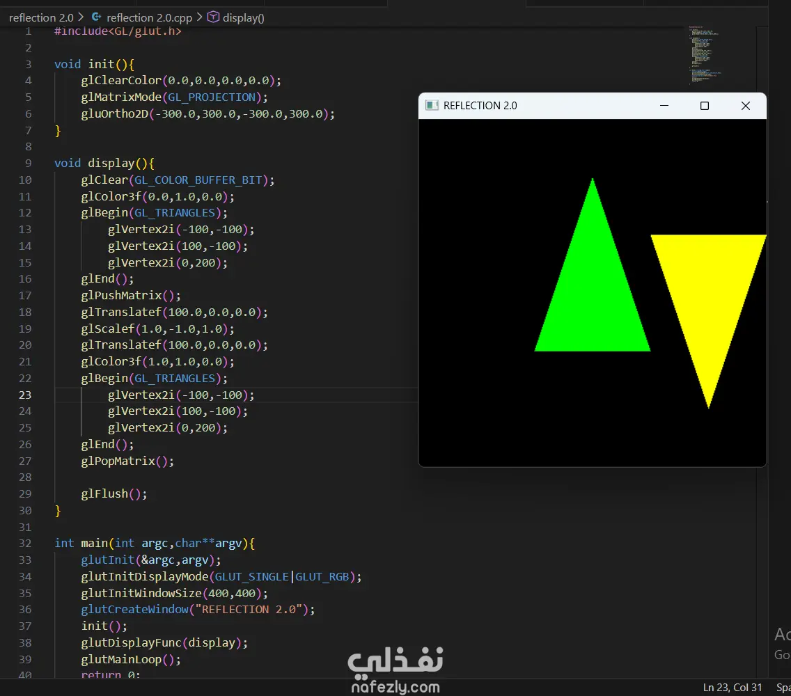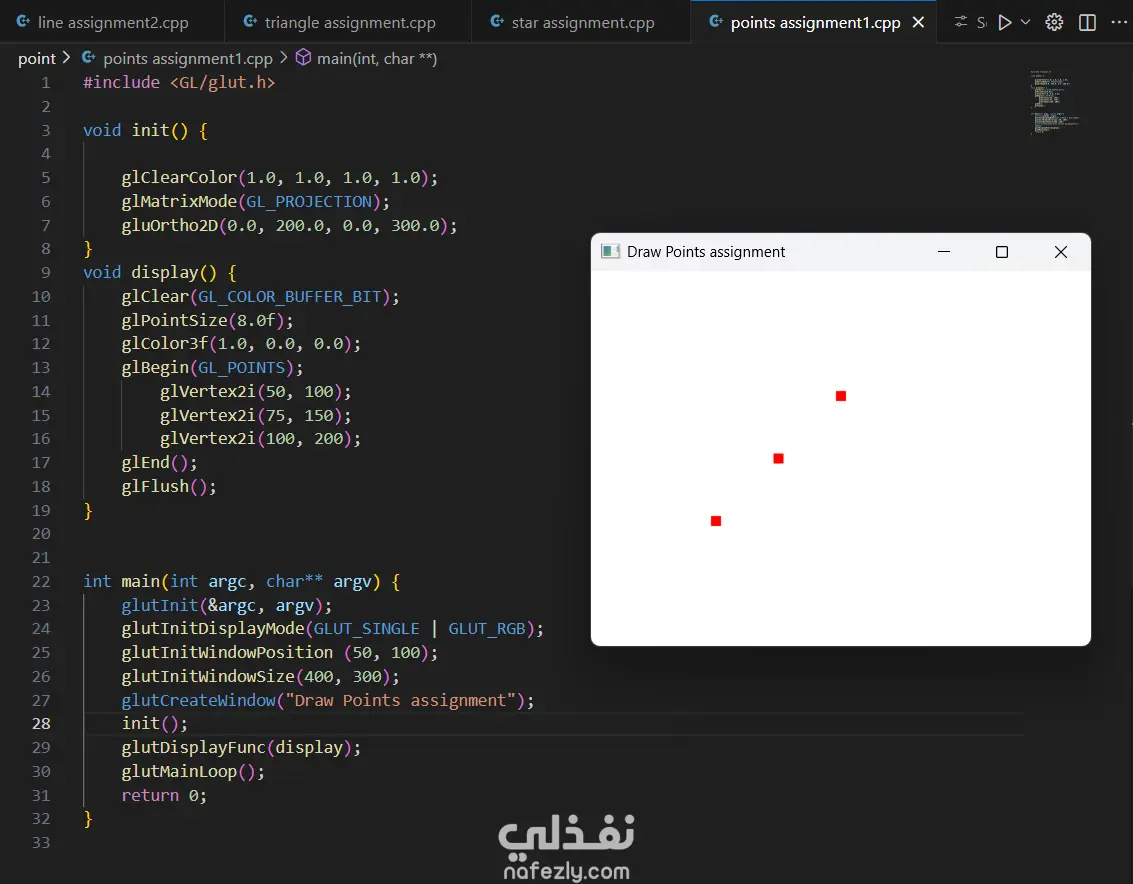 السلام عليكم ورحمة الله وبركاته، أقدم لكم هذا المشروع الذي يعرض خبرتي العملية في مجال **الرسوميات الحاسوبية (Computer Graphics)** باستخدام مكتبة OpenGL ولغة C++. يهدف المشروع إلى تطبيق المفاهيم الأساسية في الرسوميات الحاسوبية مثل رسم الأشكال الهندسية وتنفيذ التحويلات الثنائية والثلاثية الأبعاد. - آلية التنفيذ والعمل المنجز: -- إعداد بيئة العمل وبرمجة الرسوميات: بدأت المشروع باستخدام مكتبة **OpenGL** مع مكتبة **GLUT** لإنشاء نافذة رسومية تتيح عرض العناصر الهندسية ومعالجتها. تم إعداد بيئة الرسم باستخدام الدوال الأساسية مثل: * تهيئة نافذة العرض * تحديد نظام الإحداثيات * إدارة الـ Rendering Loop - رسم الأشكال الهندسية الأساسية: قمت بتنفيذ عدة برامج لرسم أشكال هندسية باستخدام OpenGL مثل: * رسم نقاط متعددة باستخدام `GL_POINTS` * رسم خطوط مستقيمة باستخدام `GL_LINES` * رسم مثلثات باستخدام `GL_TRIANGLES` * إنشاء أشكال مركبة مثل النجمة والأسهم والأشكال الهندسية المختلفة تم تحديد إحداثيات كل شكل باستخدام الدالة `glVertex` وتحديد الألوان باستخدام `glColor`. - تنفيذ التحويلات الثنائية الأبعاد (2D Transformations): كجزء من المشروع، قمت بتطبيق التحويلات الأساسية على الأشكال ثنائية الأبعاد مثل: * Translation (نقل الشكل من موقع لآخر) * Rotation (تدوير الشكل حول محور) * Scaling (تكبير أو تصغير الشكل) * Reflection (انعكاس الشكل) * Shearing (تشويه الشكل) تم تنفيذ هذه العمليات باستخدام الدوال الرسومية مثل `glTranslate`, `glRotate`, و `glScale`. -تنفيذ التحويلات ثلاثية الأبعاد (3D Transformations): قمت أيضًا بتطبيق نفس المفاهيم على مجسمات ثلاثية الأبعاد مثل **الهرم (Pyramid)**، حيث تم تنفيذ: * Translation ثلاثي الأبعاد * Rotation ثلاثي الأبعاد * Scaling ثلاثي الأبعاد * Reflection * Shearing مما يوضح كيفية التحكم في المجسمات داخل الفضاء ثلاثي الأبعاد. -تنظيم الكود والتطبيق العملي: تم تقسيم البرامج إلى ملفات منفصلة لكل نوع من العمليات، بحيث يوضح كل برنامج مفهومًا محددًا من مفاهيم الرسوميات الحاسوبية. - النتائج: نتج عن المشروع مجموعة من التطبيقات الرسومية التي توضح كيفية استخدام OpenGL لرسم الأشكال الهندسية وتنفيذ التحويلات المختلفة عليها. يبرز المشروع فهمي لأساسيات **Computer Graphics** وكيفية التعامل مع الإحداثيات والتحويلات في البيئات الرسومية. - المهارات والأدوات المستخدمة: * Computer Graphics Programming * OpenGL * GLUT Library * C++ Programming * 2D Transformations * 3D Transformations * Geometry Rendering