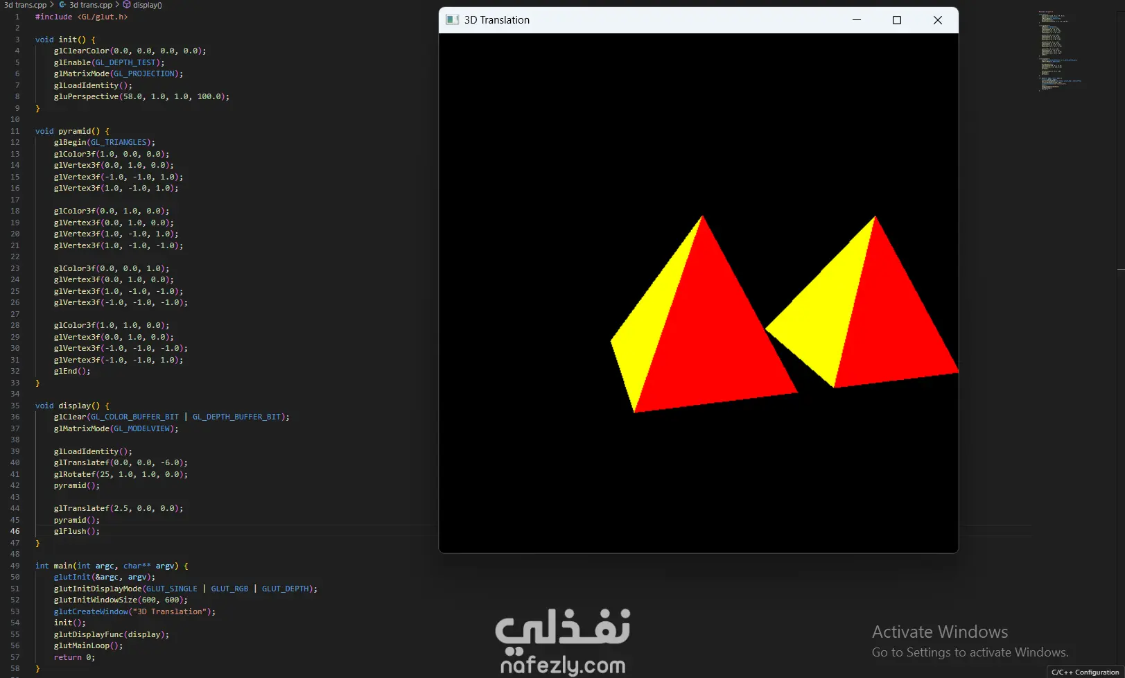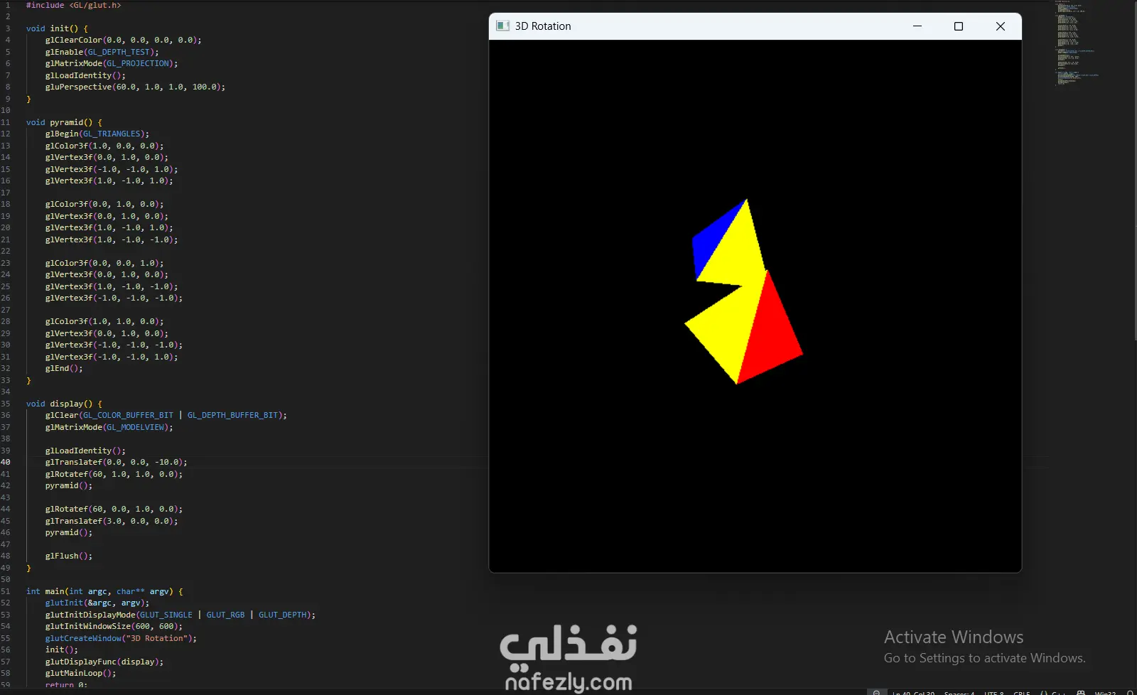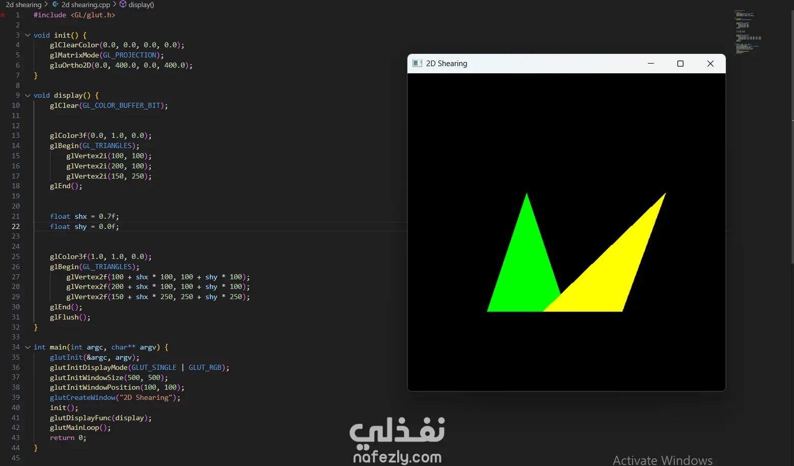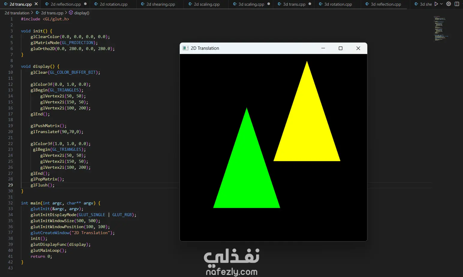السلام عليكم ورحمة الله وبركاته، أقدم لكم هذا المشروع الذي يعرض خبرتي العملية في مجال **الرسوميات الحاسوبية (Computer Graphics)** باستخدام مكتبة OpenGL ولغة C++. يهدف المشروع إلى تطبيق المفاهيم الأساسية في الرسوميات الحاسوبية مثل رسم الأشكال الهندسية وتنفيذ التحويلات الثنائية والثلاثية الأبعاد. - آلية التنفيذ والعمل المنجز: -- إعداد بيئة العمل وبرمجة الرسوميات: بدأت المشروع باستخدام مكتبة **OpenGL** مع مكتبة **GLUT** لإنشاء نافذة رسومية تتيح عرض العناصر الهندسية ومعالجتها. تم إعداد بيئة الرسم باستخدام الدوال الأساسية مثل: * تهيئة نافذة العرض * تحديد نظام الإحداثيات * إدارة الـ Rendering Loop - رسم الأشكال الهندسية الأساسية: قمت بتنفيذ عدة برامج لرسم أشكال هندسية باستخدام OpenGL مثل: * رسم نقاط متعددة باستخدام `GL_POINTS` * رسم خطوط مستقيمة باستخدام `GL_LINES` * رسم مثلثات باستخدام `GL_TRIANGLES` * إنشاء أشكال مركبة مثل النجمة والأسهم والأشكال الهندسية المختلفة تم تحديد إحداثيات كل شكل باستخدام الدالة `glVertex` وتحديد الألوان باستخدام `glColor`. - تنفيذ التحويلات الثنائية الأبعاد (2D Transformations): كجزء من المشروع، قمت بتطبيق التحويلات الأساسية على الأشكال ثنائية الأبعاد مثل: * Translation (نقل الشكل من موقع لآخر) * Rotation (تدوير الشكل حول محور) * Scaling (تكبير أو تصغير الشكل) * Reflection (انعكاس الشكل) * Shearing (تشويه الشكل) تم تنفيذ هذه العمليات باستخدام الدوال الرسومية مثل `glTranslate`, `glRotate`, و `glScale`. -تنفيذ التحويلات ثلاثية الأبعاد (3D Transformations): قمت أيضًا بتطبيق نفس المفاهيم على مجسمات ثلاثية الأبعاد مثل **الهرم (Pyramid)**، حيث تم تنفيذ: * Translation ثلاثي الأبعاد * Rotation ثلاثي الأبعاد * Scaling ثلاثي الأبعاد * Reflection * Shearing مما يوضح كيفية التحكم في المجسمات داخل الفضاء ثلاثي الأبعاد. -تنظيم الكود والتطبيق العملي: تم تقسيم البرامج إلى ملفات منفصلة لكل نوع من العمليات، بحيث يوضح كل برنامج مفهومًا محددًا من مفاهيم الرسوميات الحاسوبية. - النتائج: نتج عن المشروع مجموعة من التطبيقات الرسومية التي توضح كيفية استخدام OpenGL لرسم الأشكال الهندسية وتنفيذ التحويلات المختلفة عليها. يبرز المشروع فهمي لأساسيات **Computer Graphics** وكيفية التعامل مع الإحداثيات والتحويلات في البيئات الرسومية. - المهارات والأدوات المستخدمة: * Computer Graphics Programming * OpenGL * GLUT Library * C++ Programming * 2D Transformations * 3D Transformations * Geometry Rendering