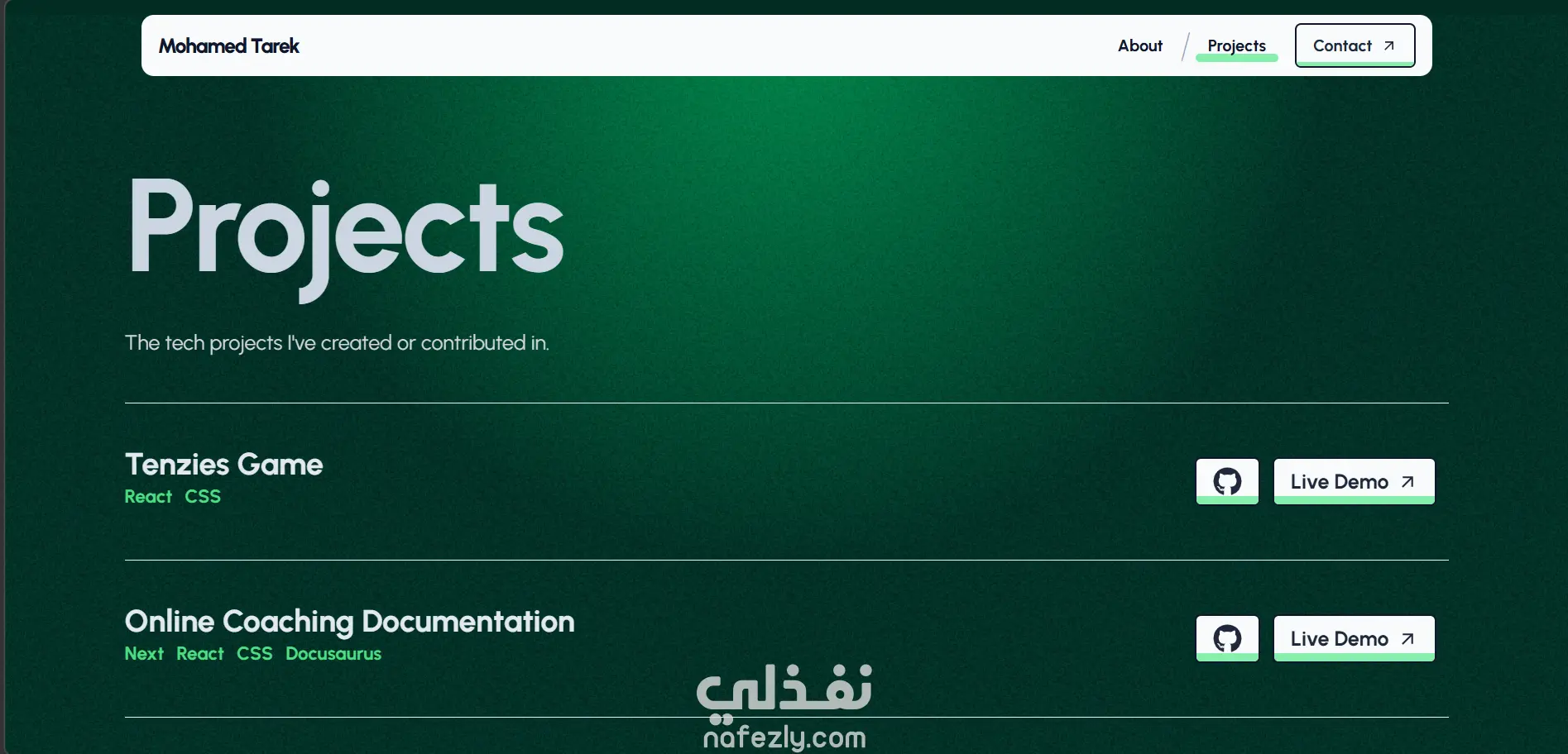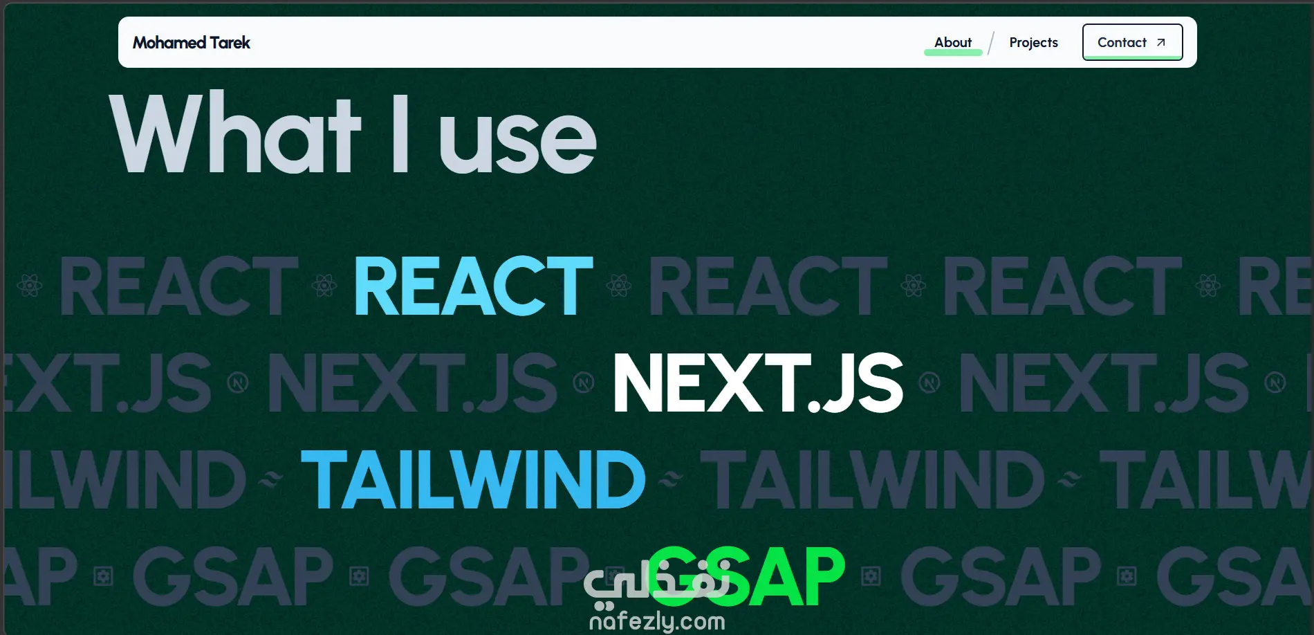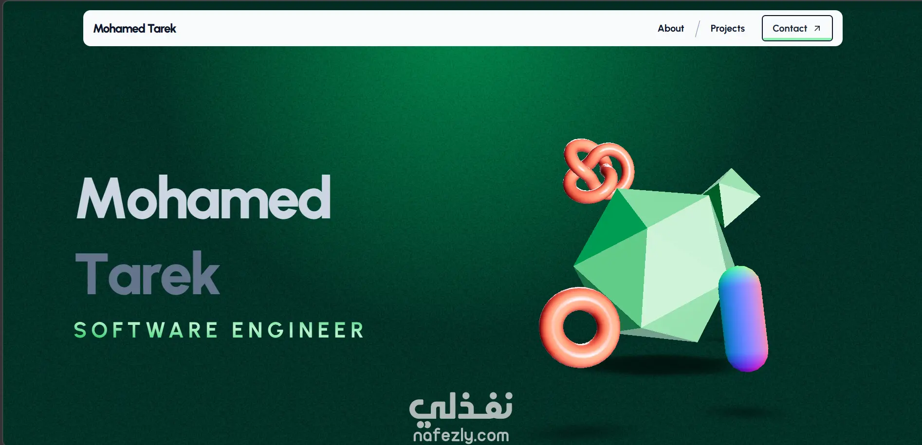 لقد كنت ببرمجة موقع شخصي من الصفر عن طريق: Nextjs حيث هي بيئة العمل الداعمة لـReact GSAP لعمل متحركات و animations بسيطة في الكتابة Three.js لعمل أشكال ثلاثية الأبعاد 3D تتحرك بشكل جذاب للمستخدم الموقع متكون من ثلاث صفح (الصفحة الرئيسية - معلومات عني - مشاريع سابقة) في الصفحة الرئيسية يوجد شكل جذاب مع اسم الشخص والمسمى الوظيفي الخاص به وفي قسم معلومات عني يوجد صورة الشخص ومعلومات أكثر عنه كخبرته السابقة ودراساته وأيضاً اللغات والتقنيات التي يستخدمها في عمله وأخيرًا قسم المشاريع السابقة يوجد جميع المشاريع السابقة ولكل مشروع التقنيات المستخدمه فيه وصوره عن المشروع وإمكانية رؤية الكود البرمجي أو التفاعل مع المشروع.