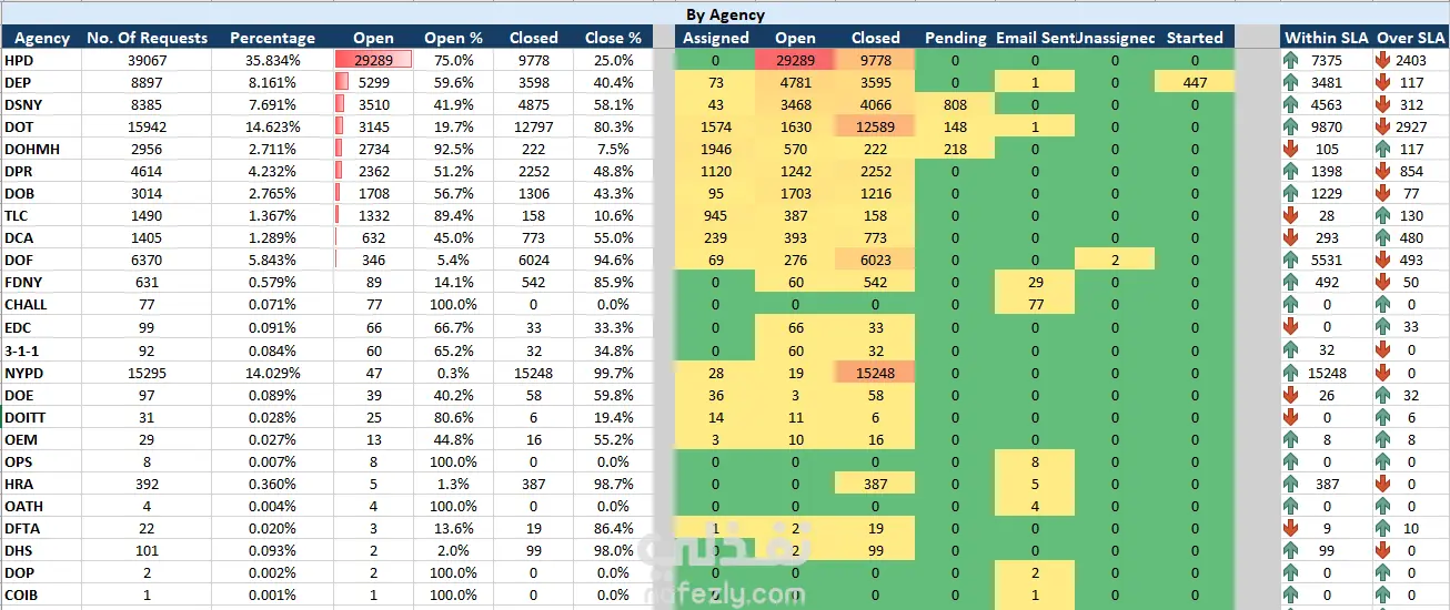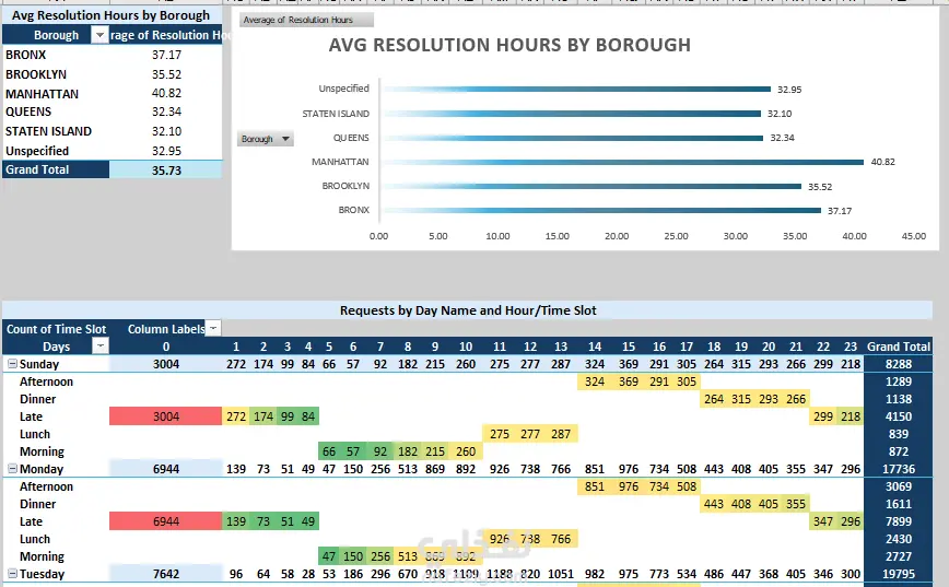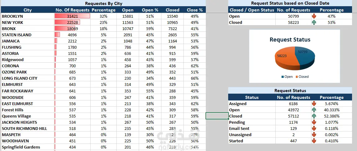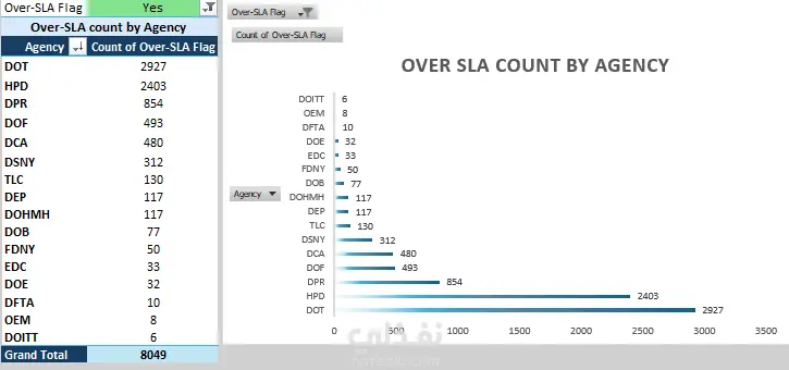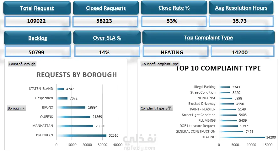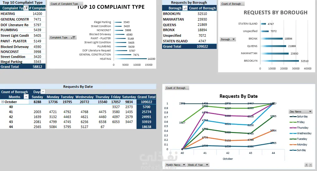 311 - Service Request هي خدمة عملاء مختصة بتلقي الشكاوى الخاصة بالضؤضاء. *تم تنظيف البيانات والتعامل مع المعلومات المفقودة والمكررة *تم أنشاء جداول محورية لمعرفة مدى تكرار كل شكوى، عدد الشكاوى في كل منطقة، ومعرفة عدد الشكاوى المقدمة لكل جهة *أنشاء الرسوم البيانية لكل جدول محوري *عمل داشبورد تحتوي على المؤشرات الأساسية "KPIs"