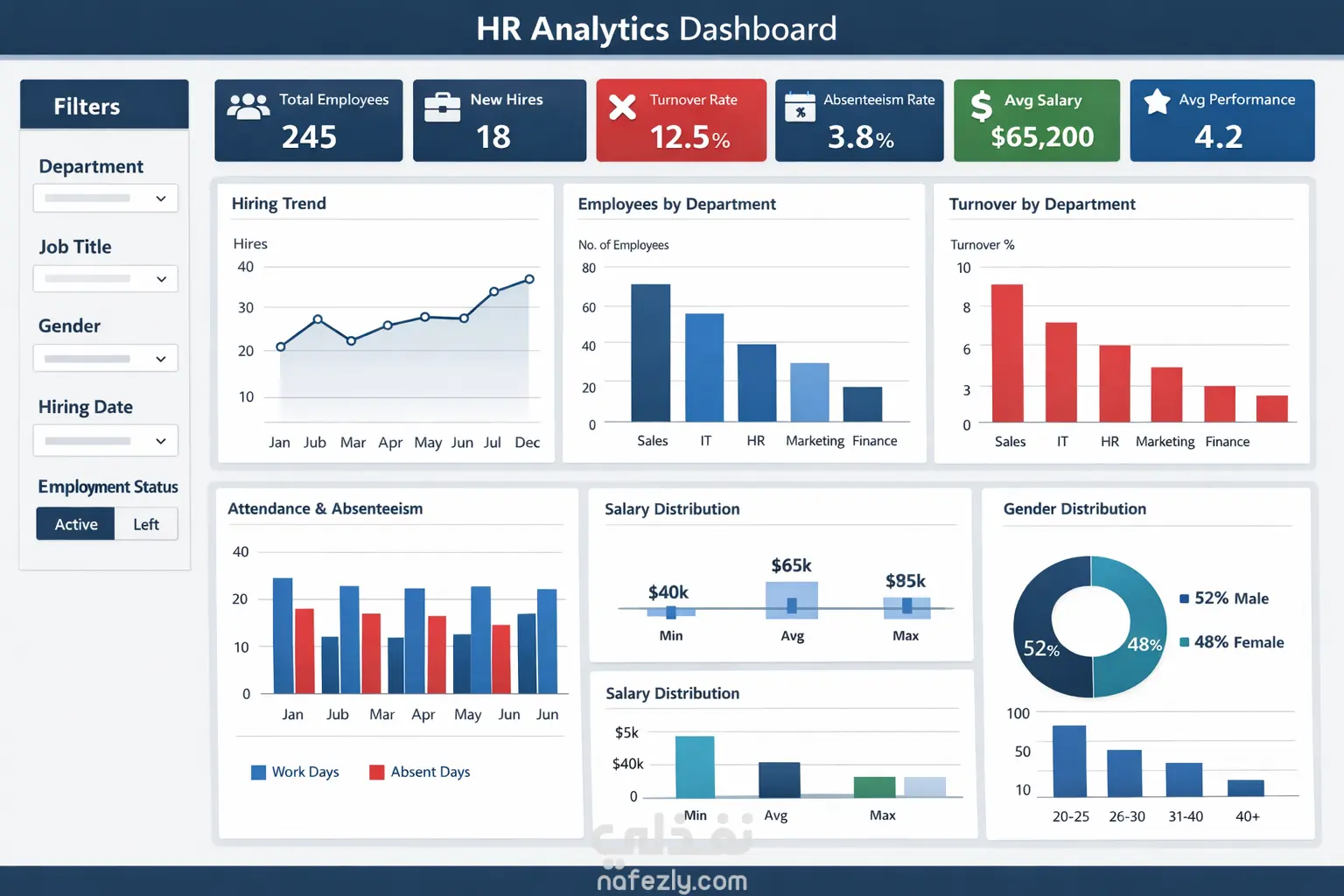 تحليل بيانات الموظفين HR وتحويلها إلى تقارير واضحة ورسوم بيانية احترافية تساعدك على فهم البيانات واتخاذ قرارات أفضل.