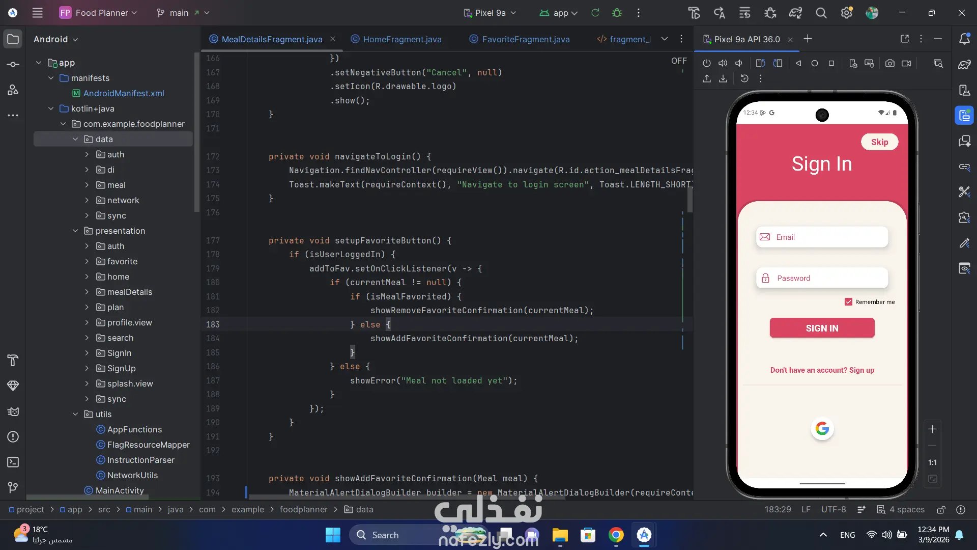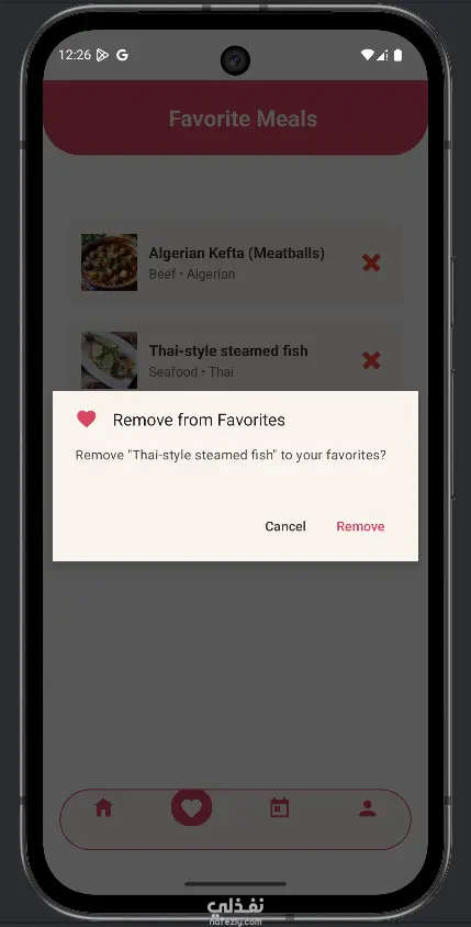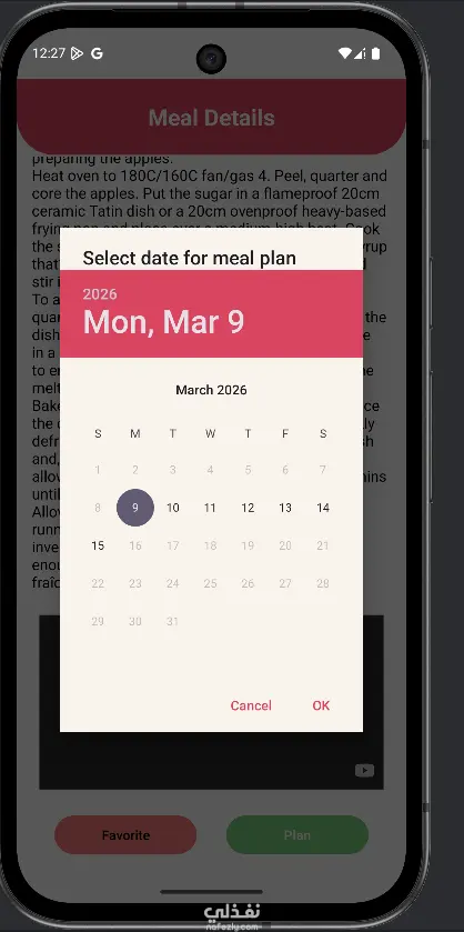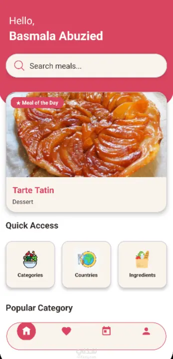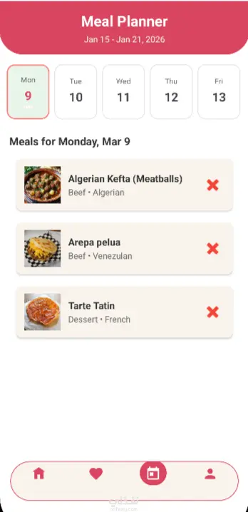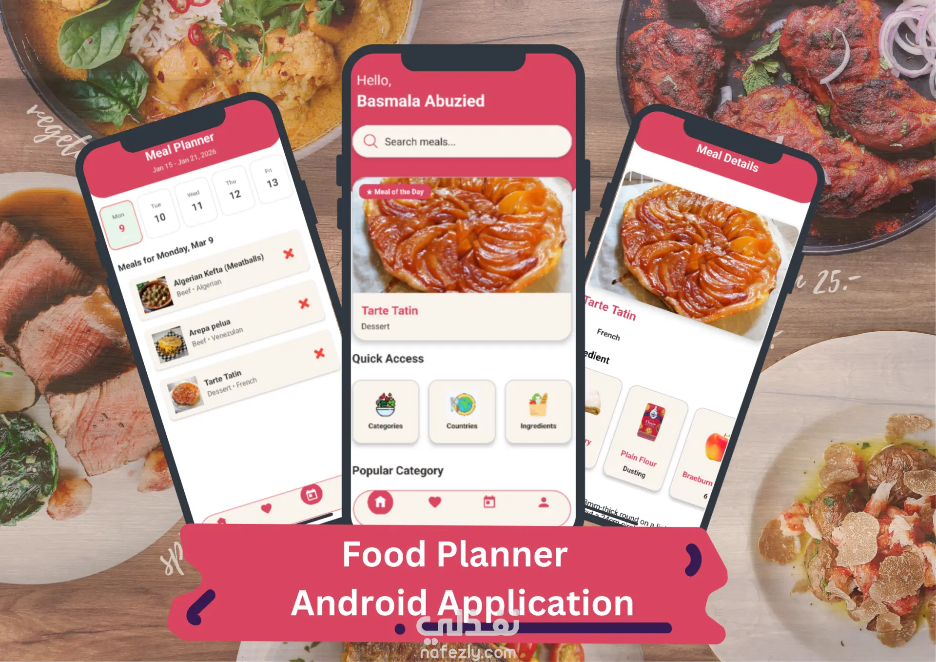الوصف: تطبيق أندرويد يساعد المستخدم على تخطيط وجباته الأسبوعية بسهولة، مع إمكانية استكشاف وصفات جديدة والبحث عنها حسب الدولة أو المكونات أو الفئة. يمكن للمستخدم حفظ الوجبات المفضلة والتخطيط لوجبات الأسبوع حتى بدون اتصال بالإنترنت. أهم المميزات: عرض وجبة اليوم لإلهام المستخدم بأفكار جديدة. البحث عن الوجبات حسب الدولة أو المكونات أو الفئة. عرض قائمة الفئات والدول لاكتشاف وصفات مختلفة. إمكانية إضافة الوجبات إلى المفضلة وحفظها محليًا. تخطيط وجبات الأسبوع وإدارتها داخل التطبيق. العمل بدون إنترنت لعرض الوجبات المفضلة وخطة الأسبوع. تسجيل الدخول والتسجيل باستخدام Firebase Authentication مع خيار الدخول كضيف. عرض تفاصيل الوجبة مثل: صورة الوجبة بلد المنشأ المكونات خطوات التحضير فيديو التحضير داخل التطبيق شاشة Splash Screen مع Animation (Lottie). التقنيات المستخدمة: Java Android SDK MVP Architecture RXJava Retrofit (REST API) Room Database Firebase Authentication SharedPreferences Material Design API المستخدم: Recipe API من TheMealDB