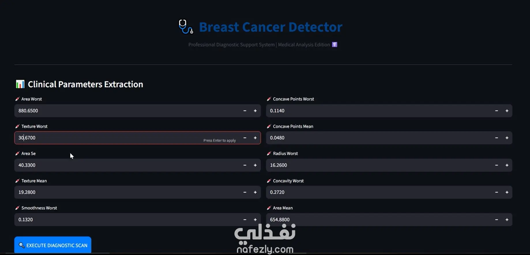 هذا المشروع هو عبارة عن نظام متكامل للذكاء الاصطناعي يهدف إلى المساعدة في التشخيص المبكر لسرطان الثدي (تصنيف الأورام إلى خبيثة أو حميدة). تم بناء المشروع ليكون أداة دقيقة تعتمد على البيانات السريرية لتقليل الأخطاء البشرية وتسريع عملية اتخاذ القرار الطبي. لقد قمت في هذا المشروع بالآتي: تحليل ومعالجة البيانات (Data Preprocessing): قمت بتنظيف البيانات والتأكد من خلوها من القيم المفقودة. استخدمت تقنية StandardScaler لتوحيد مقاييس الميزات (Features) لضمان استقرار أداء الخوارزميات. واجهت مشكلة عدم توازن البيانات (Imbalanced Data) وقمت بحلها باستخدام تقنية SMOTE لتوليد عينات اصطناعية للفئة الأقل، مما جعل النموذج أكثر عدلاً ودقة في توقع الحالات المصابة. هندسة النماذج والمقارنة (Model Engineering): قمت بتجربة واختبار مجموعة واسعة من الخوارزميات القوية مثل: (Logistic Regression, Random Forest, XGBoost, CatBoost). استخدمت تقنية GridSearchCV لضبط المعاملات (Hyperparameter Tuning) للوصول إلى أقصى كفاءة ممكنة لكل نموذج. تطوير النموذج النهائي: بعد المقارنة الدقيقة، تم اختيار نموذج AdaBoost كخوارزمية أساسية للمشروع نظراً لتفوقها في الربط بين المصنفات الضعيفة لتكوين نموذج تنبؤ قوي ودقيق. النتائج التي تحققت: الدقة (Accuracy): حقق المشروع نسبة دقة عالية جداً، مما يجعله موثوقاً في تصنيف الحالات. تقليل المخاطر (False Negatives): نجحت في الوصول بالنموذج إلى أقل معدل ممكن من "السلبيات الكاذبة"، وهو أمر حيوي في المجال الطبي لضمان عدم تشخيص شخص مصاب على أنه سليم. تحليل العوامل المؤثرة: استخرجت أهم الميزات (Feature Importance) التي تؤثر في التشخيص، مما يساعد الأطباء على فهم العوامل السريرية الأكثر حرجاً. المخرجات النهائية: قمت بحفظ النموذج النهائي (breast_cancer_adaboost_final.pkl) وملف التقييس (scaler.pkl) ليكون المشروع جاهزاً للدمج المباشر في تطبيقات الويب أو الأنظمة الطبية البرمجية.