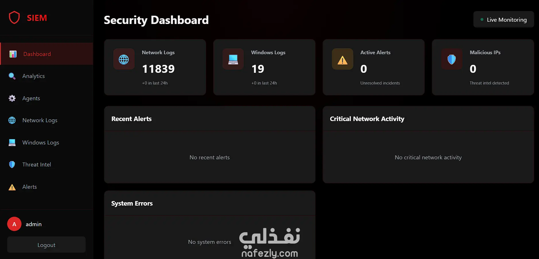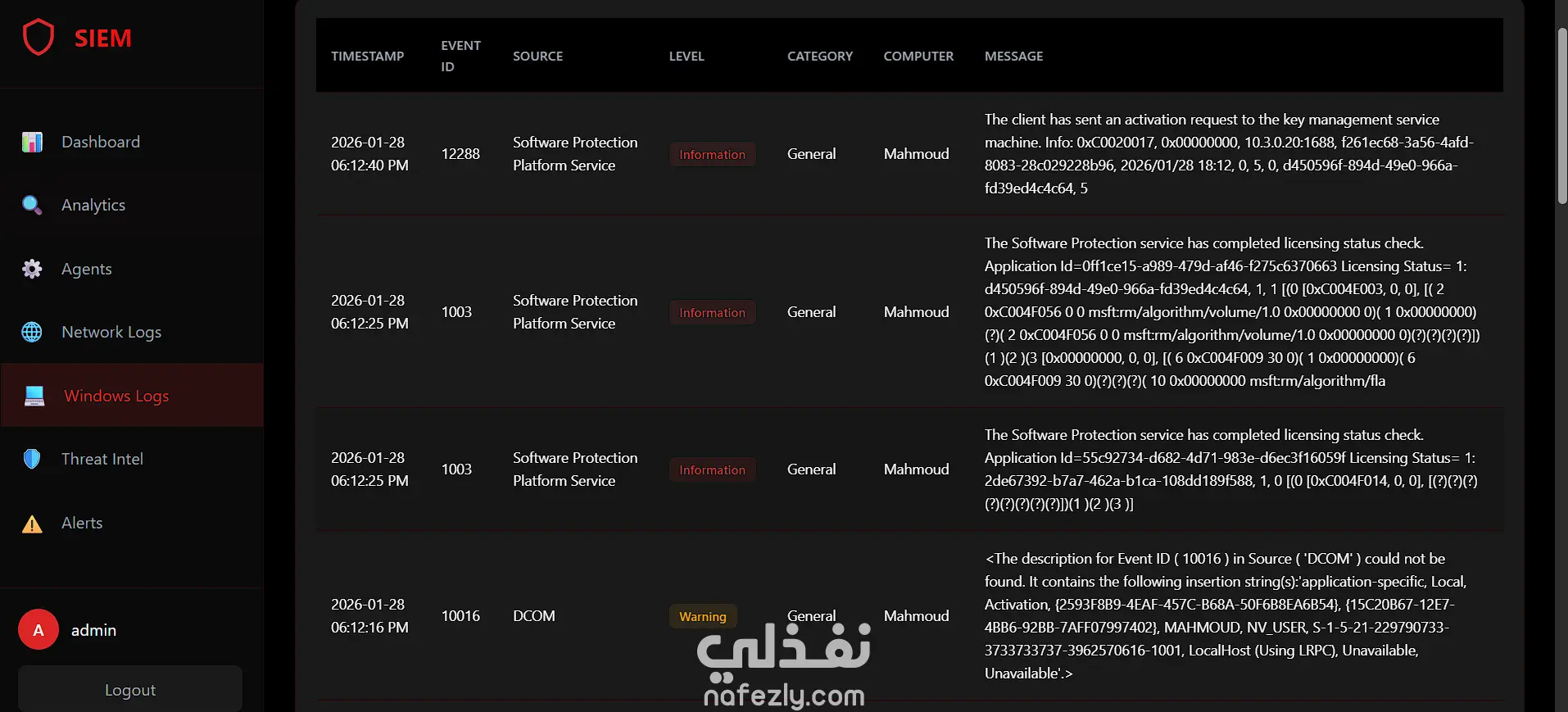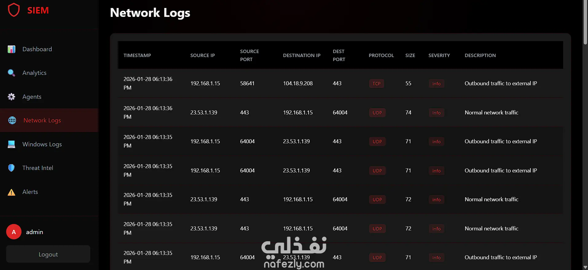 SIEM System – Security Monitoring Platform مشروع SIEM System (Security Information and Event Management) هو نظام متكامل لمراقبة وتحليل أحداث الأمن السيبراني داخل الشبكات والأنظمة. يهدف النظام إلى جمع وتحليل البيانات الأمنية من مصادر متعددة مثل حركة الشبكة وسجلات نظام Windows، ثم تحويلها إلى تنبيهات أمنية تساعد محللي الأمن في اكتشاف التهديدات بسرعة والاستجابة لها. يعتمد النظام على مجموعة من الأدوات والتقنيات مثل Python، Flask، Scapy، وSQLite لبناء لوحة تحكم تفاعلية تعرض البيانات الأمنية في الوقت الحقيقي. أهداف المشروع مراقبة حركة الشبكة واكتشاف الأنشطة المشبوهة. تحليل سجلات نظام Windows واكتشاف الأحداث الأمنية المهمة. جمع البيانات من عدة مصادر وتحليلها في مكان واحد. إنشاء تنبيهات أمنية تلقائية عند اكتشاف تهديدات محتملة. توفير لوحة تحكم مرئية لمتابعة حالة النظام والأحداث الأمنية. مكونات النظام يتكون النظام من عدة أجزاء رئيسية: 1. Dashboard (لوحة التحكم) تم تطويرها باستخدام Flask وتوفر: تسجيل دخول آمن للمستخدمين. عرض إحصائيات عن الأحداث الأمنية. عرض التنبيهات الأخيرة. تحليل بيانات الشبكة وسجلات النظام. 2. Network Agent يقوم بمراقبة حركة الشبكة باستخدام مكتبة Scapy ويجمع معلومات مثل: عنوان IP المصدر والوجهة المنافذ المستخدمة البروتوكولات الأنشطة المشبوهة مثل Port Scanning 3. Windows Agent يقوم بجمع وتحليل سجلات نظام Windows مثل: Security Logs System Logs Application Logs ويكشف أحداثاً أمنية مثل: محاولات تسجيل الدخول الفاشلة إنشاء حسابات مستخدمين جديدة تثبيت خدمات جديدة 4. Threat Intelligence Module يقوم بفحص عناوين IP المشبوهة باستخدام قواعد بيانات تهديدات خارجية لتحديد ما إذا كانت مرتبطة بأنشطة ضارة. الميزات الرئيسية مراقبة الشبكة في الوقت الحقيقي تحليل سجلات Windows إنشاء تنبيهات أمنية تلقائية لوحة تحكم تفاعلية قاعدة بيانات لتخزين الأحداث الأمنية تصنيف التنبيهات حسب مستوى الخطورة التقنيات المستخدمة Python Flask Scapy SQLite HTML / CSS / JavaScript pywin32 أهمية المشروع يساعد هذا المشروع في فهم كيفية عمل أنظمة SIEM المستخدمة في مراكز عمليات الأمن (SOC)، ويعطي تجربة عملية في: جمع وتحليل السجلات الأمنية اكتشاف التهديدات بناء أدوات مراقبة أمنية
