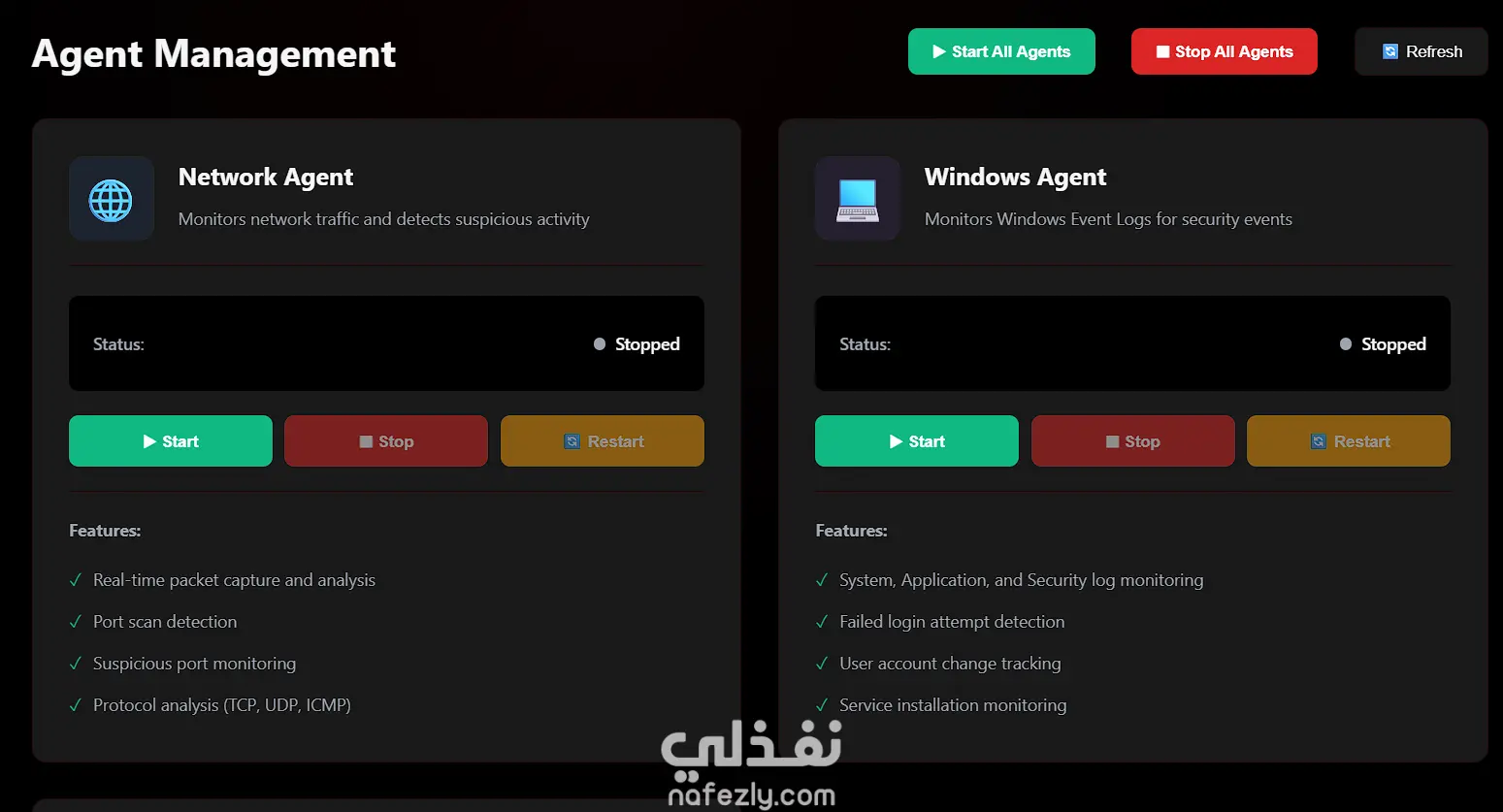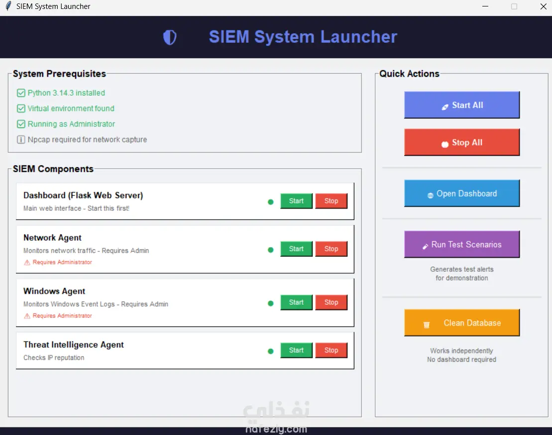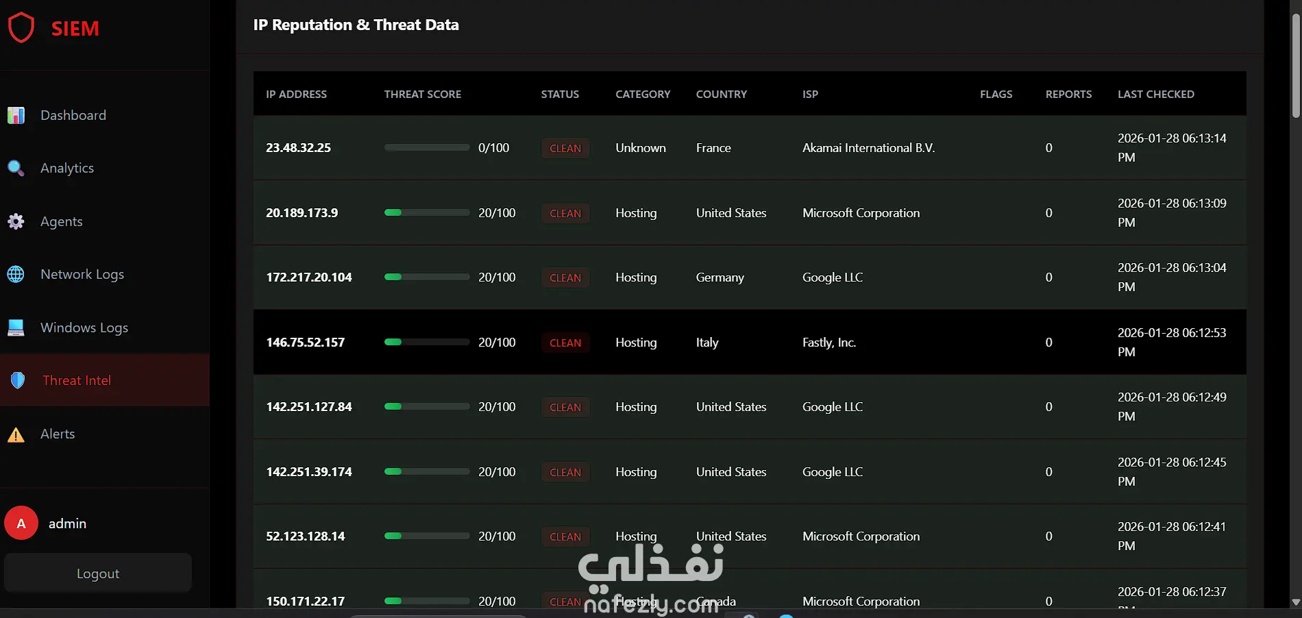 SIEM System – Security Monitoring Platform مشروع SIEM System (Security Information and Event Management) هو نظام متكامل لمراقبة وتحليل أحداث الأمن السيبراني داخل الشبكات والأنظمة. يهدف النظام إلى جمع وتحليل البيانات الأمنية من مصادر متعددة مثل حركة الشبكة وسجلات نظام Windows، ثم تحويلها إلى تنبيهات أمنية تساعد محللي الأمن في اكتشاف التهديدات بسرعة والاستجابة لها. يعتمد النظام على مجموعة من الأدوات والتقنيات مثل Python، Flask، Scapy، وSQLite لبناء لوحة تحكم تفاعلية تعرض البيانات الأمنية في الوقت الحقيقي. أهداف المشروع مراقبة حركة الشبكة واكتشاف الأنشطة المشبوهة. تحليل سجلات نظام Windows واكتشاف الأحداث الأمنية المهمة. جمع البيانات من عدة مصادر وتحليلها في مكان واحد. إنشاء تنبيهات أمنية تلقائية عند اكتشاف تهديدات محتملة. توفير لوحة تحكم مرئية لمتابعة حالة النظام والأحداث الأمنية. مكونات النظام يتكون النظام من عدة أجزاء رئيسية: 1. Dashboard (لوحة التحكم) تم تطويرها باستخدام Flask وتوفر: تسجيل دخول آمن للمستخدمين. عرض إحصائيات عن الأحداث الأمنية. عرض التنبيهات الأخيرة. تحليل بيانات الشبكة وسجلات النظام. 2. Network Agent يقوم بمراقبة حركة الشبكة باستخدام مكتبة Scapy ويجمع معلومات مثل: عنوان IP المصدر والوجهة المنافذ المستخدمة البروتوكولات الأنشطة المشبوهة مثل Port Scanning 3. Windows Agent يقوم بجمع وتحليل سجلات نظام Windows مثل: Security Logs System Logs Application Logs ويكشف أحداثاً أمنية مثل: محاولات تسجيل الدخول الفاشلة إنشاء حسابات مستخدمين جديدة تثبيت خدمات جديدة 4. Threat Intelligence Module يقوم بفحص عناوين IP المشبوهة باستخدام قواعد بيانات تهديدات خارجية لتحديد ما إذا كانت مرتبطة بأنشطة ضارة. الميزات الرئيسية مراقبة الشبكة في الوقت الحقيقي تحليل سجلات Windows إنشاء تنبيهات أمنية تلقائية لوحة تحكم تفاعلية قاعدة بيانات لتخزين الأحداث الأمنية تصنيف التنبيهات حسب مستوى الخطورة التقنيات المستخدمة Python Flask Scapy SQLite HTML / CSS / JavaScript pywin32 أهمية المشروع يساعد هذا المشروع في فهم كيفية عمل أنظمة SIEM المستخدمة في مراكز عمليات الأمن (SOC)، ويعطي تجربة عملية في: جمع وتحليل السجلات الأمنية اكتشاف التهديدات بناء أدوات مراقبة أمنية