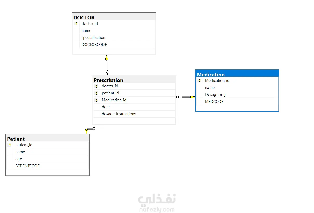 Relational Database) متكاملة تهدف إلى تنظيم عملية إدارة الوصفات الطبية بين الأطباء والمرضى والأدوية. المشروع يركز على كفاءة تخزين البيانات وضمان تكاملها (Data Integrity) من خلال علاقات منطقية مدروسة. ما قمت بتنفيذه في هذا المشروع: • تحليل البيانات (Data Analysis): تحديد الكيانات الأساسية (Doctor, Patient, Medication) والسمات الخاصة بكل منها. • هيكلة العلاقات (Relationships): بناء علاقات متينة (One-to-Many) لربط الأطباء والمرضى بجداول الروشتات (Prescriptions). • ضمان سلامة البيانات: تعيين المفاتيح الأساسية (Primary Keys) والمفاتيح الخارجية (Foreign Keys) بدقة لمنع التكرار وضمان الترابط الشامل. • Normalization: التأكد من أن قاعدة البيانات تتبع معايير التقسيم المنطقي لتقليل مساحة التخزين وزيادة سرعة الاستعلامات.