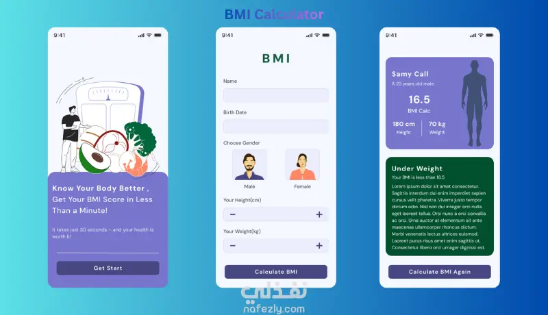 يقوم التطبيق باستقبال بيانات المستخدم مثل العمر والطول والوزن ثم يقوم بحساب مؤشر كتلة الجسم وعرض النتيجة مع توضيح الحالة الصحية مثل (نحافة، وزن طبيعي، زيادة في الوزن أو سمنة).
