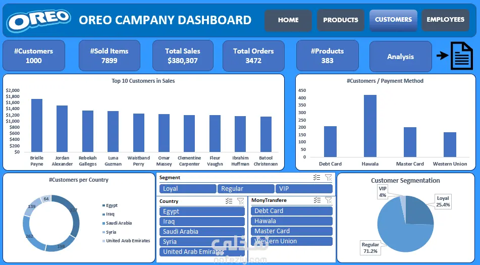 OREO Company Interactive Dashboard System قمت بتصميم وتنفيذ نظام لوحات معلومات تفاعلي متكامل لتحليل أداء شركة OREO، يهدف إلى تقديم رؤية شاملة عن أداء المبيعات، العملاء، المنتجات، والموظفين في مكان واحد بطريقة احترافية وسهلة الاستخدام. يتكون المشروع من عدة صفحات تحليلية مترابطة (Home – Products – Customers – Employees – Analysis)، مما يسمح للإدارة بالتنقل بين أقسام الشركة وتحليل الأداء من زوايا مختلفة خلال ثوانٍ. ما يقدمه النظام: عرض شامل لأهم المؤشرات مثل إجمالي المبيعات، عدد العملاء، عدد الطلبات، الكميات المباعة، وعدد الموظفين. تحليل المبيعات حسب الشهر، الدولة، والمنتج لتحديد أفضل الأسواق وأقوى المنتجات. دراسة سلوك العملاء وطرق الدفع المفضلة وأنماط الشراء. تقسيم العملاء (Segmentation) لفهم الفئات الأكثر قيمة. تحليل أداء الموظفين والرواتب وعدد الطلبات المنجزة لكل موظف. فلاتر تفاعلية (سنة – ربع سنوي – دولة – حالة الطلب) تتيح استكشاف البيانات بسهولة ودقة. تصميم احترافي يركز على وضوح الأرقام وسهولة القراءة وسرعة الوصول للمعلومة. تم تنفيذ المشروع باستخدام: Excel – Pivot Tables – Power Query – Power Pivot – Data Modeling – Dashboards Design الهدف من المشروع: توفير أداة تحليل ذكية تساعد الإدارة في: متابعة الأداء العام للشركة تحديد المنتجات الأعلى مبيعًا تحليل سلوك العملاء تقييم أداء الموظفين دعم اتخاذ القرار بناءً على بيانات دقيقة هذا المشروع يعكس قدرتي على بناء نظام تحليلي متكامل وليس مجرد تقرير تقليدي، مع التركيز على تجربة المستخدم، دقة النتائج، وقابلية التوسع.
