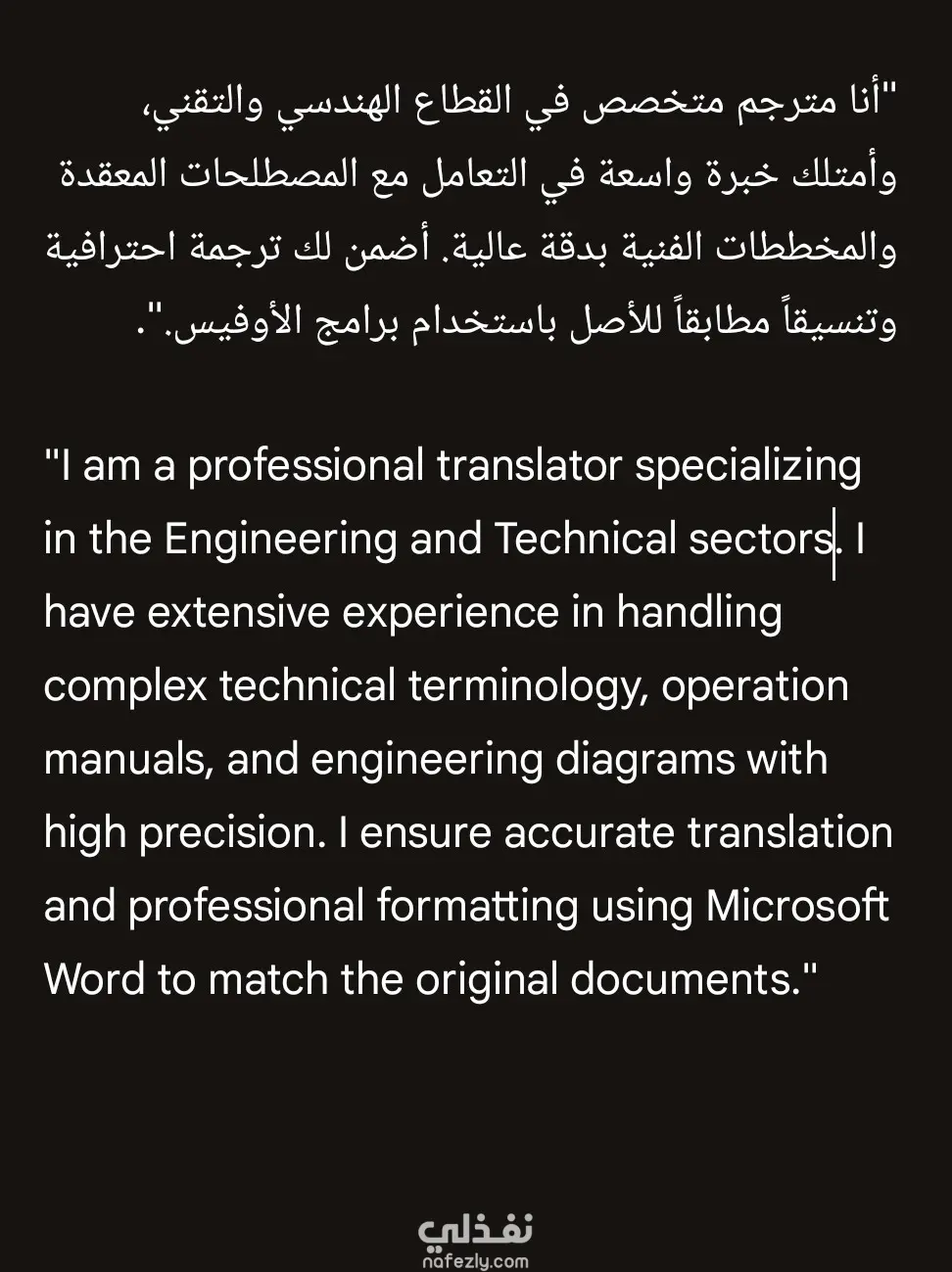 "قمت في هذا العمل بترجمة نص تقني متخصص من اللغة الإنجليزية إلى العربية، مع التركيز على دقة المصطلحات الهندسية وضمان صياغة لغوية سليمة. شمل العمل أيضاً تنسيق الملف بالكامل باستخدام برنامج Microsoft Word ليطابق الملف الأصلي."