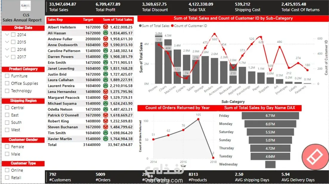 عرض لوحة القيادة "تقرير المبيعات السنوي لشركة CLS" تحليلاً بيانياً شاملاً لأداء الأعمال، وتلخص البيانات في المحاور التالية: 1. الأداء المالي العام (KPIs): حققت الشركة إجمالي مبيعات يتجاوز 33.9 مليون، بصافي أرباح يبلغ 6.7 مليون. وتظهر البيانات تكاليف تشغيلية تشمل 539 ألف للشحن، و2.4 مليون كخسائر ناتجة عن المرتجعات، مع تقديم خصومات إجمالية بقيمة 3.3 مليون. 2. تحليل المبيعات والعملاء: المبيعات حسب الفئة: تتصدر "الهواتف" و"الكراسي" قائمة المبيعات من حيث القيمة، بينما يظهر الرسم البياني تبايناً في عدد العملاء لكل فئة فرعية. أداء المندوبين: يبرز الجدول كفاءة فريق المبيعات (مثل Caroline Patterson وLaurent Pereira) في تحقيق وتجاوز الأهداف البيعية المحددة لهم. التوزيع الزمني: يمثل يوم الجمعة ذروة النشاط البيعي بـ 6.71 مليون، يليه يوم الاثنين، بينما تنخفض المبيعات تدريجياً خلال بقية الأسبوع. 3. العمليات اللوجستية والمرتجعات: تشير البيانات إلى كفاءة لوجستية بمتوسط 2.5 يوم للشحن و 5.94 يوم للتسليم. يُظهر مؤشر المرتجعات تذبذباً زمنياً، حيث وصل لأقصى مستوياته في عام 2017 (بواقع 105 مرتجع) قبل أن ينخفض بشكل حاد في 2018. 4. إحصائيات عامة وفلاتر التحكم: تخدم الشركة قاعدة عملاء تضم 792 عميلاً قاموا بـ 5009 طلبيات على 8313 منتجاً. وتوفر اللوحة مرونة عالية عبر فلاتر متقدمة تتيح فرز البيانات حسب السنة (2014-2017)، المنطقة الجغرافية، نوع العميل (Online/Retail)، والجنس.