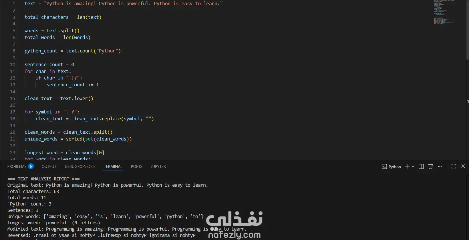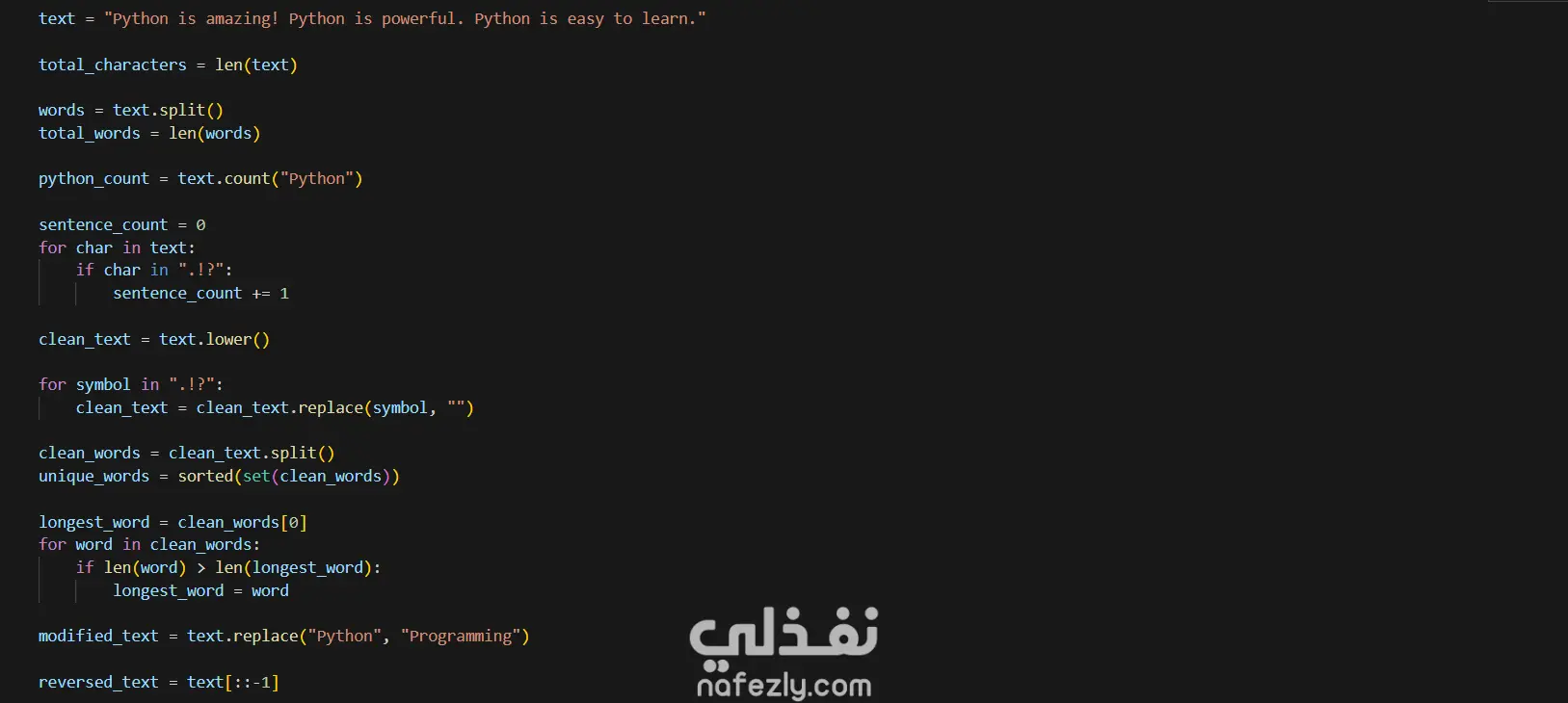 قمت بعمل برنامج لتحليل النصوص باستخدام لغة Python، حيث يقوم البرنامج بتنفيذ مجموعة من عمليات المعالجة والتحليل على نص معين لاستخراج معلومات إحصائية وتحويلات نصية مختلفة.