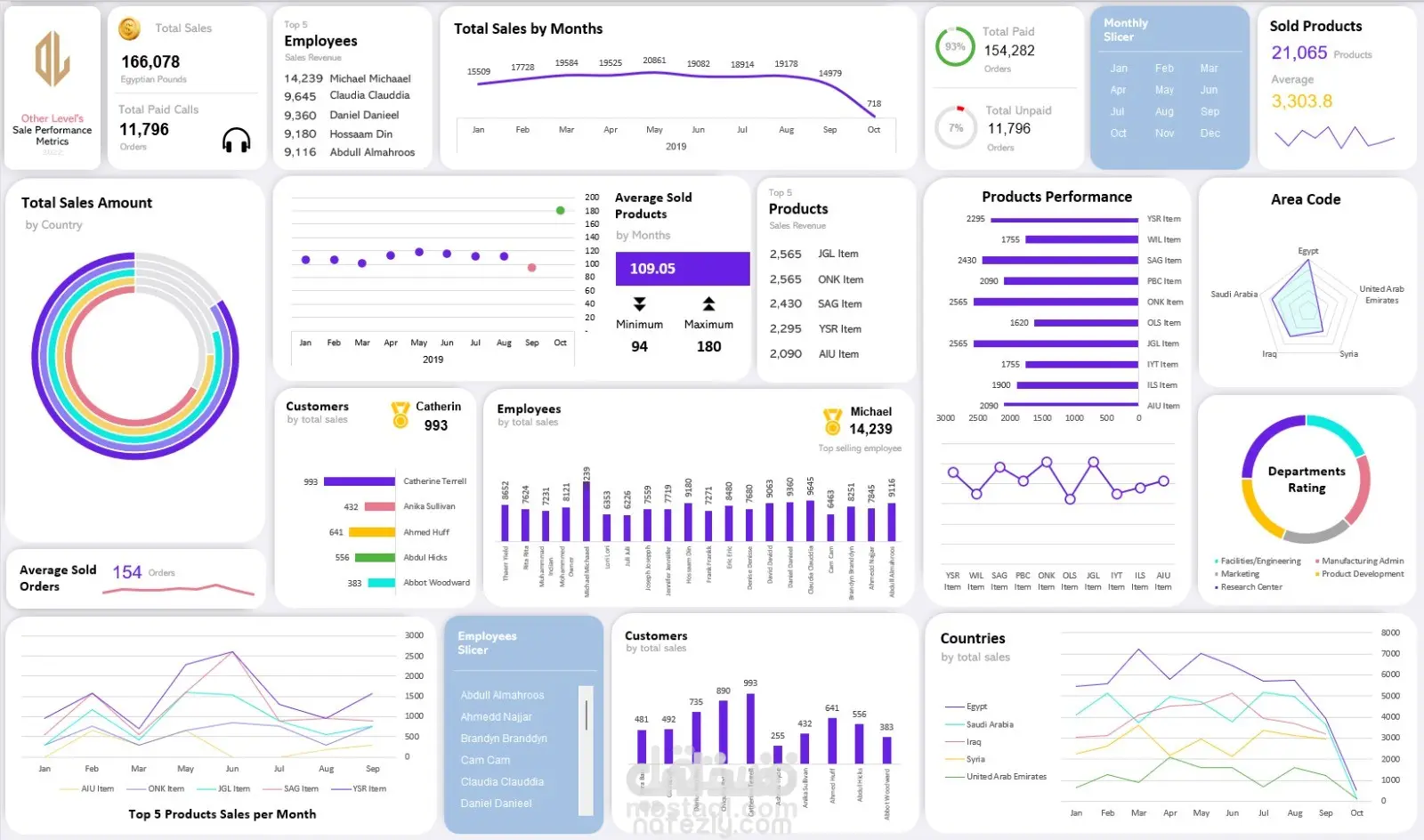 يتضمن الداشبورد عرض إجمالي المبيعات، المدفوع وغير المدفوع، عدد المنتجات المباعة، ومتوسط الطلبات، بالإضافة إلى تحليل شهري يوضح اتجاهات النمو والتراجع. كما يوفر مقارنة أداء الموظفين وتحديد الأعلى تحقيقًا للمبيعات، مع تحليل أفضل المنتجات من حيث الإيرادات والكميات.