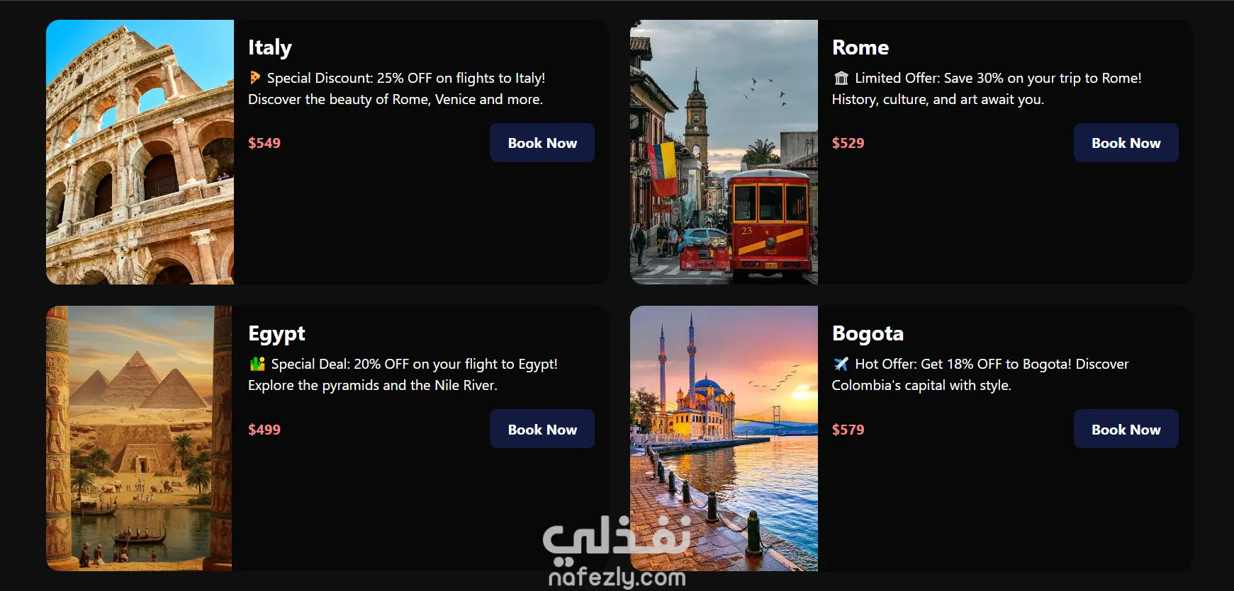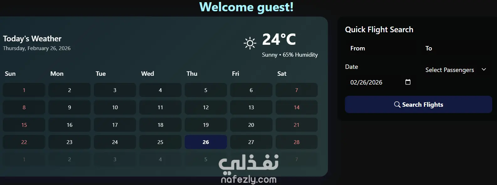 موقع تفاعلي لتجربة حجز رحلات الطيران مصمم بواجهة مستخدم بسيطة وحديثة باستخدام HTML/CSS/JavaScript، مع واجهة front-end جذابة تتيح للمستخدمين البحث والاطلاع على عروض السفر وحجز رحلاتهم بسهولة. المزايا الأساسية للمشروع: واجهة سهلة الاستخدام: تصميم جذاب ومنظم يساعد المستخدم في التنقل بين صفحات الموقع بدون تعقيد. شريط بحث سريع للرحلات: يتيح للمستخدمين تحديد تاريخ السفر وعدد الركاب للبحث عن الرحلات المناسبة. عروض وخصومات: يعرض الموقع عروض خاصة لوجهات سياحية (مثل باريس، تركيا، إيطاليا، مصر… ) مع أسعار وتخفيضات واضحة. صفحات رئيسية مركزة: يحتوي على أقسام مثل الرئيسية، الحجز، من نحن، اتصل بنا لتجربة مستخدم كاملة. تصميم متجاوب: يعمل بشكل جيد على الشاشات المختلفة (كمبيوتر، تابلت، موبايل). محتوى تفاعلي: يعرض الموقع أحوال الطقس اليومية، رحلات مميزة، وصور لوجهات السفر لجذب المستخدم.