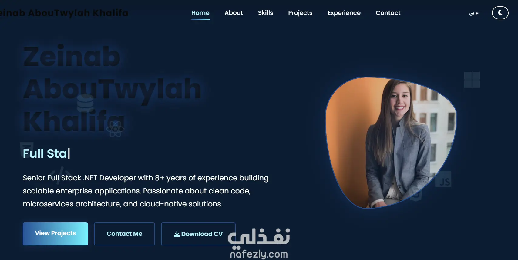 موقع بورتفوليو شخصي احترافي يعرض مهاراتي وخبراتي كمطوّرة ويب، مصمم بواجهة عصرية ومتجاوبة باستخدام HTML, CSS, JavaScript ليوفر تجربة مستخدم سلسة على جميع الأجهزة.