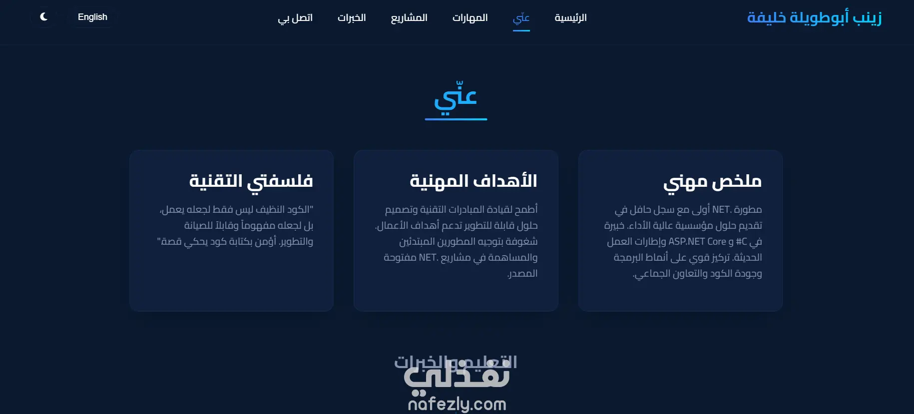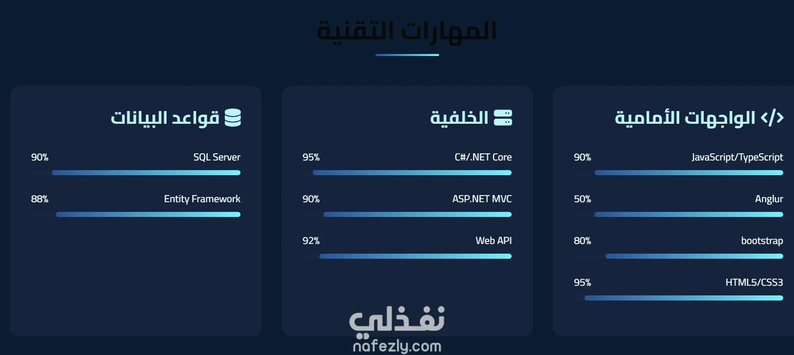 • قسم المهارات (Skills) يعرض التقنيات التي أعمل بها مثل Front-End و Back-End.