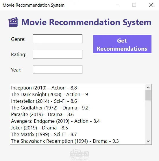 تطبيق توصية أفلام بواجهة رسومية يتيح للمستخدم الحصول على اقتراحات أفلام بناءً على تفضيلاته مثل النوع (Genre)، التقييم (Rating)، وسنة الإصدار (Year).
