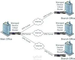 المكونات: 2 راوتر (Cisco ISR)، 2 سويتش، وجهاز كمبيوتر في كل فرع. الشرح التقني: إعداد بروتوكولات التوجيه (مثل OSPF) لضمان وصول الفروع لبعضها. تطبيق تقنية IPSec VPN لتشفير البيانات المارة عبر الإنترنت العام بين الراوترين.