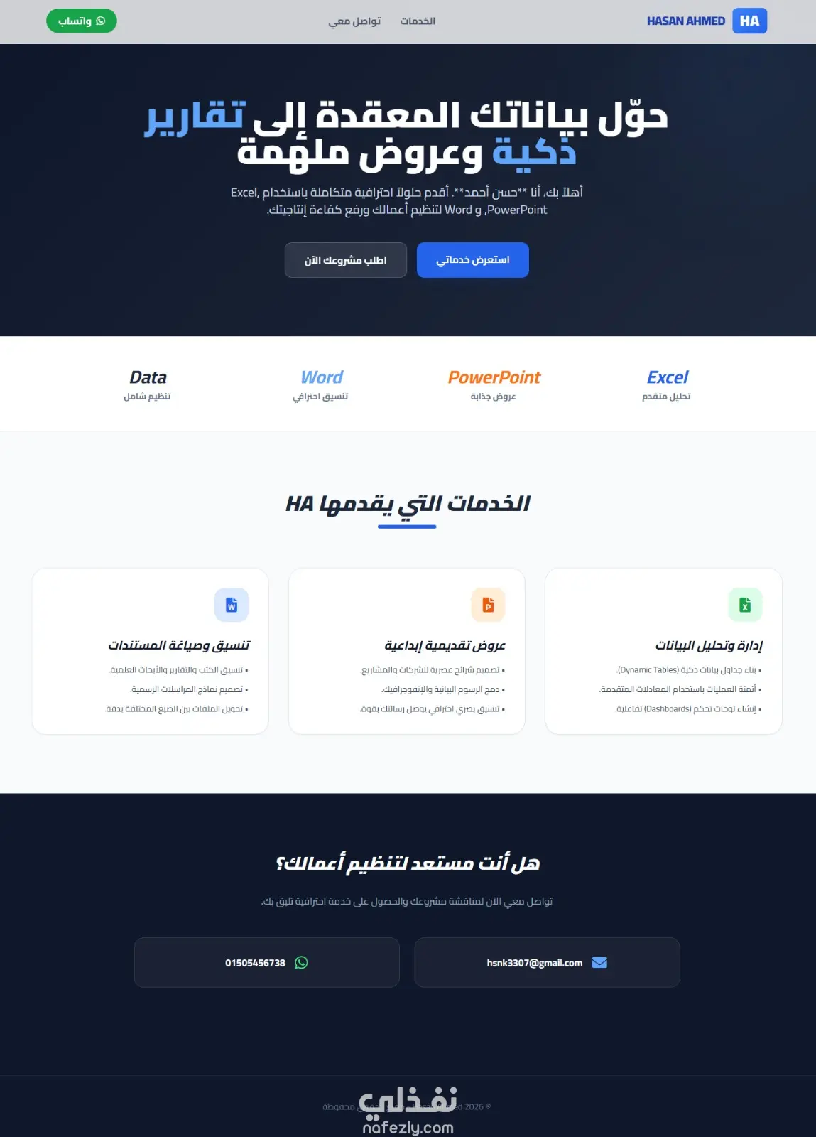 قمت بتصميم وتطوير صفحة هبوط احترافية لشخص متخصص في خدمات الأوفيس والإدارة، بهدف عرض الخدمات بطريقة منظمة وجذابة وتحويل الزوار إلى عملاء محتملين.